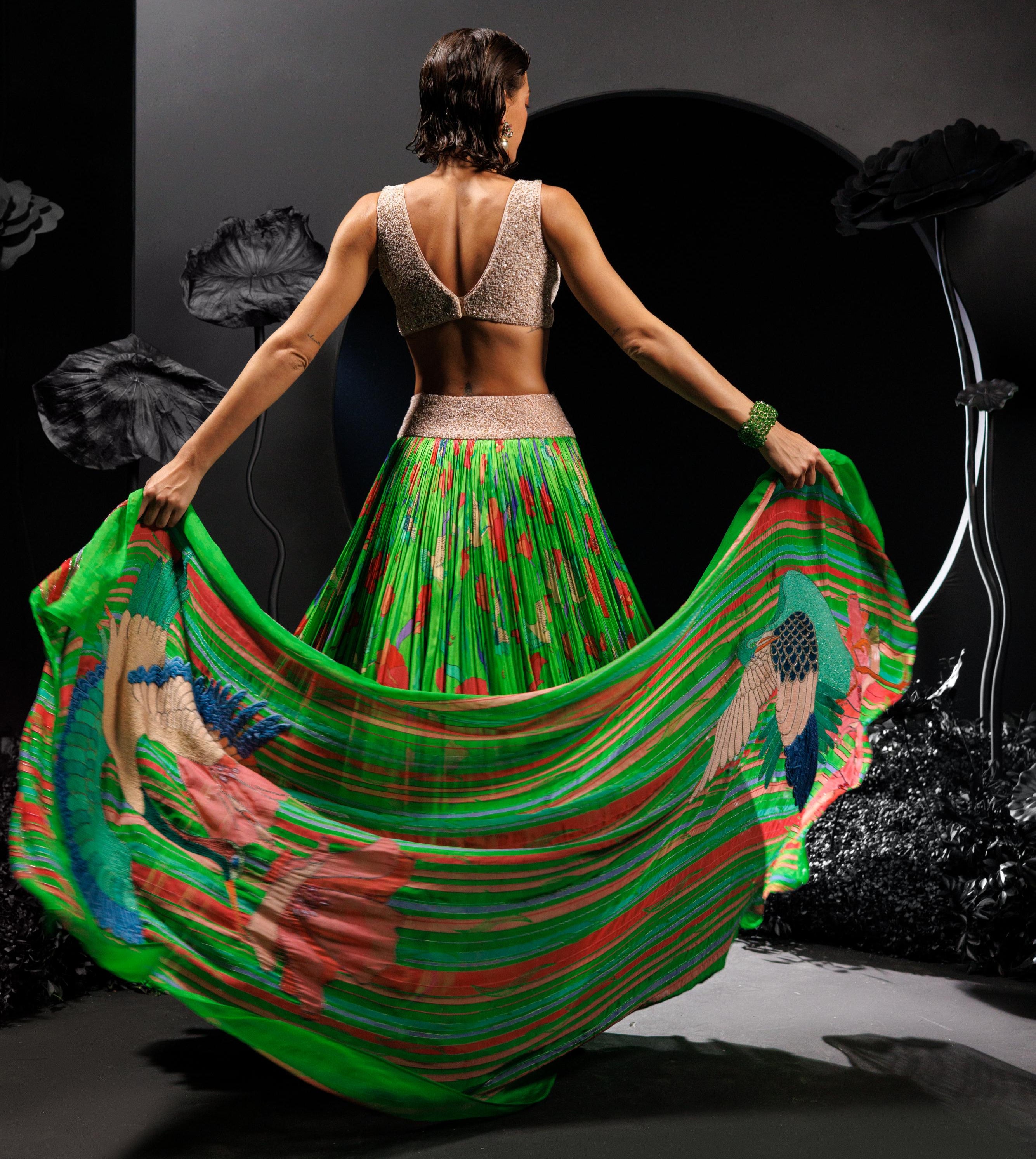 The Neon Green Lehenga Set with Crane and Floral Design from Nautanky exudes modern elegance with intricate crane and floral garden motifs. The unique blouse and dupatta, adorned with aviary placements and detailed embroidery, create a striking contrast of contemporary artistry and traditional charm. Ideal for sangeet nights, wedding receptions, or daytime events, this set offers timeless beauty with bold, artistic detailing.
