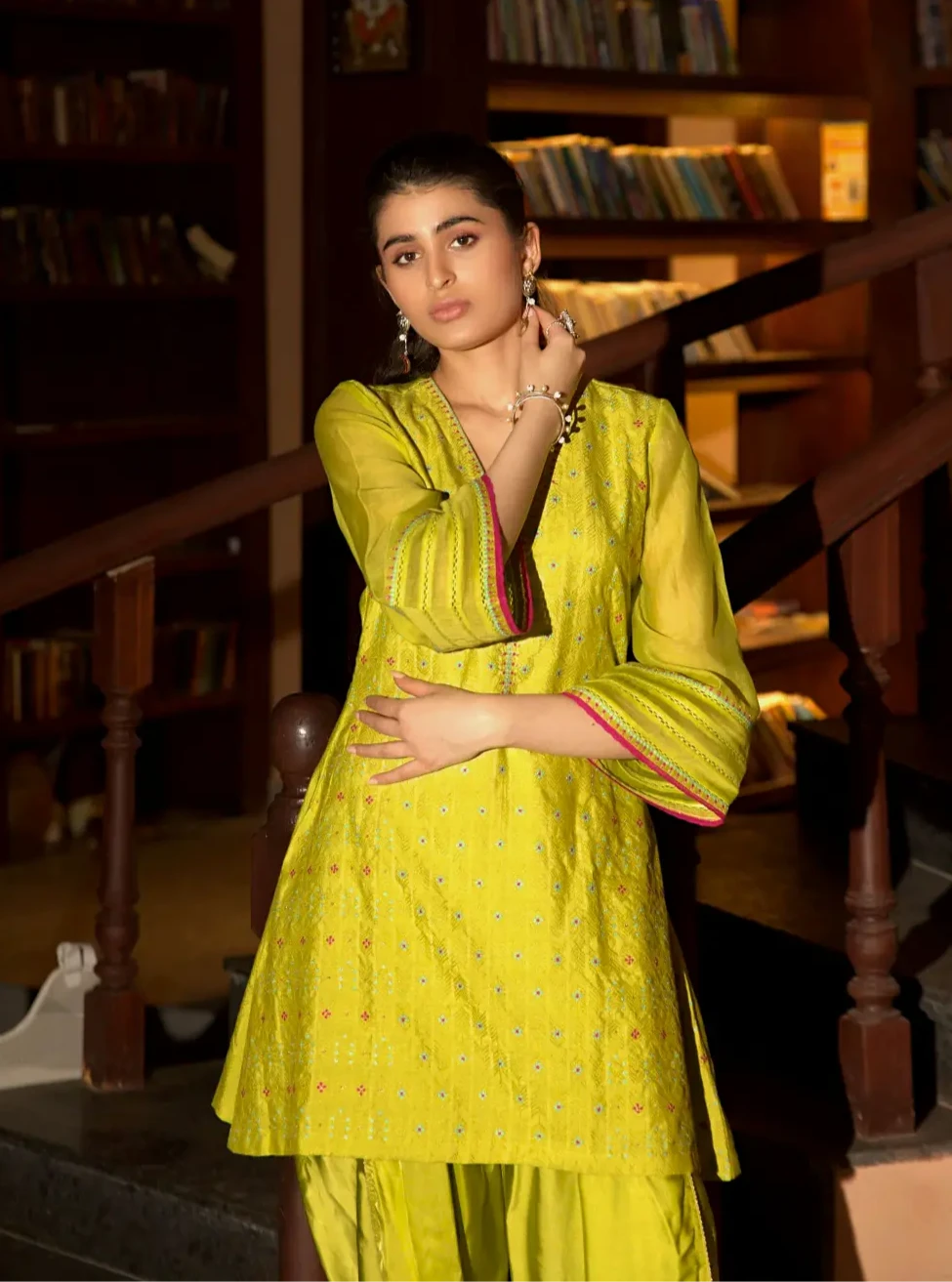 This striking neon green short kurta is adorned with intricate zari work and vibrant multi-color resham dot embroidery, adding a playful yet elegant touch to the outfit. The Pakistani-style sleeves feature delicate jaali detailing, lending a sophisticated flair to the kurta’s design. Paired with luxurious satin tulip pants, the ensemble creates a perfect balance of tradition and contemporary fashion. The soft flow of the satin pants complements the richly embroidered kurta, making it an ideal choice for festive or special occasions.
