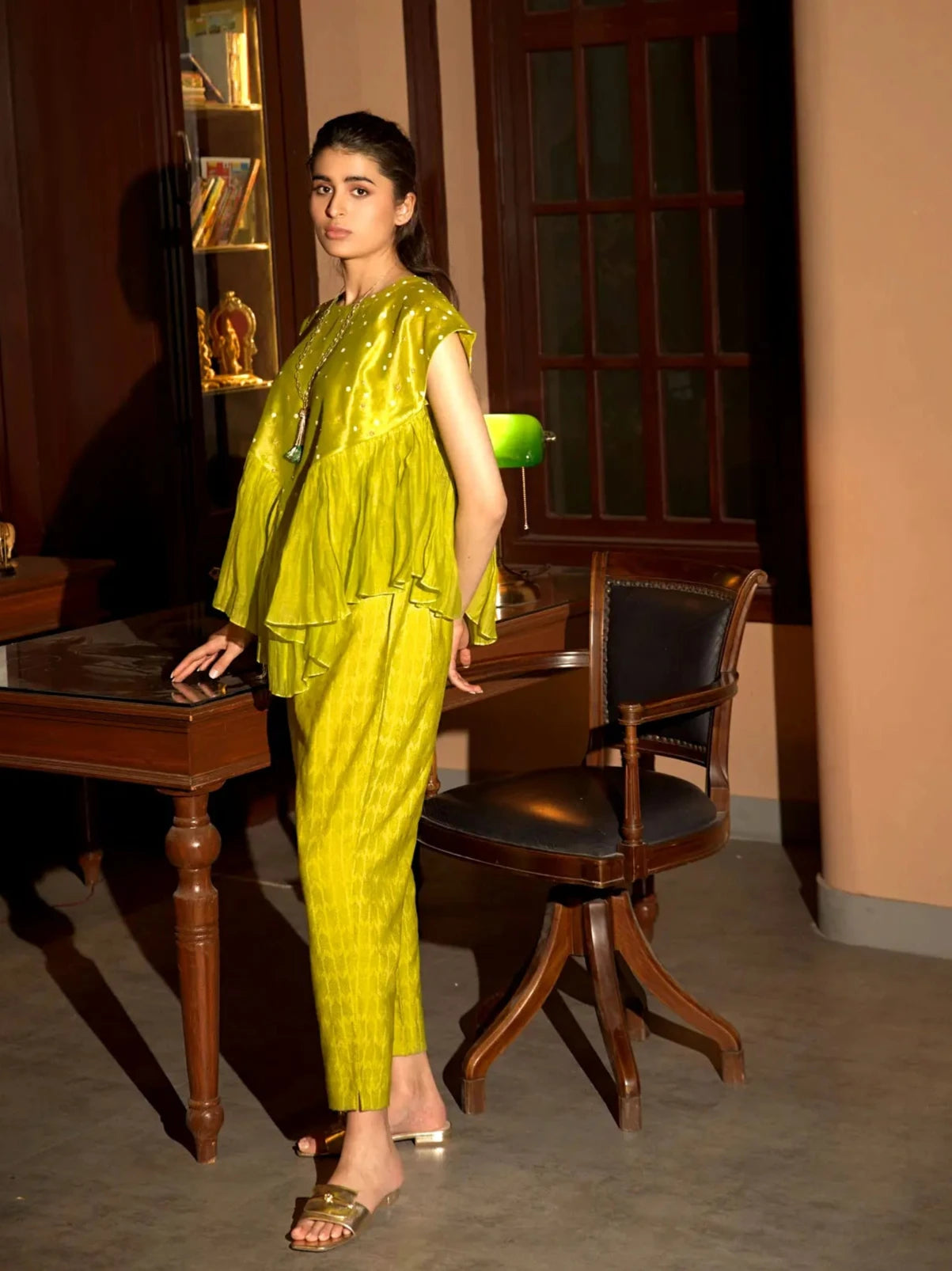 This vibrant neon green short gather top is adorned with intricate siri miri booti hand embroidery, crafted using traditional aari and resham techniques. The delicate embroidery adds a touch of elegance and artistic craftsmanship to the playful silhouette, which features soft gathers for a flattering fit. Paired with textured straight pants, this ensemble offers a perfect balance of modern style and traditional detailing. The textured pants complement the rich embroidery of the top, making it ideal for festive or semi-formal occasions.