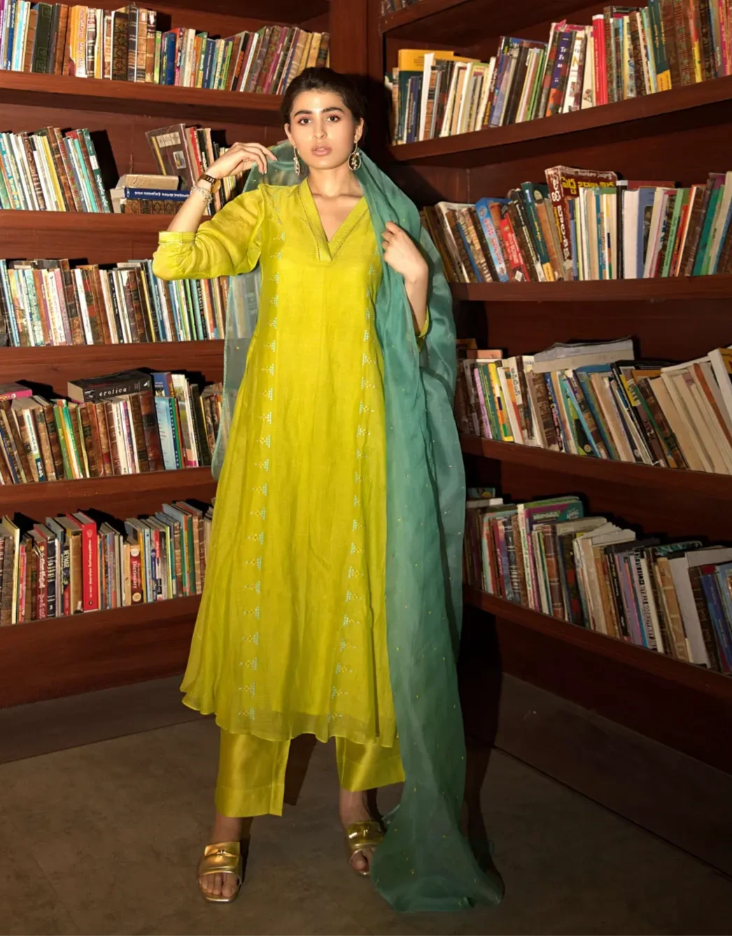 This exquisite neon green A-line kurta is designed with stylish side panels, showcasing a flattering silhouette. The center panel is embellished with delicate blue resham and aari dot embroidery along the princessline, adding a pop of color and intricate detailing. Paired with straight pants for a sleek and comfortable fit, the ensemble is completed by a stunning dupatta, featuring dotted mandala and all-over booti embroidery. This outfit effortlessly blends traditional embroidery techniques with modern design, perfect for any festive occasion.