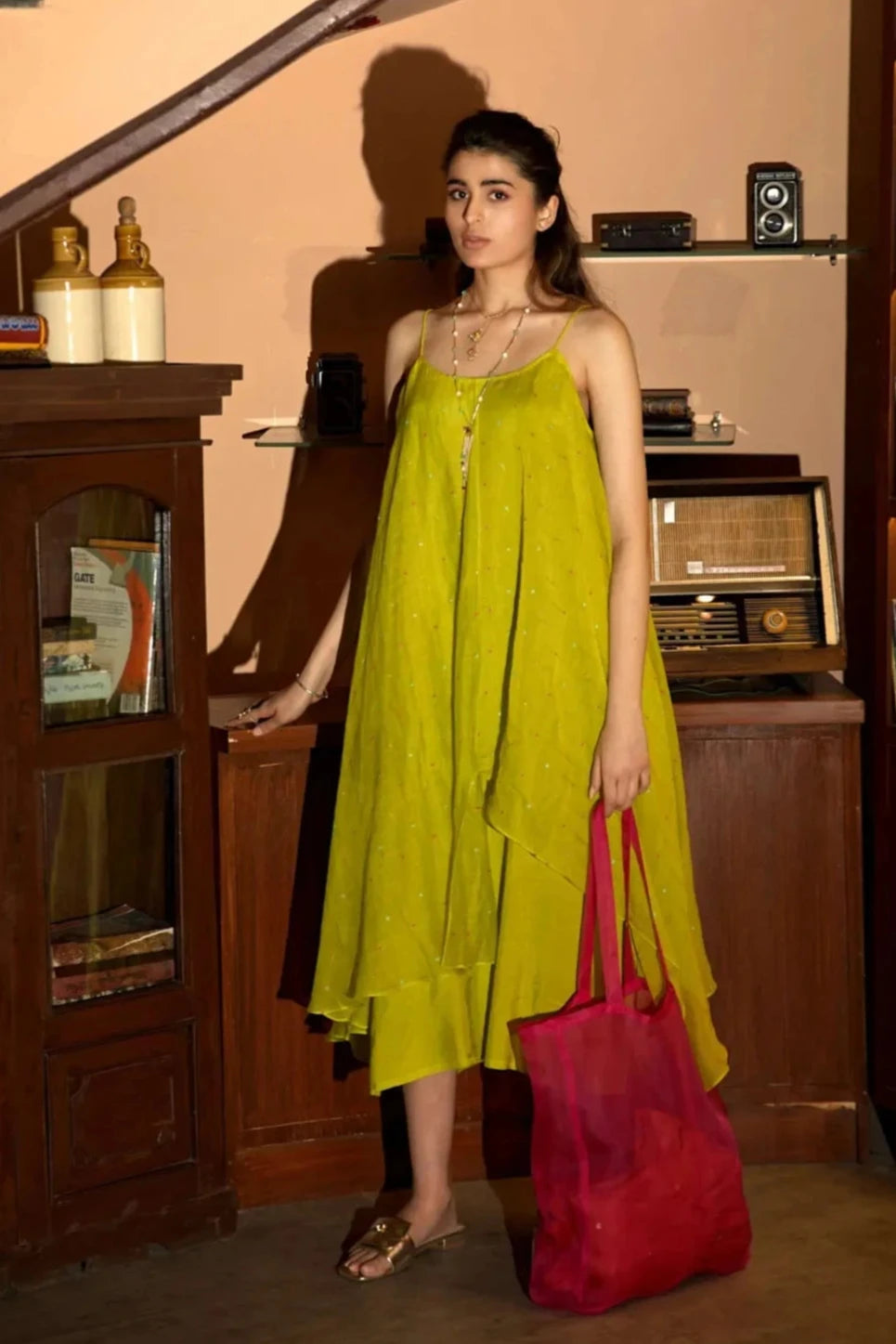 This striking neon green slip dress features all-over hand-embroidered multi-color dots, adding a playful and artistic touch to its sleek silhouette. The lightweight fabric drapes beautifully, while the delicate straps and subtle V-neckline enhance its elegance. Perfect for a standout look, it’s a fusion of bold color and craftsmanship.
