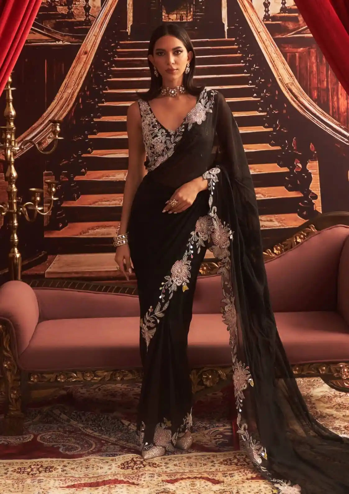 Nimta black embellished choli and pre-draped saree