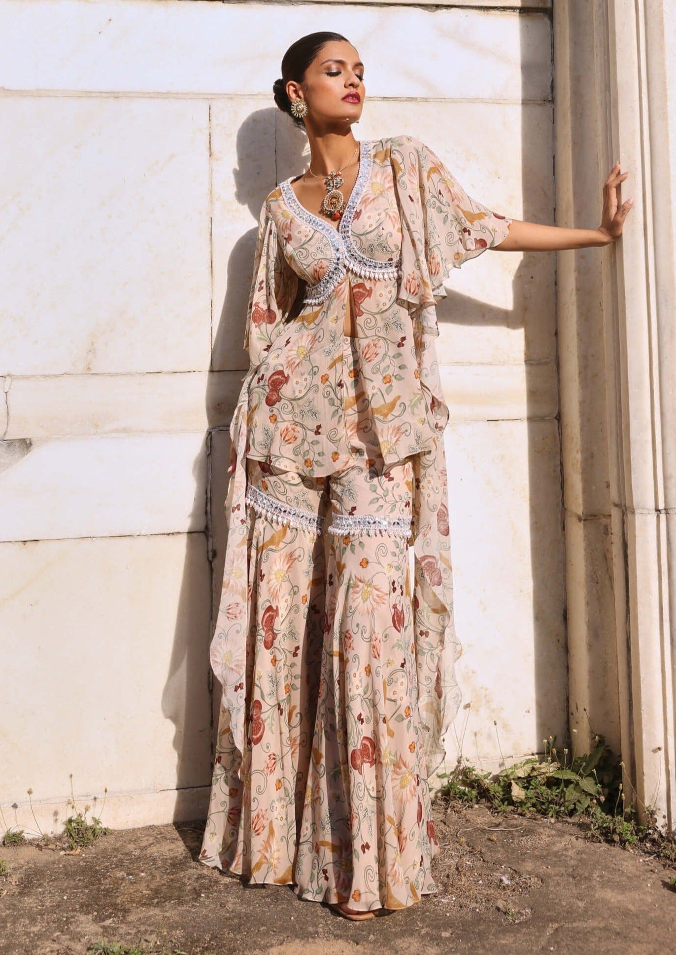 The Nirvi blush pink embellished printed peplum top, adorned with exquisite detailing, is elegantly paired with a matching embellished gharara. This enchanting ensemble masterfully combines contemporary design with traditional elements, creating a look that ensures you stand out with grace at any gathering. Perfect for making a memorable impression, this outfit offers a harmonious blend of modern sophistication and classic charm, ideal for special occasions and celebrations.