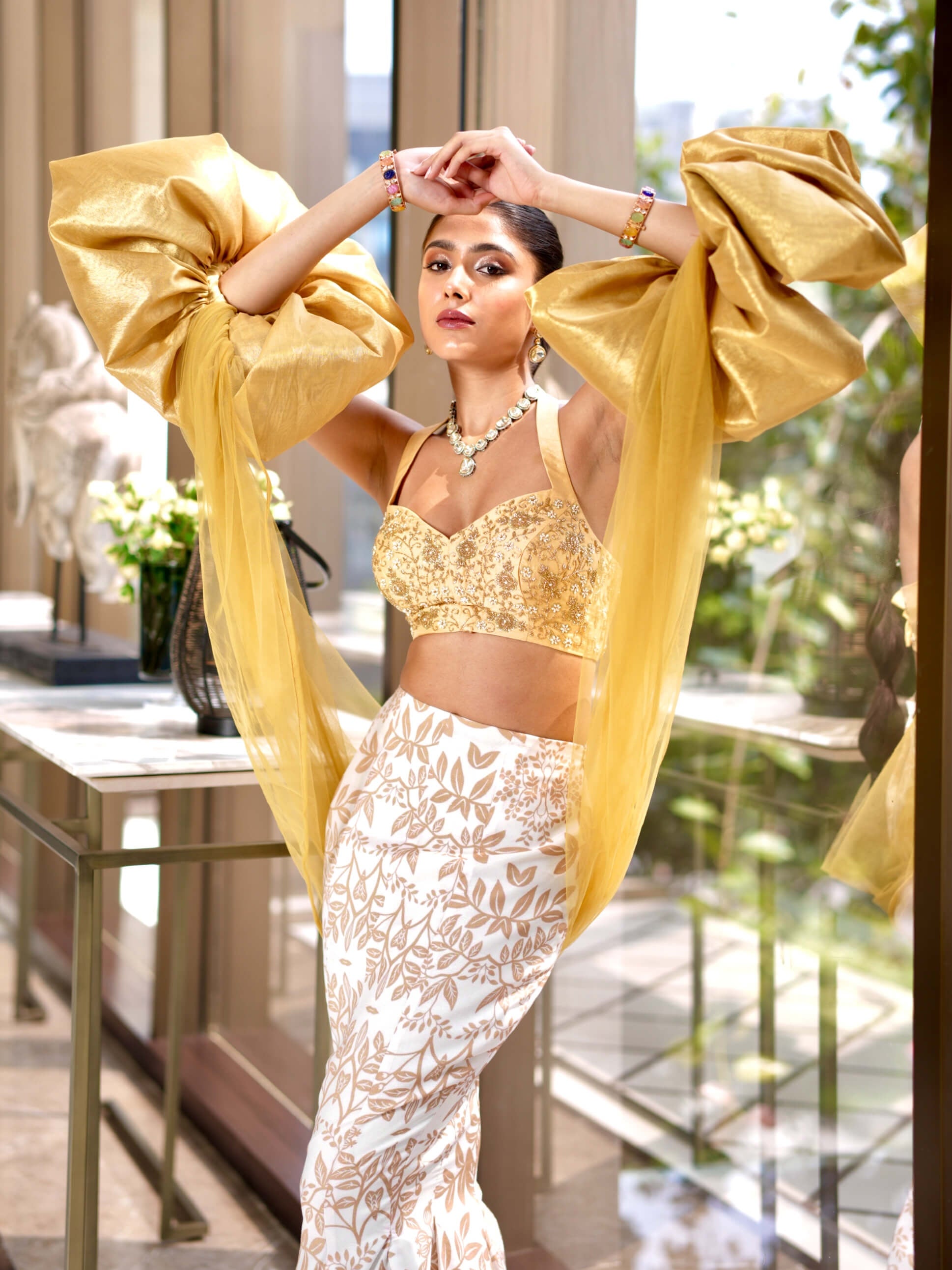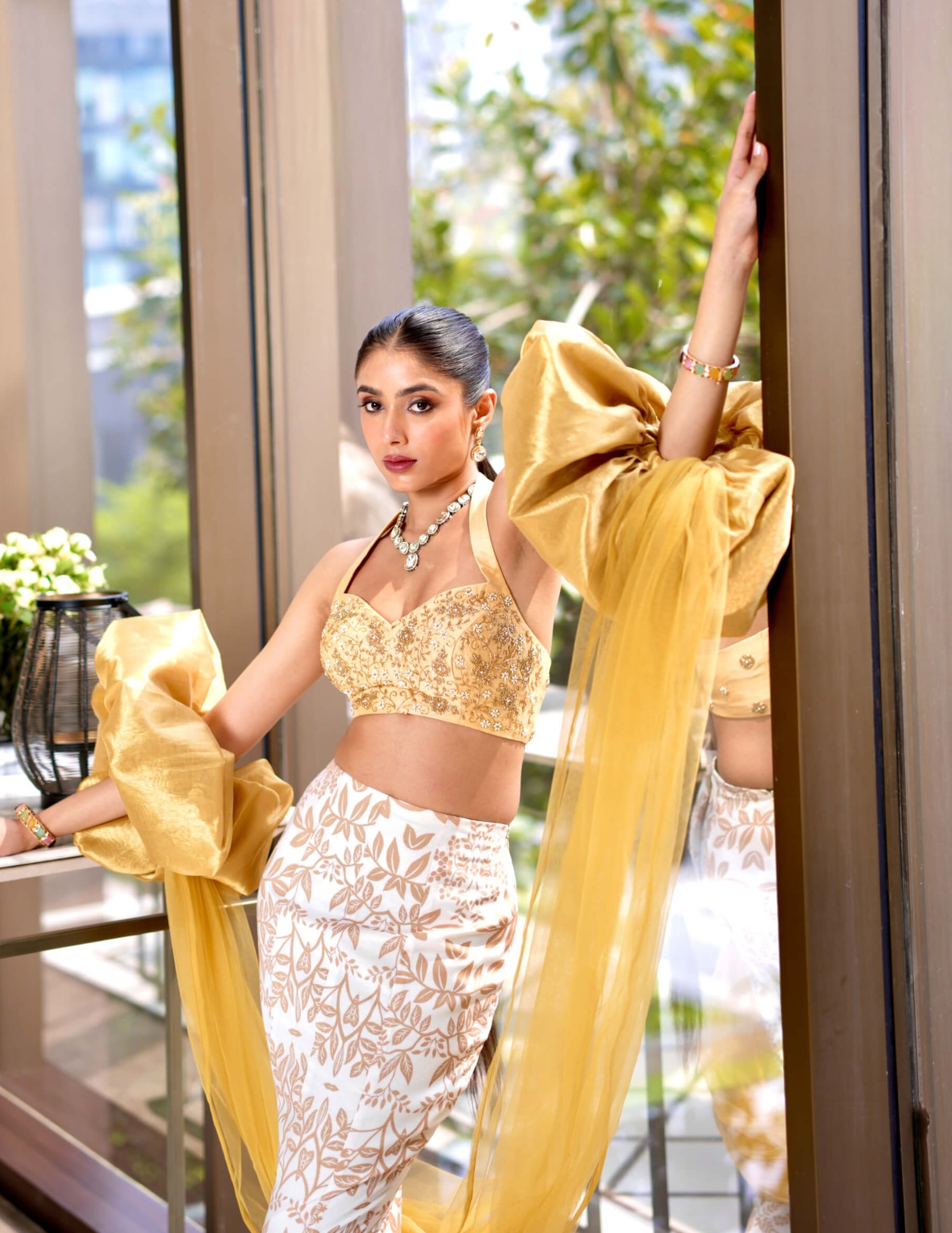 Step into sophistication with the hand-embroidered silk halter-necked blouse paired elegantly with a printed modal silk fishtail lehenga and tissue-puffed drape dupatta. The halter-necked blouse features intricate embroidery, offering a blend of elegance and modern flair. Complementing this ensemble is the printed modal silk fishtail lehenga, which combines comfort with a flattering silhouette. Complete your look with the tissue-puffed drape dupatta, adding a touch of lightness and grace to the outfit. Ideal for weddings and special occasions, this ensemble combines traditional craftsmanship with contemporary design, ensuring you stand out with refined style and poise.