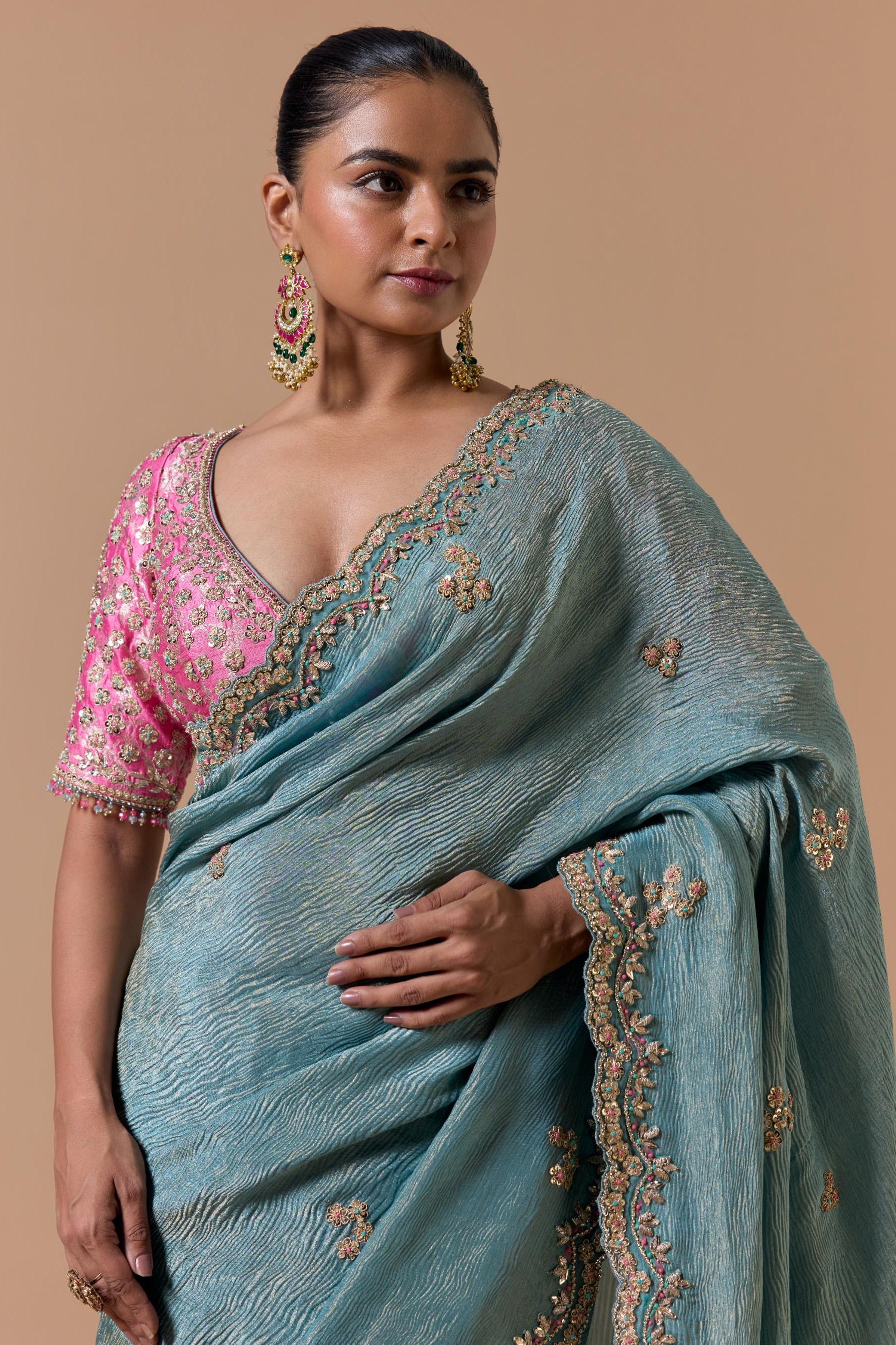 Aqua crush tissue navyaa saree with pink brocade blouse