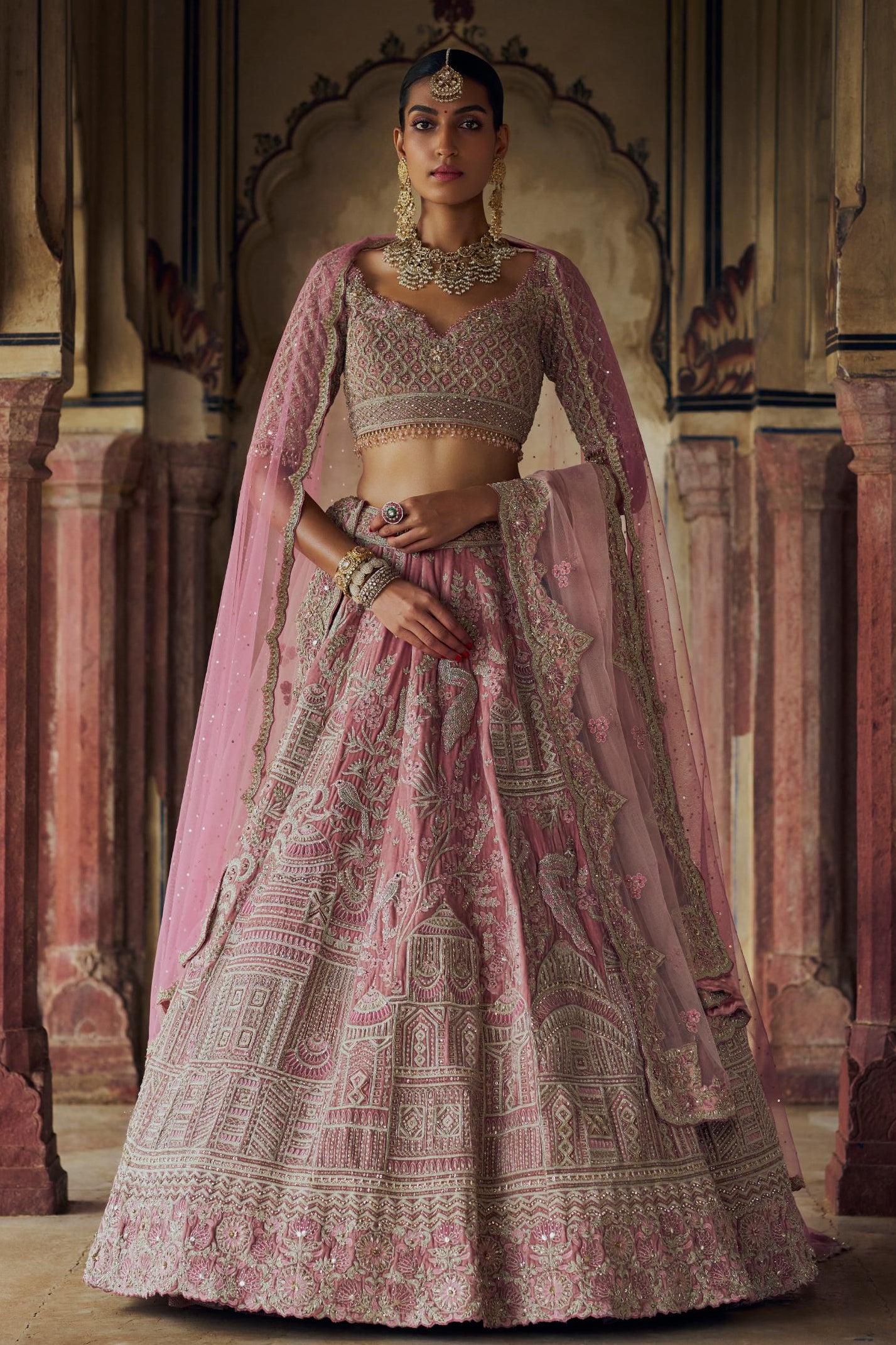 This blush-pink velvet lehenga set blends softness with regal depth, perfect for winter weddings, cocktails, and festive evenings.