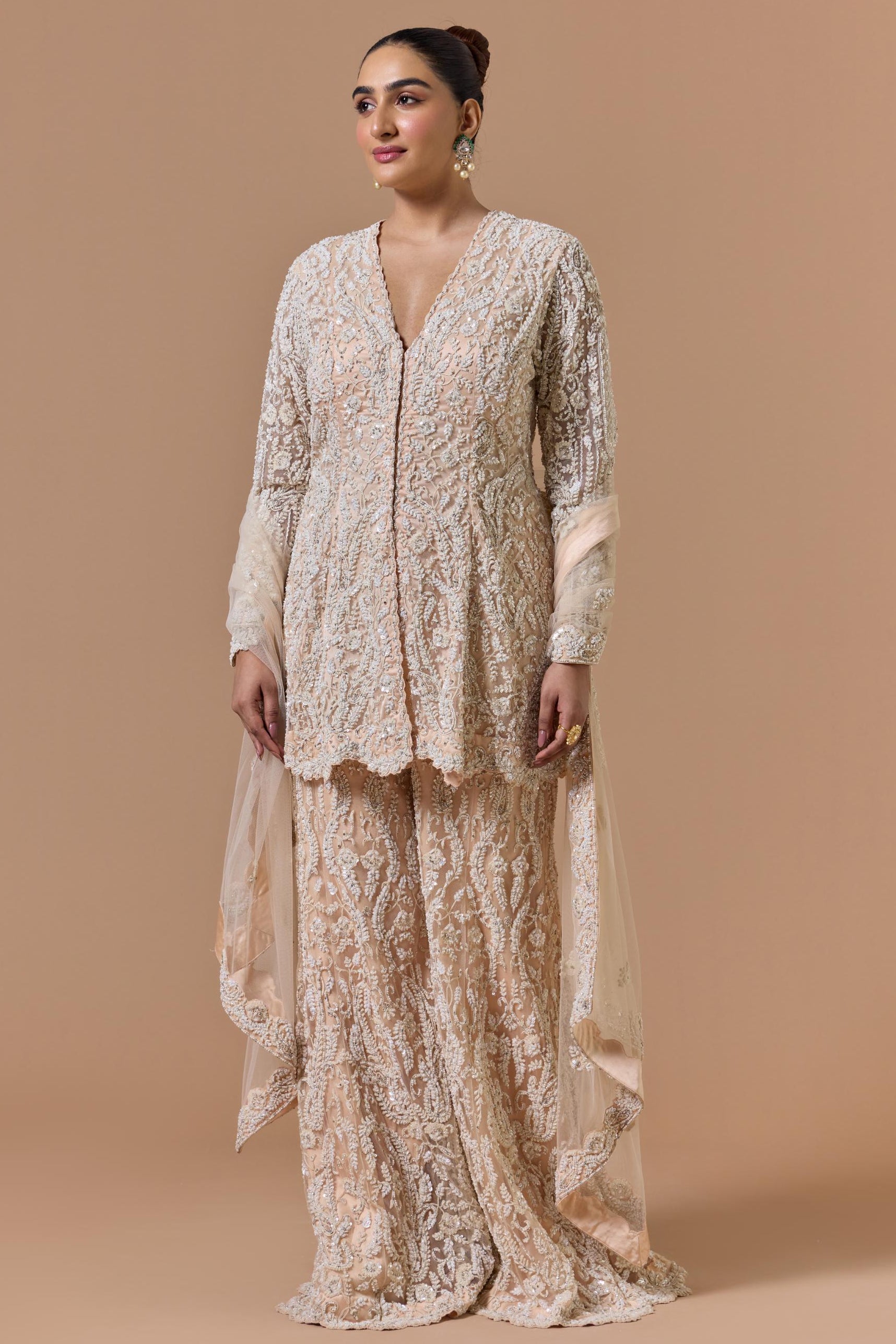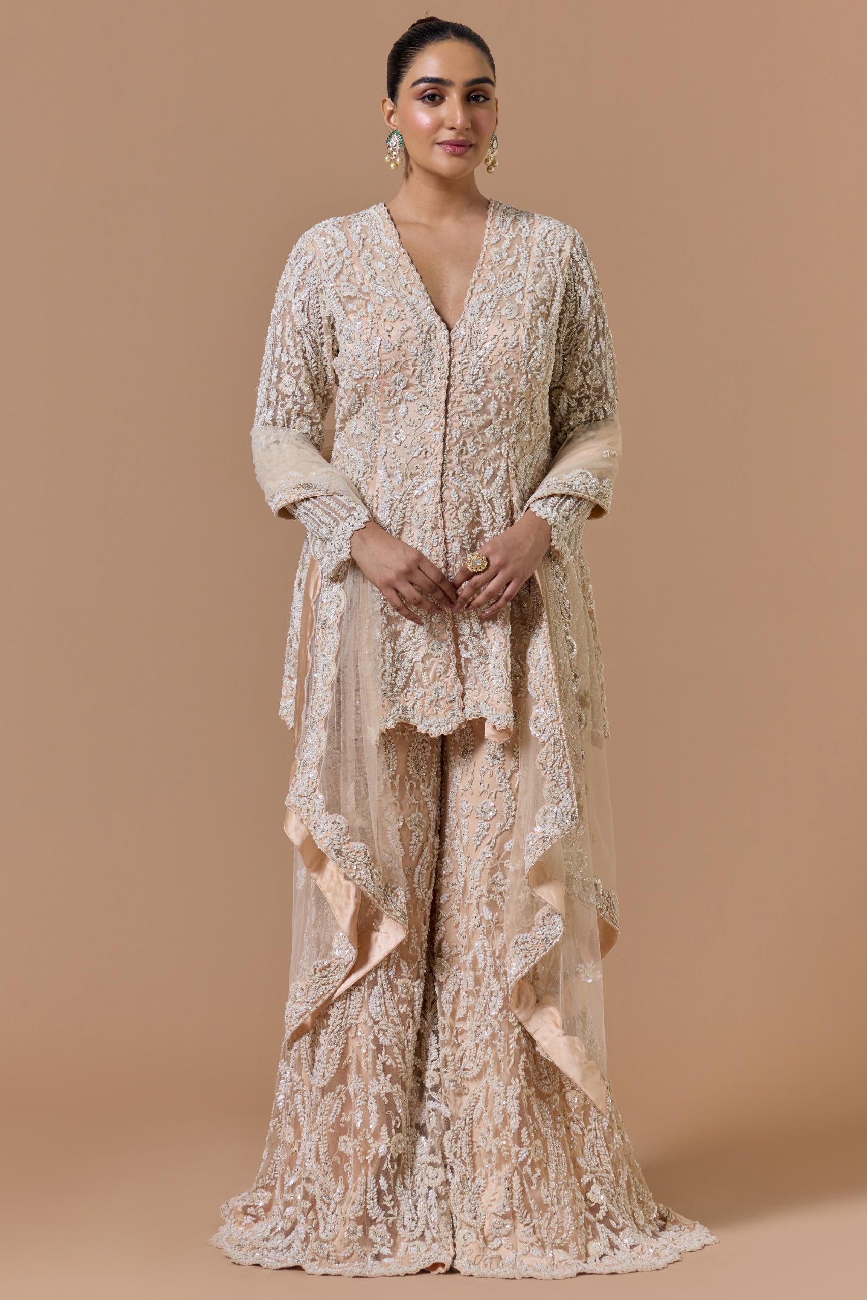 Soft and romantic, this sharara set blends blush tones with fluid movement. Comfortable pants make this sharara set ideal for long festivities. Gentle shimmer enhances the sharara set, perfect for daytime celebrations. Styled with floral jewellery, this sharara set feels dreamy. A youthful ensemble, this sharara set flatters beautifully. Elegant and festive, this sharara set suits every joyful occasion.