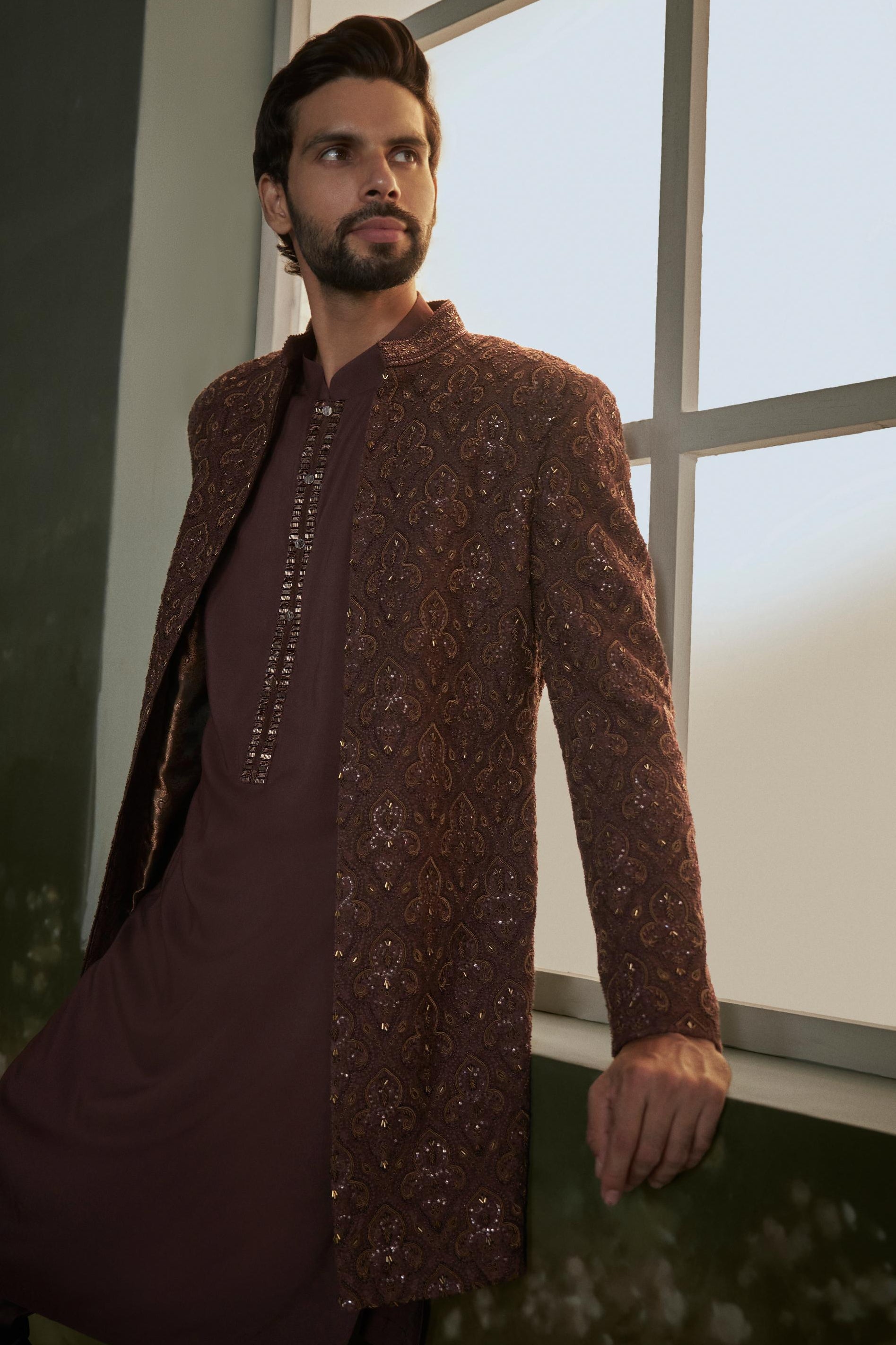 Elegant, structured, and versatile, this sherwani set blends modern tailoring with traditional refinement. The short jacket silhouette gives this sherwani set a contemporary appeal suitable for weddings or festive events. The rich brown palette enhances the sophistication of the sherwani set, making it ideal for daytime ceremonies. Coordinated pieces ensure the sherwani set offers seamless styling from head to toe. Lightweight construction keeps the sherwani set comfortable throughout celebrations. Designed for men seeking understated luxury, this sherwani set delivers timeless style with ease.