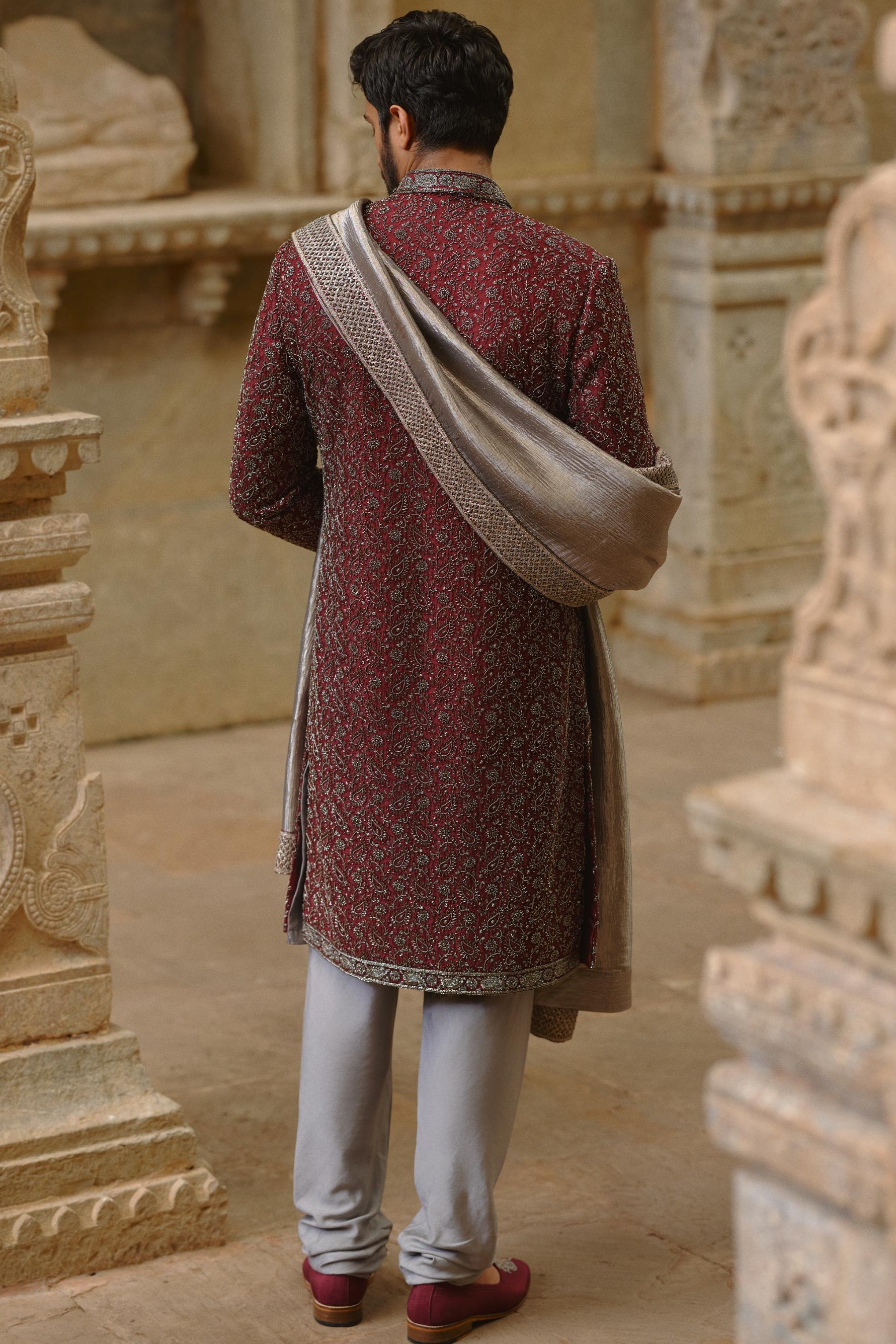 This dramatic burgundy sherwani set blends deep richness with the elegant sheen of raw silk. Ideal for evening weddings or receptions, the burgundy sherwani set commands presence. Lightweight and structured, the burgundy sherwani set keeps you comfortable throughout long events. Pair this burgundy sherwani set with gold or champagne accents to elevate the look. A statement ensemble, the burgundy sherwani set captures refined celebration.