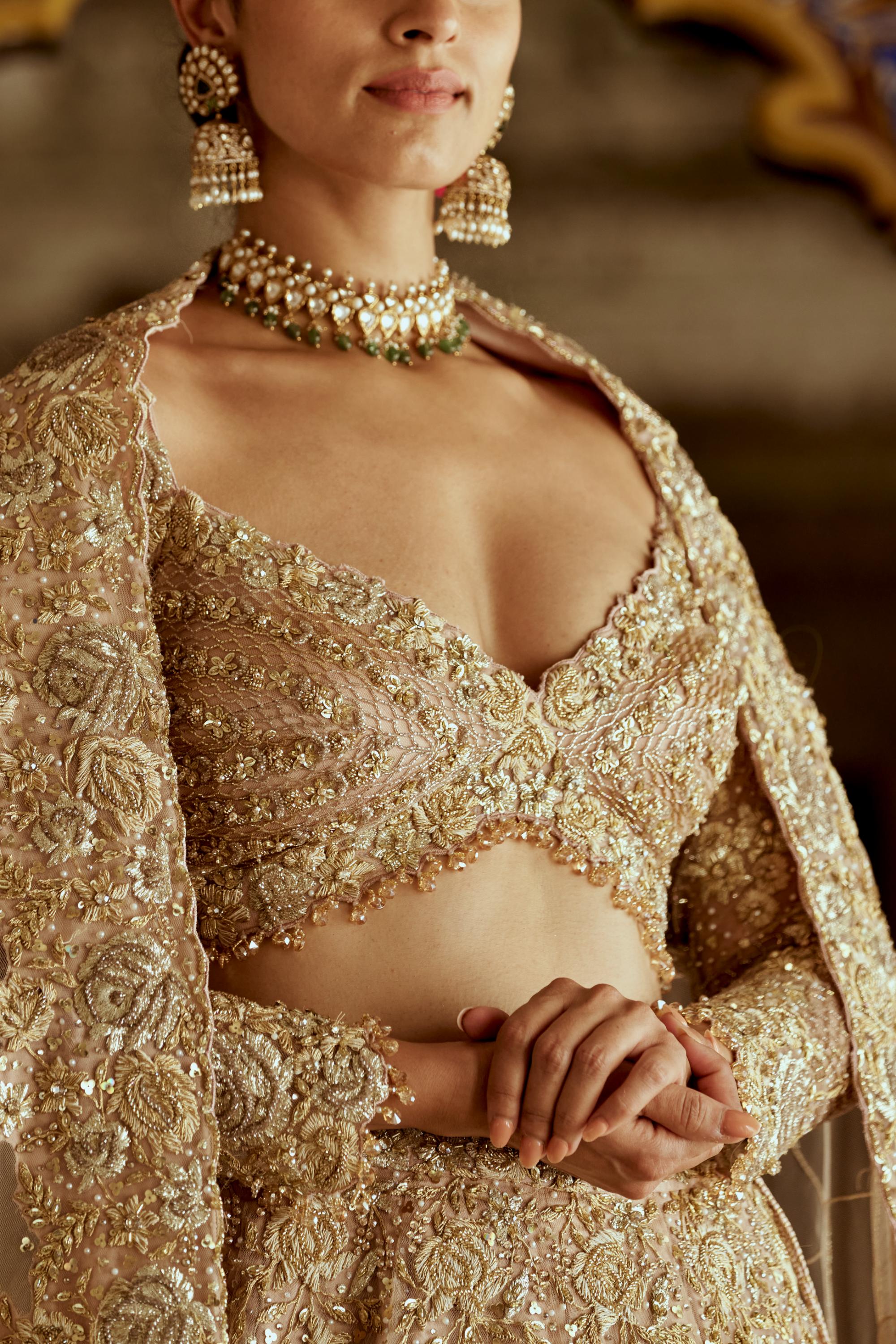 This champagne-gold net lehenga set brings luminous softness to sangeets, cocktails, and wedding evenings, offering elegant sparkle.