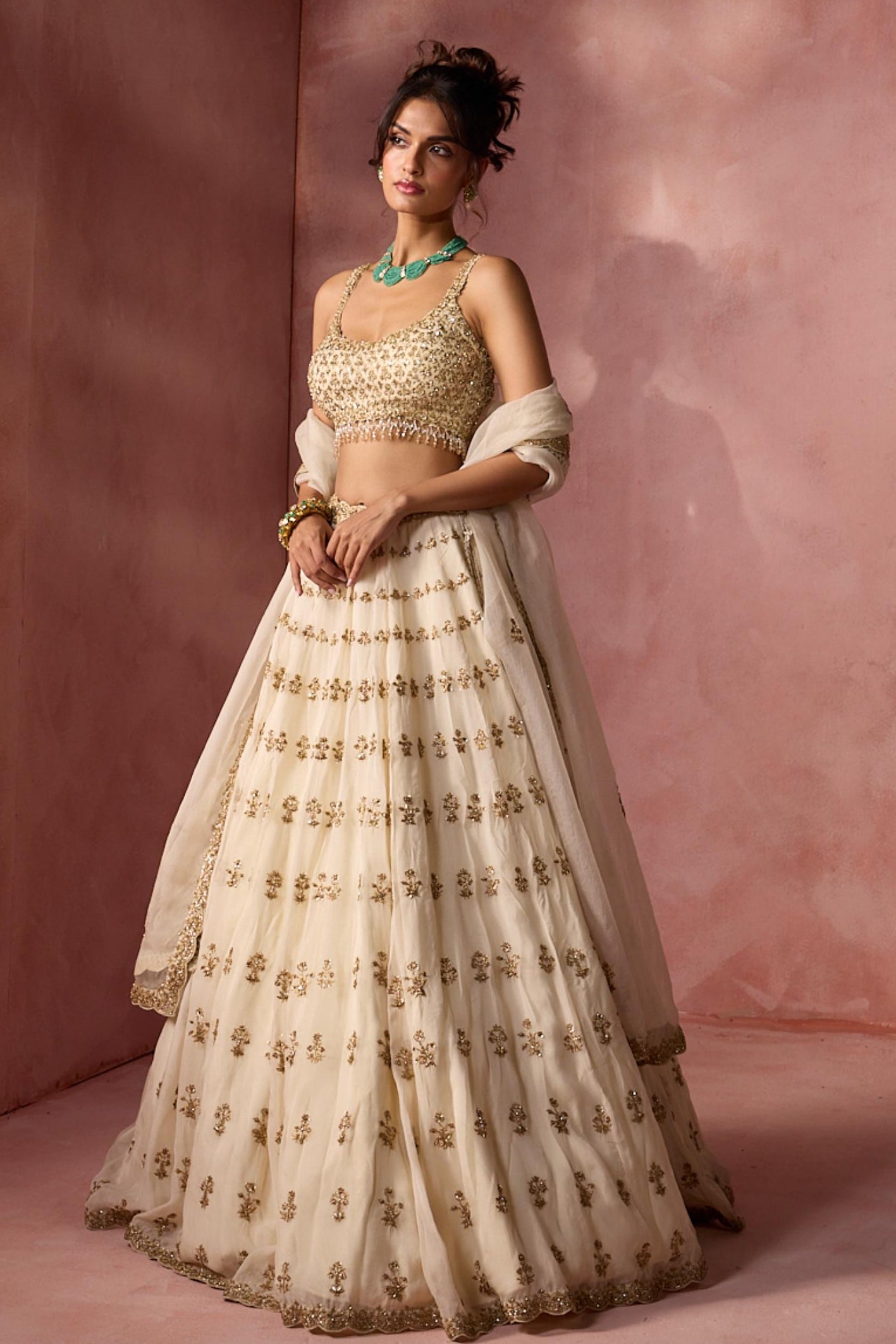This cream Navyaa organza lehenga set is airy, soft, and elegant—perfect for daytime ceremonies and pastel themes. The organza fabric adds dreamlike movement to the minimal silhouette.