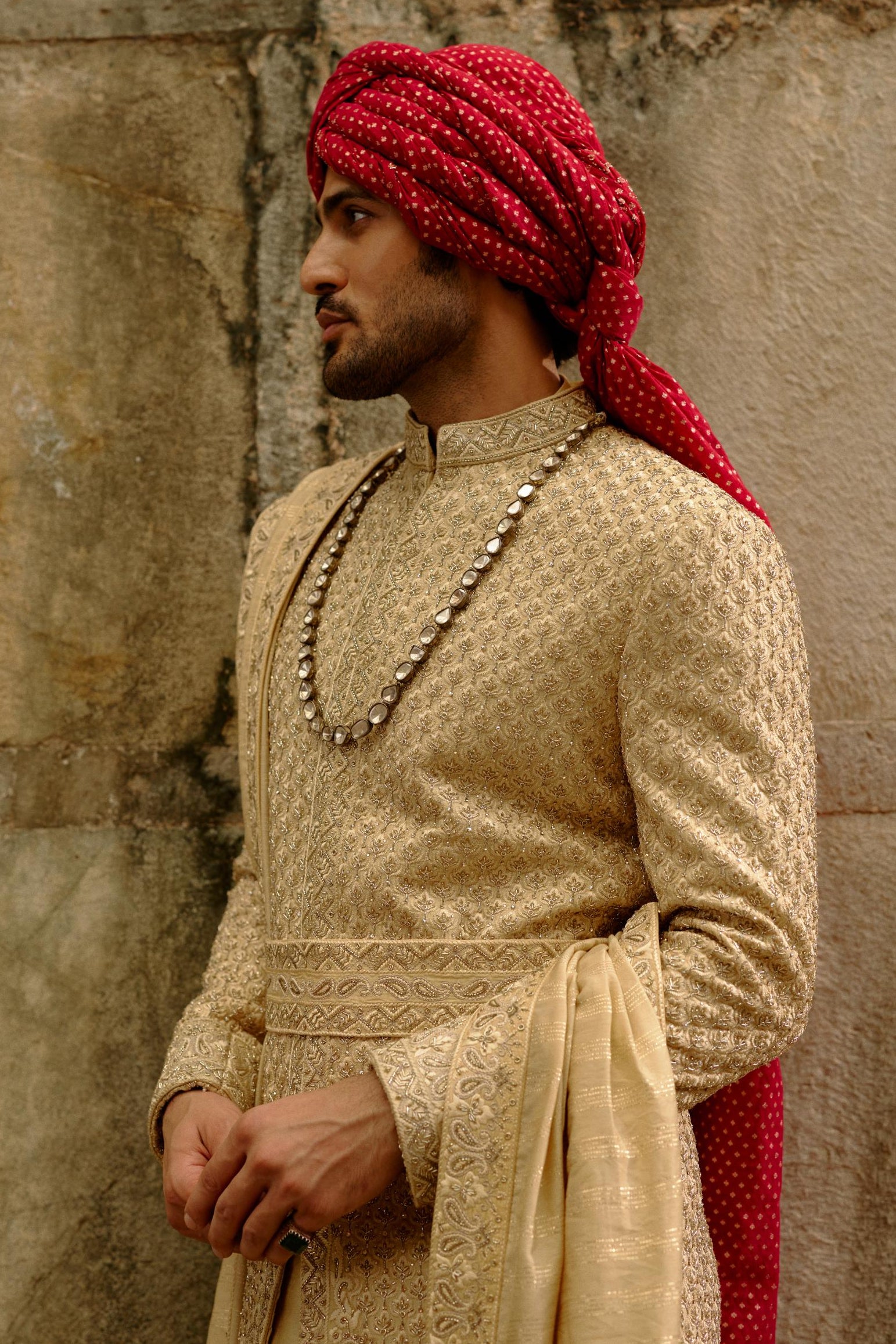 Components: 5 pieces (Sherwani, kurta, churidar, belt, stole)