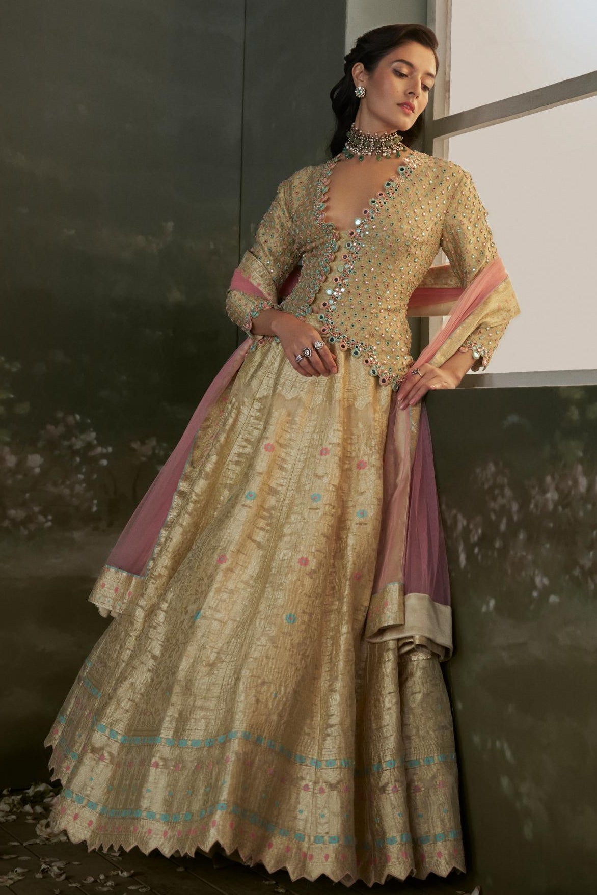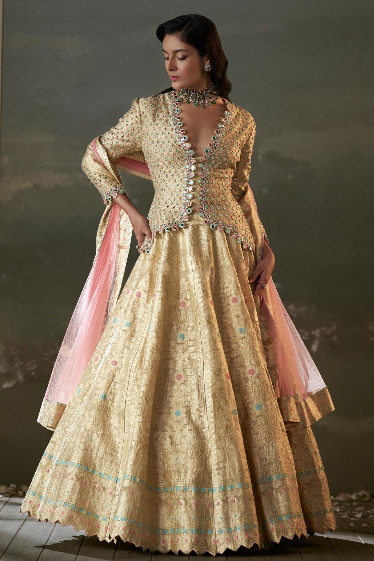 The Golden Noor woven Benarasi silk lehenga set by Nitika Gujral celebrates traditional Indian craftsmanship. Crafted in rich Benarasi silk, this lehenga set offers texture and structure. The golden palette makes this lehenga set ideal for weddings and formal ceremonies. Designed for comfort, the lehenga set allows graceful movement. Its woven detailing ensures the lehenga set stands out in traditional settings. Pair this lehenga set with heritage jewellery for a majestic look.