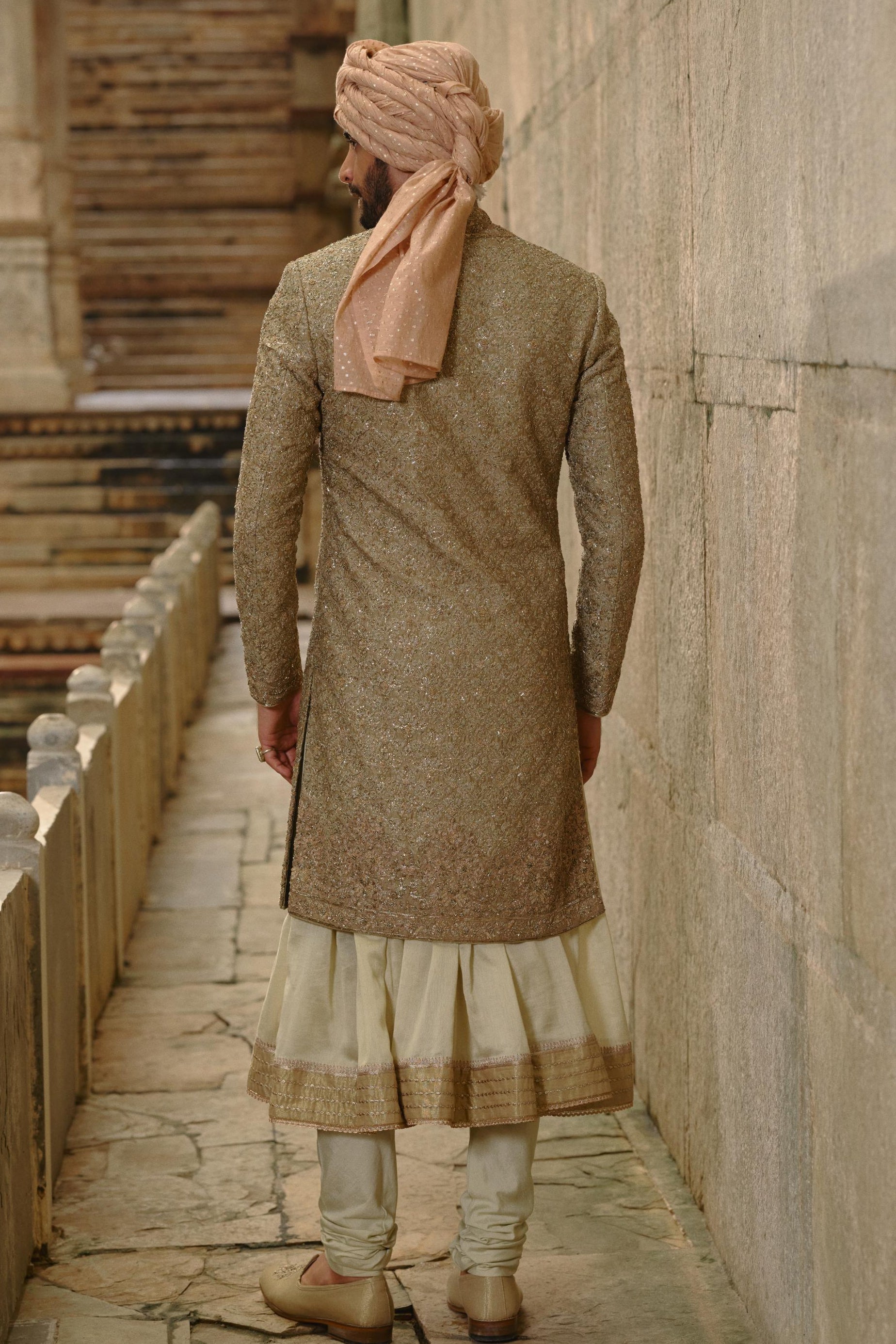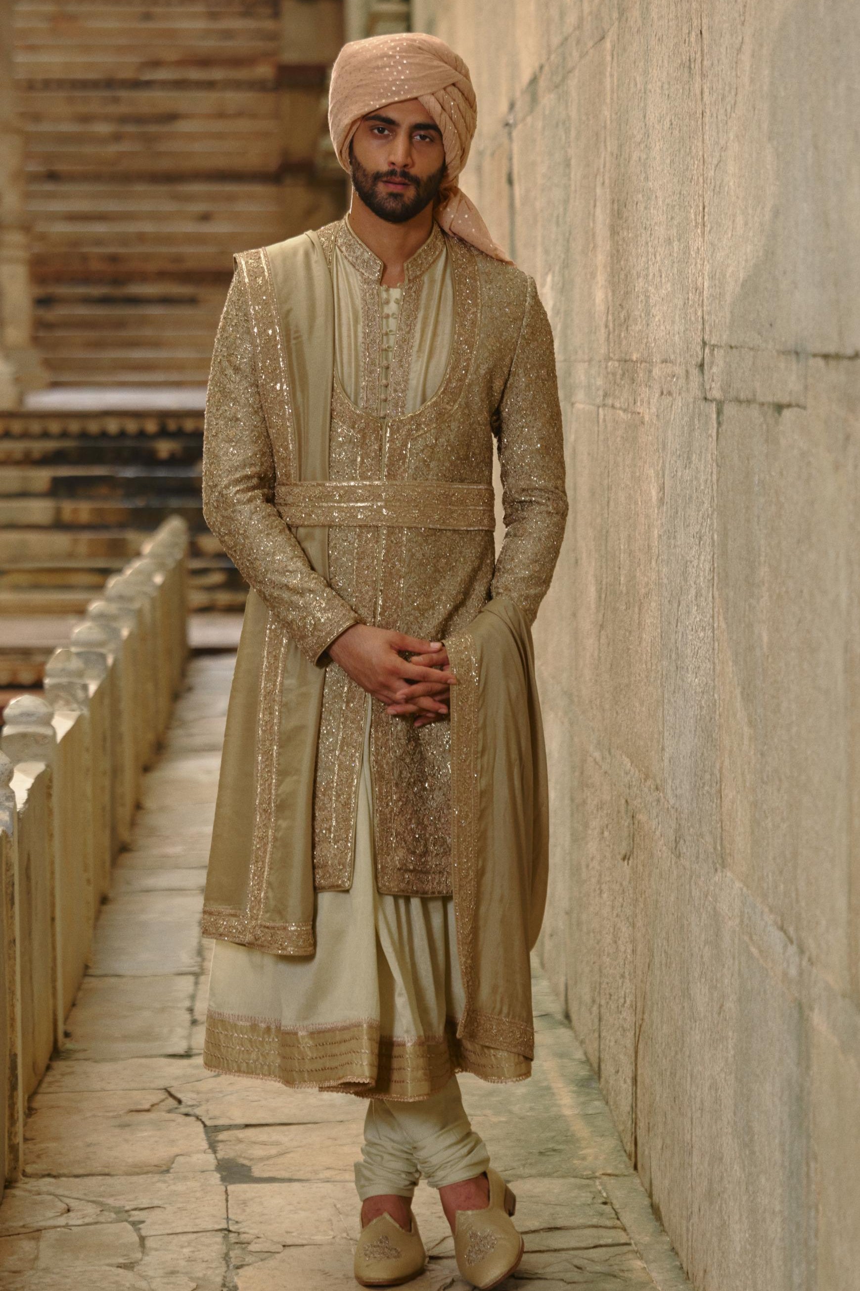 Components: 5 pieces (Sherwani, choga, churidar, belt, stole)