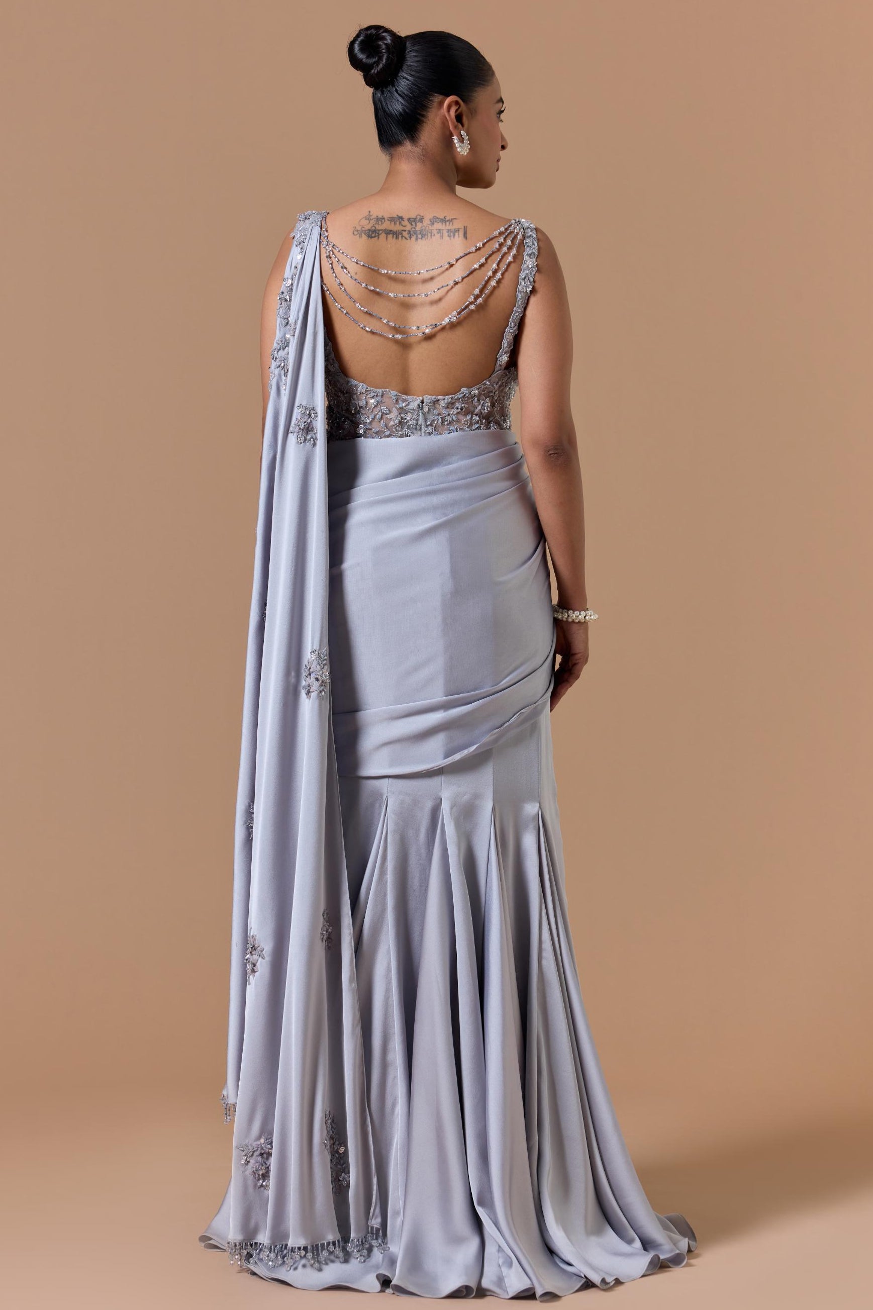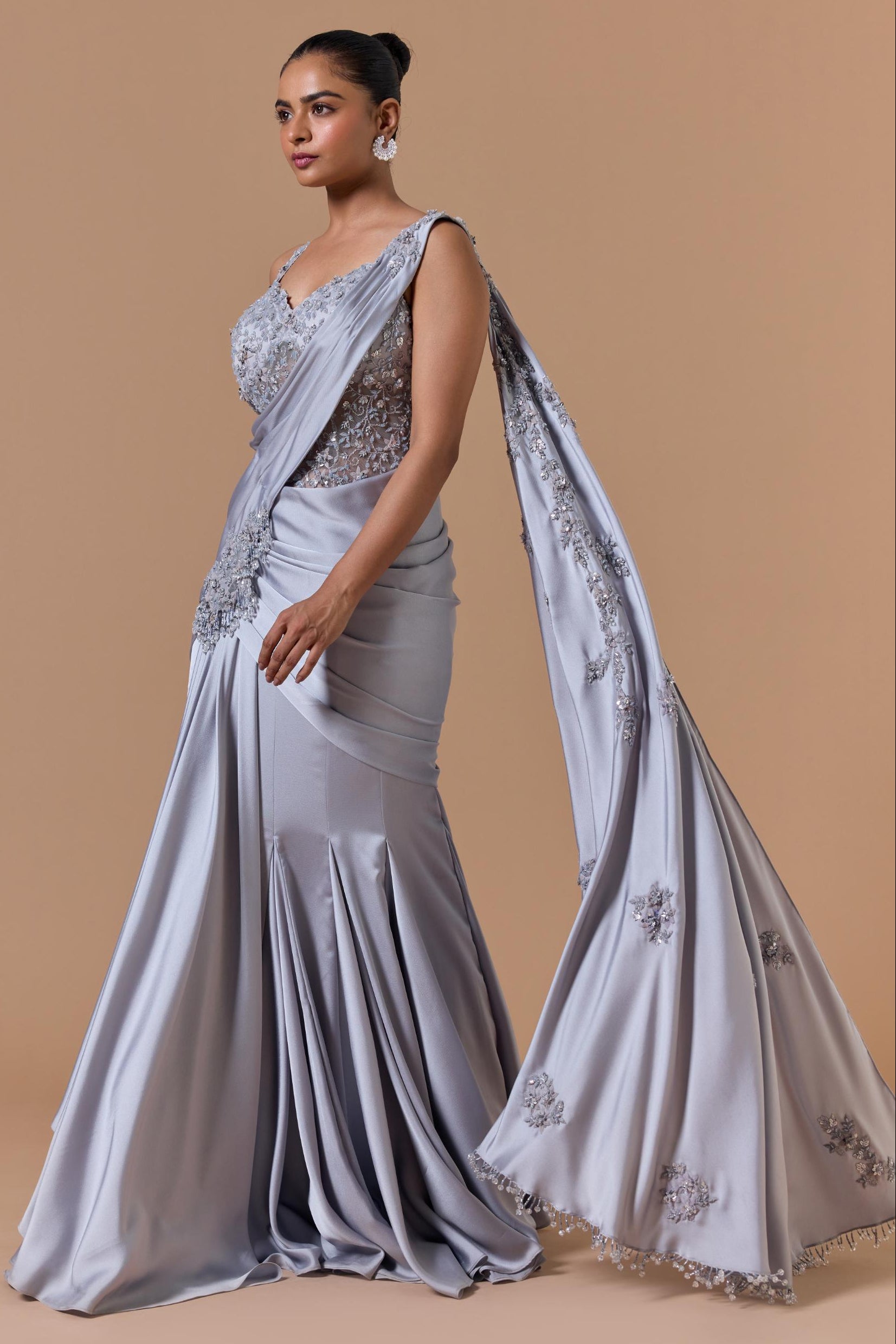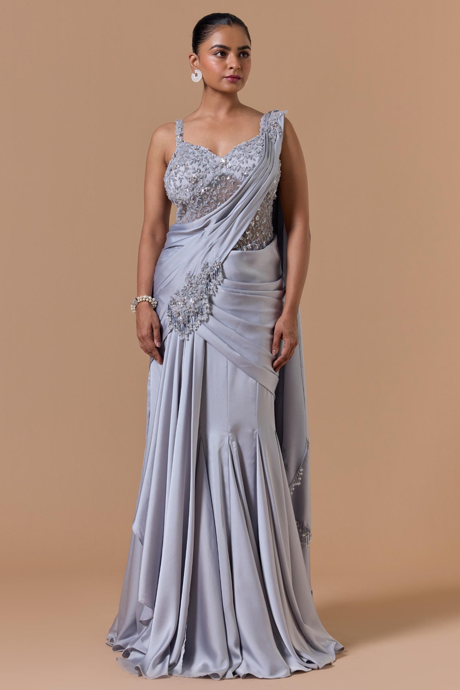 This elegant draped gown saree blends structured grace with soft grey movement. The silhouette elevates the appeal of the draped gown saree, while lightweight fabric keeps the draped gown saree comfortable at events. Ideal for receptions, the draped gown saree pairs beautifully with silver accents. A refined look, this draped gown saree flatters effortlessly. Modern yet classic, this draped gown saree defines elevated evening style.