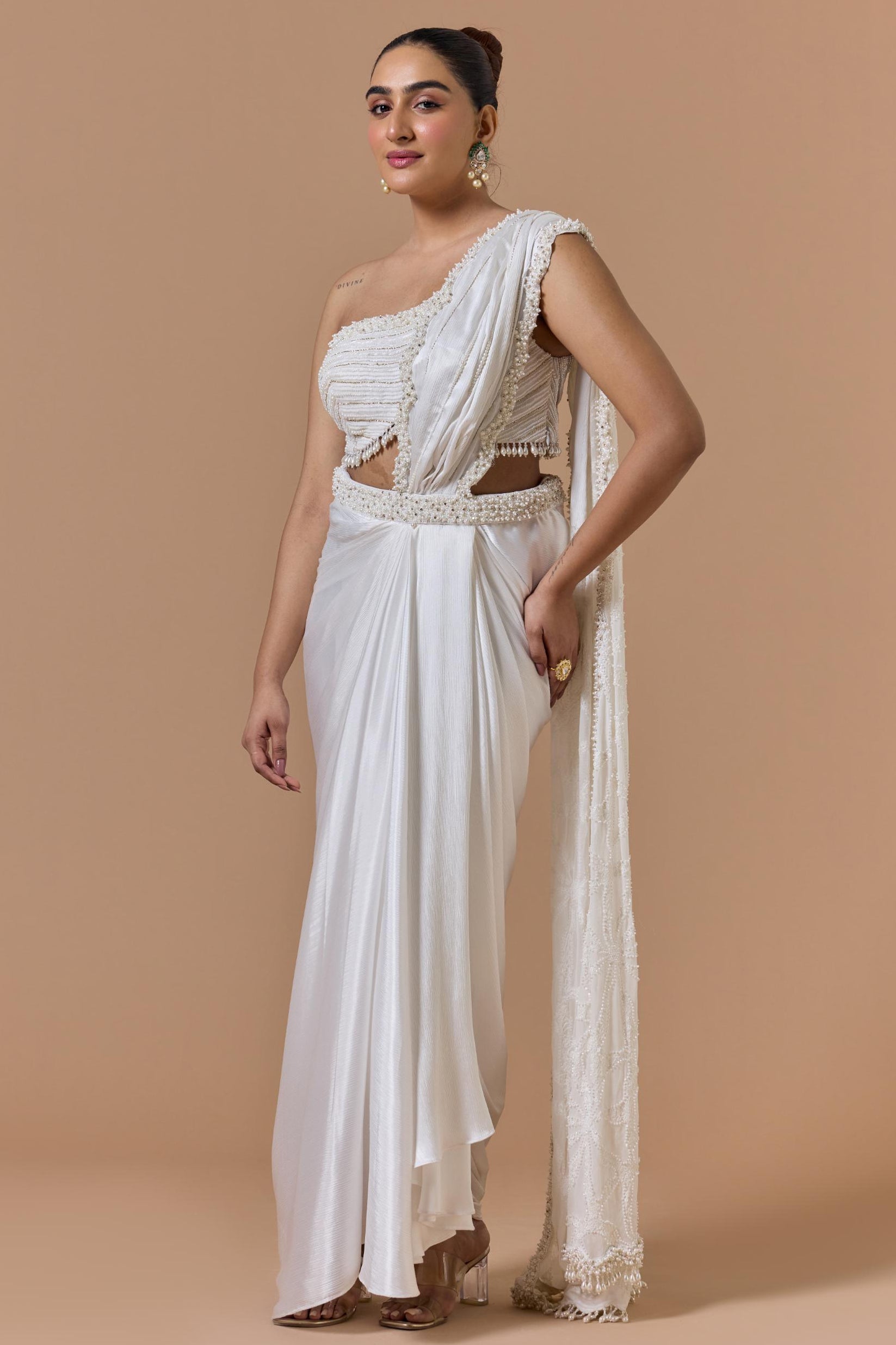 This ivory one-shoulder Navyaa draped saree offers clean lines, fluid structure, and modern grace—perfect for receptions, cocktails, or destination celebrations. Pair with pearls for an effortlessly polished finish.