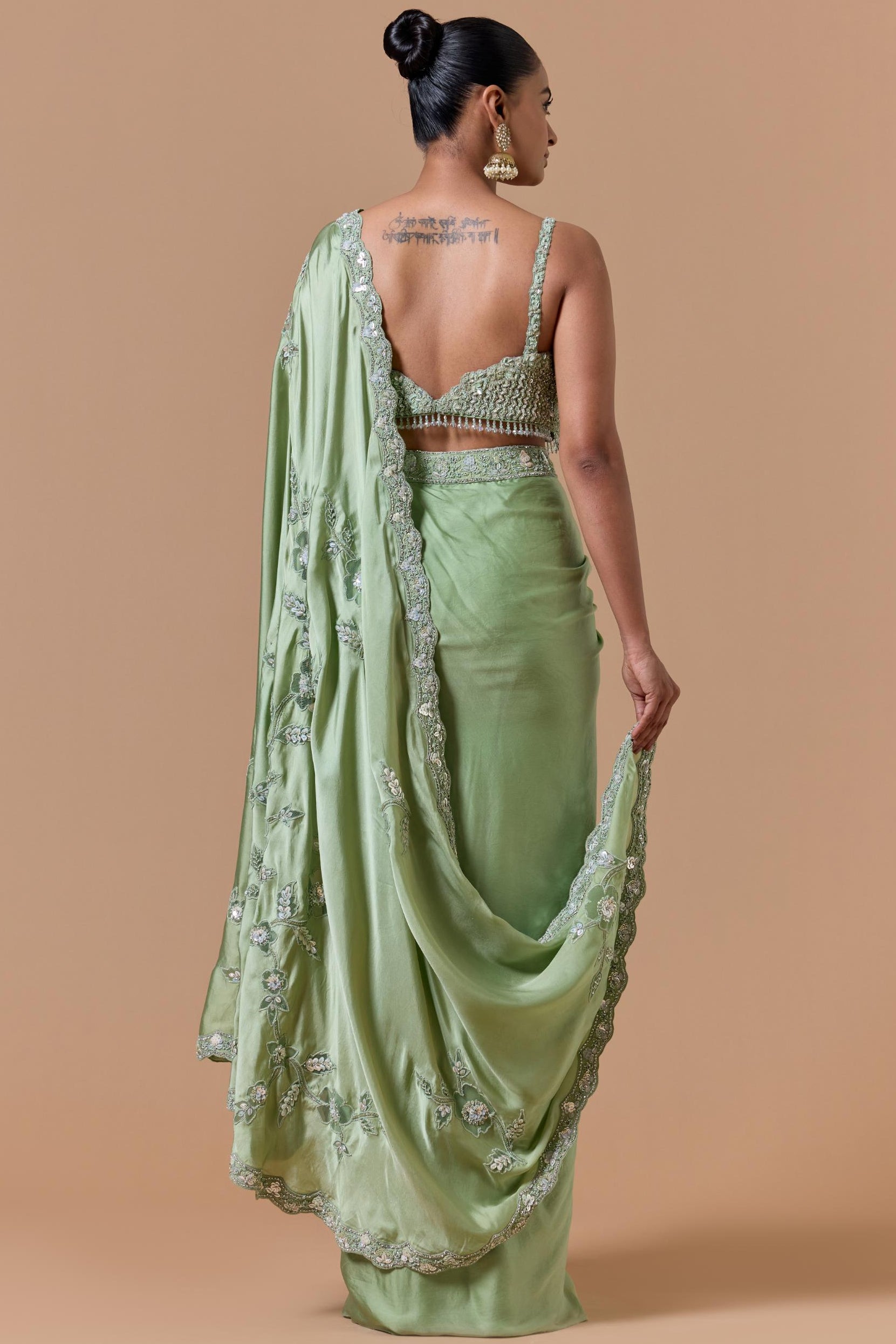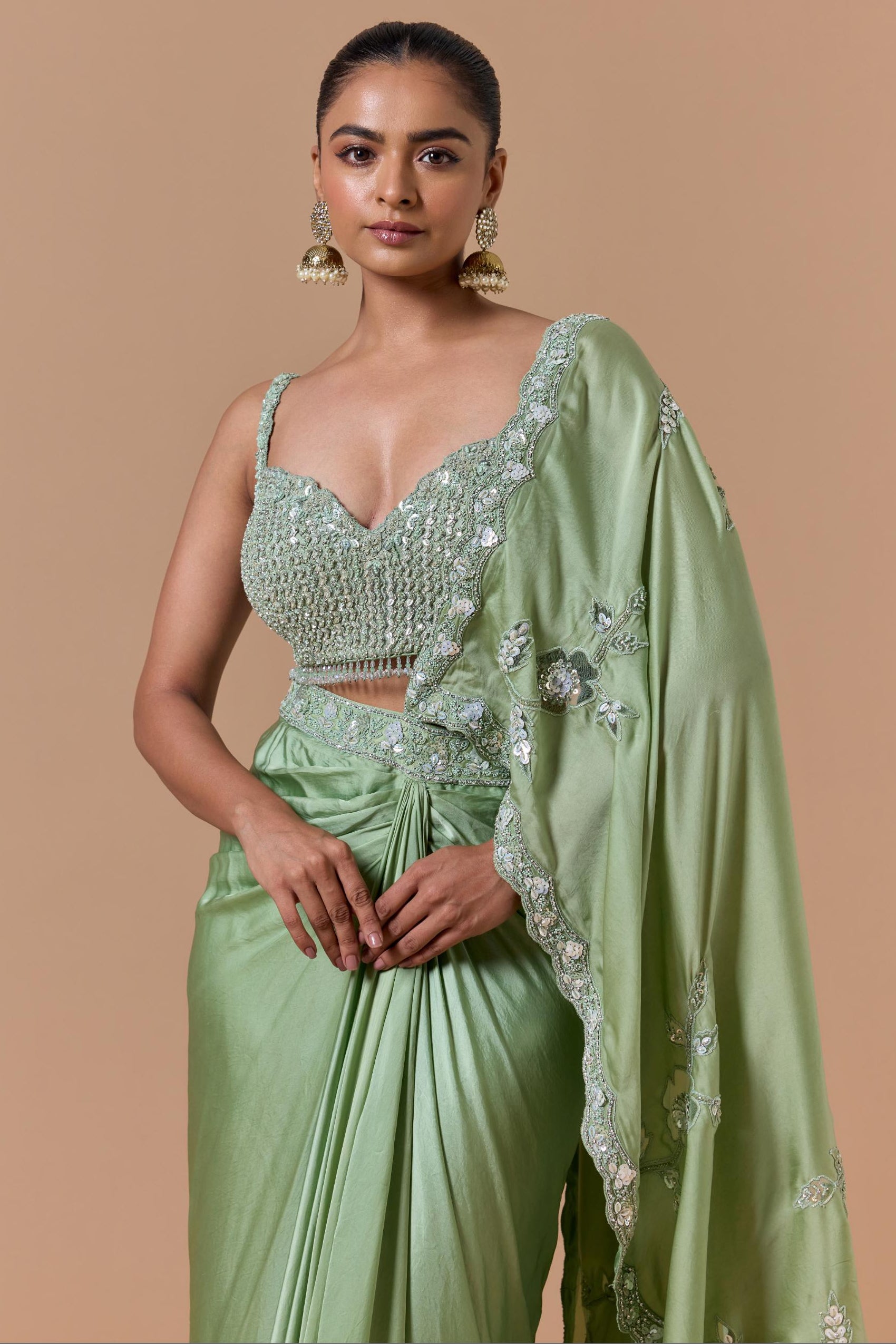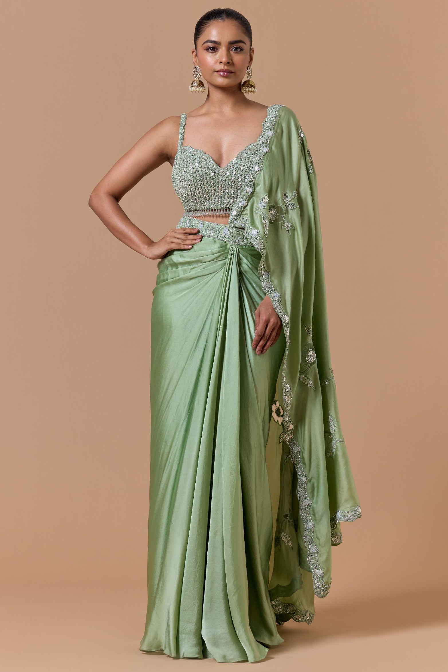 This jade green Navyaa draped saree is fresh, elegant, and modern—perfect for outdoor weddings, cocktail nights, and vibrant festivities. Its striking color adds a refreshing twist to classic draping.