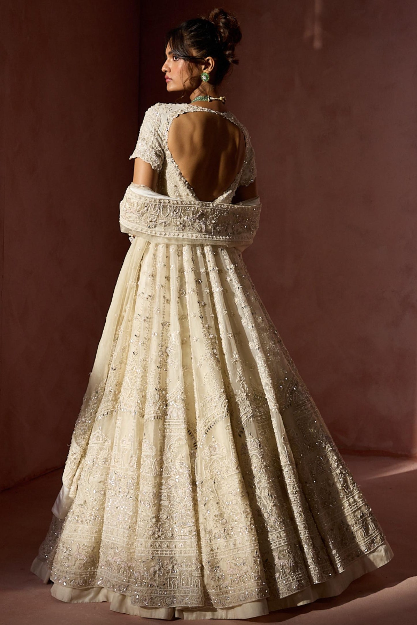 Elegant, structured, and luminous, this lehenga set features kalidar movement with subtle shimmer. The off-white tone enhances the sophistication of the lehenga set. Lightweight drape keeps the lehenga set comfortable for long festivities. The paneled design elevates the lehenga set with graceful flow. Ideal for weddings, this lehenga set styles beautifully with gold jewellery. A timeless ensemble, this lehenga set defines understated luxury.