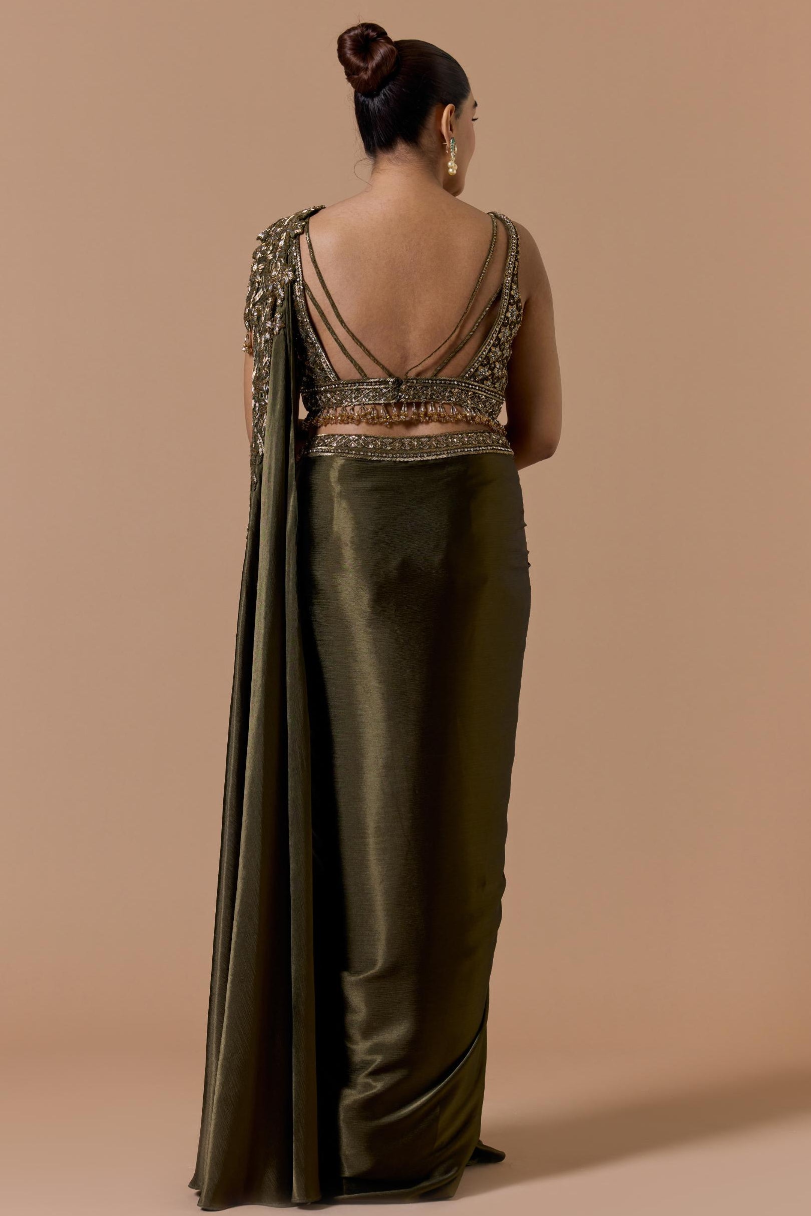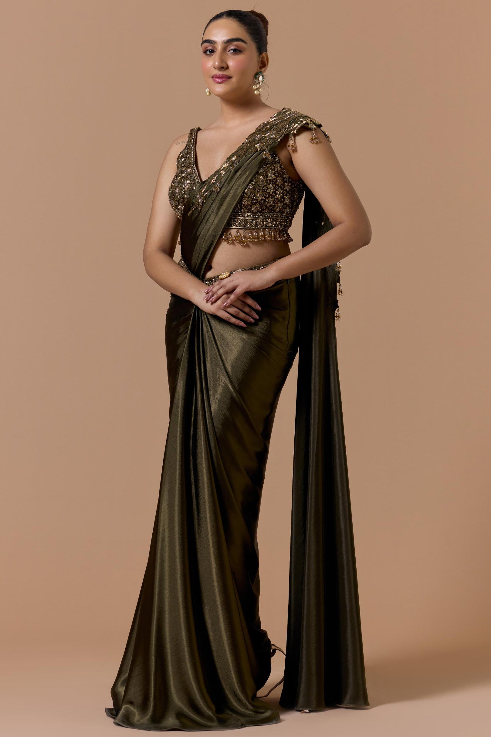 Elegant and earthy, this draped saree blends olive tones with fluid draping. Lightweight movement keeps the draped saree comfortable, while soft structure enhances the draped saree. Ideal for receptions, this draped saree pairs beautifully with antique jewellery. A refined ensemble, this draped saree adds quiet sophistication. Modern and graceful, this draped saree suits intimate and grand events alike.