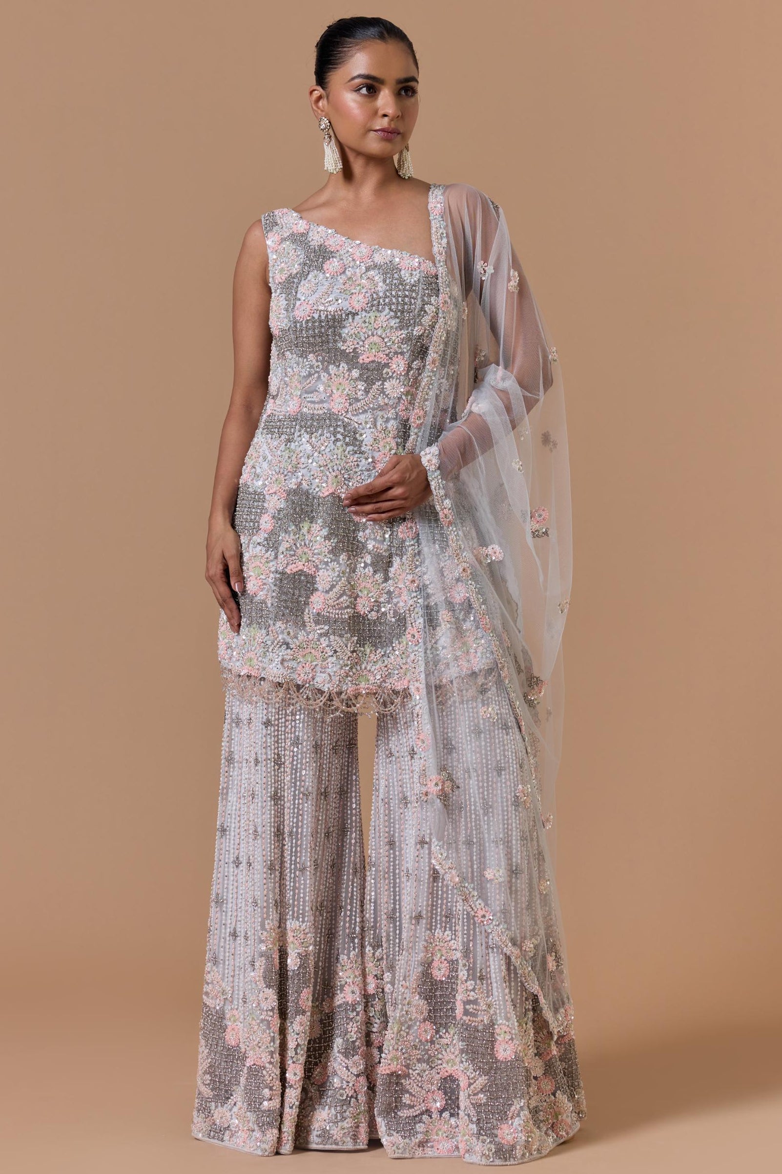 Elegant and contemporary, this sharara set blends sculpted design with fluid movement. Lightweight pants keep the sharara set comfortable for dancing and celebrations. The dramatic neckline elevates the sharara set, making it ideal for sangeets. Paired with statement earrings, this sharara set shines beautifully. Festive and chic, this sharara set flatters every silhouette. A modern ensemble, this sharara set suits vibrant celebrations.
