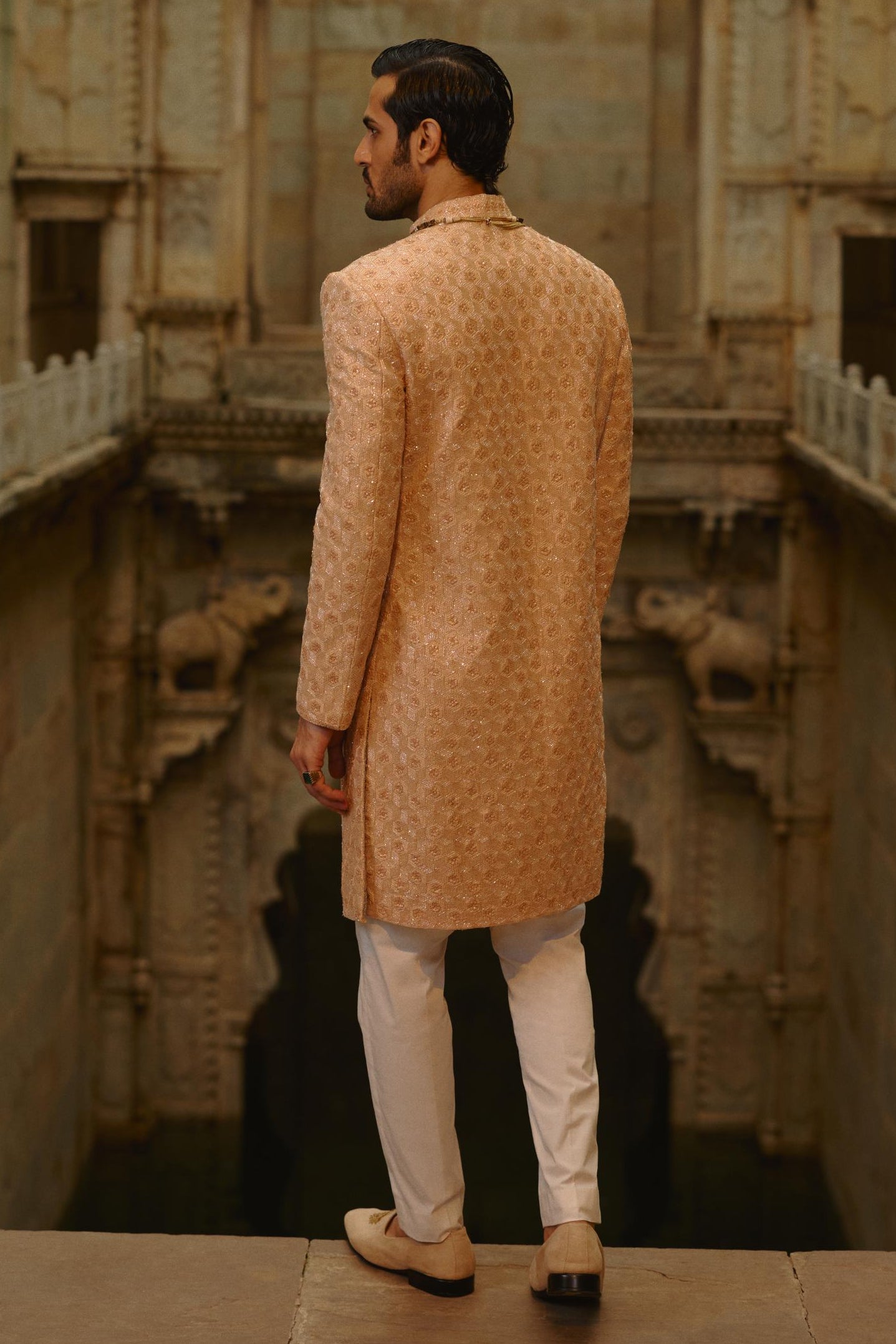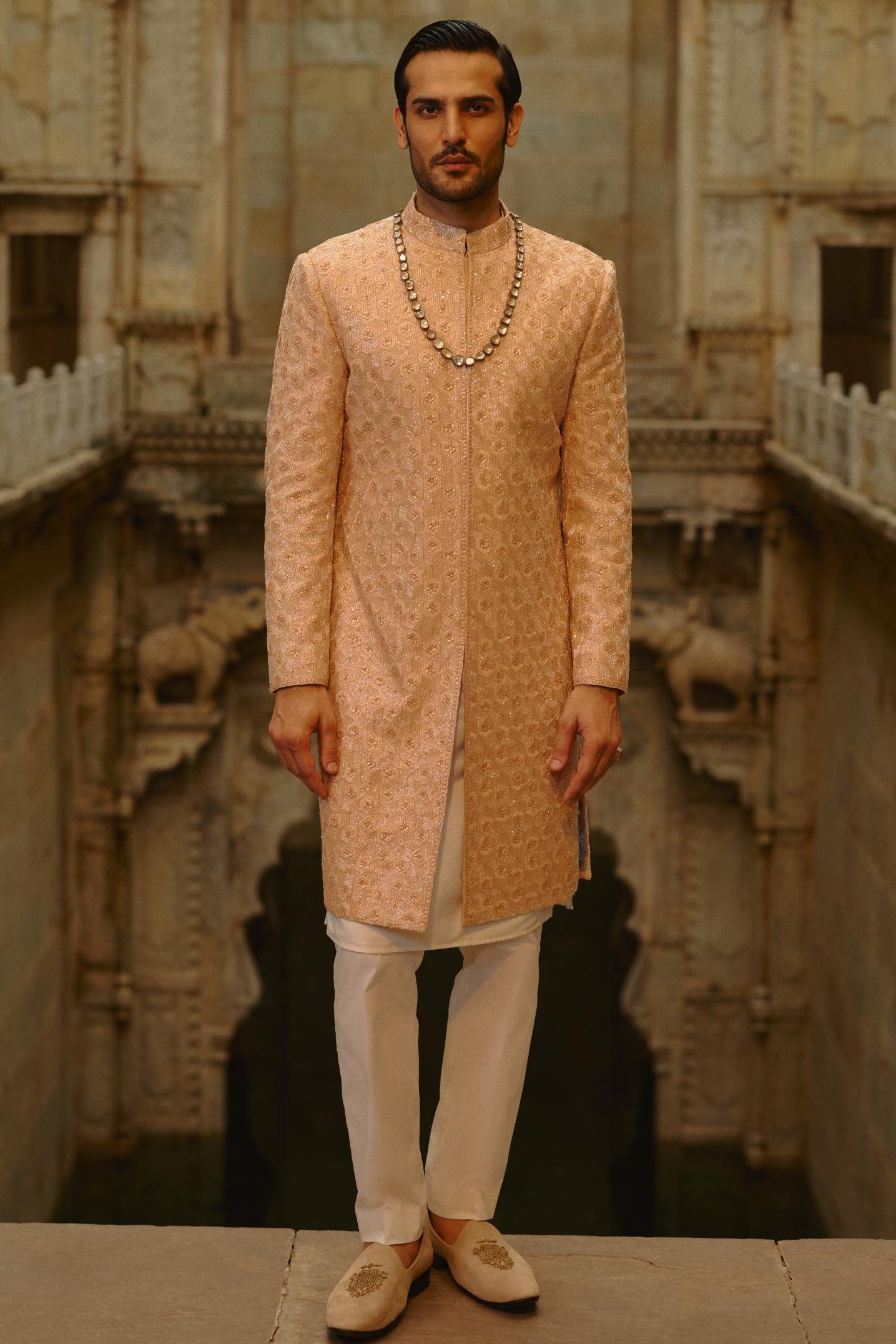 Polished and modern, this peach sherwani set blends geometric detailing with soft festive elegance. The breathable construction ensures the peach sherwani set stays comfortable during extended celebrations. Its warm tone enhances photography, allowing the peach sherwani set to shine in natural lighting. Perfect for daytime ceremonies, the peach sherwani set pairs effortlessly with ivory or champagne accessories. Ideal for refined celebrations, this peach sherwani set balances contemporary style with classic grace.