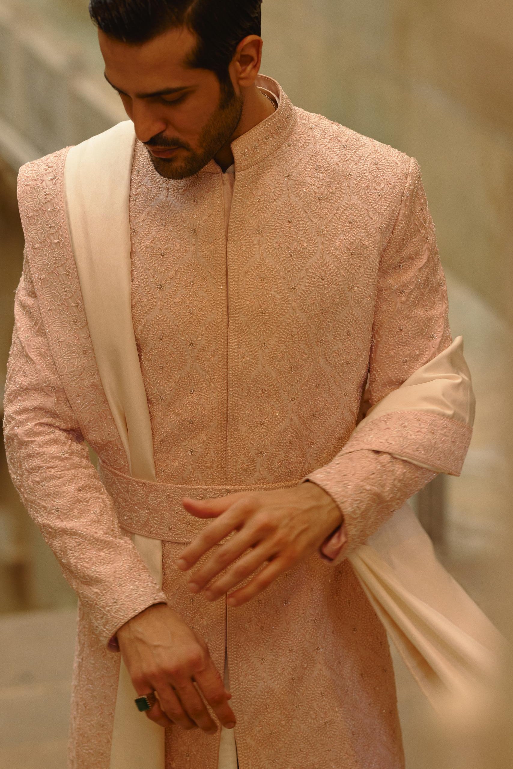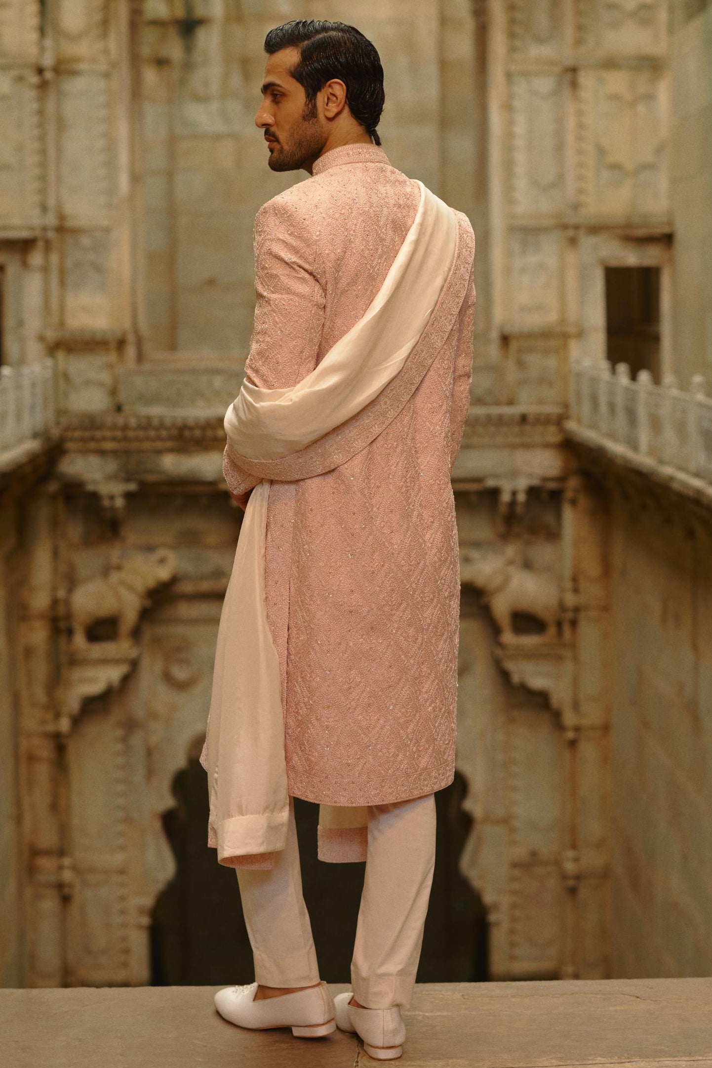 Fresh and elegant, this pink sherwani set pairs taffeta silk’s sheen with modern refinement. Ideal for daytime or destination celebrations, the pink sherwani set offers comfort and sophistication. Its pastel tone enhances photography, making the pink sherwani set ideal for spring or summer weddings. Pair this pink sherwani set with ivory accessories for a cohesive look. Designed for refined celebrations, the pink sherwani set blends youthful charm with timeless appeal.