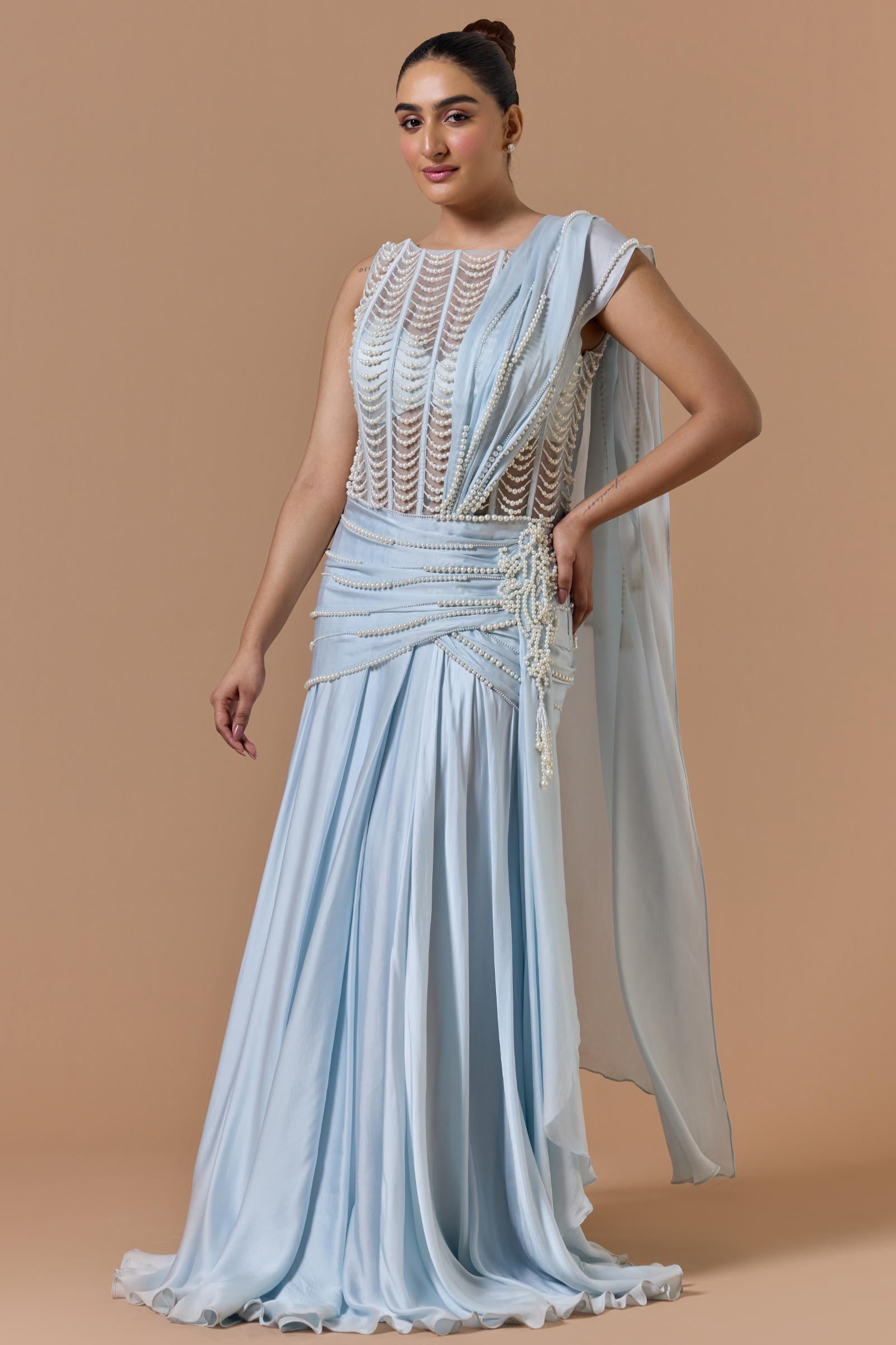 This powder blue Navyaa satin gown saree blends sculpted elegance with fluid draping—perfect for receptions, evening soirées, and elevated celebrations. Its satin structure creates a refined, modern look.
