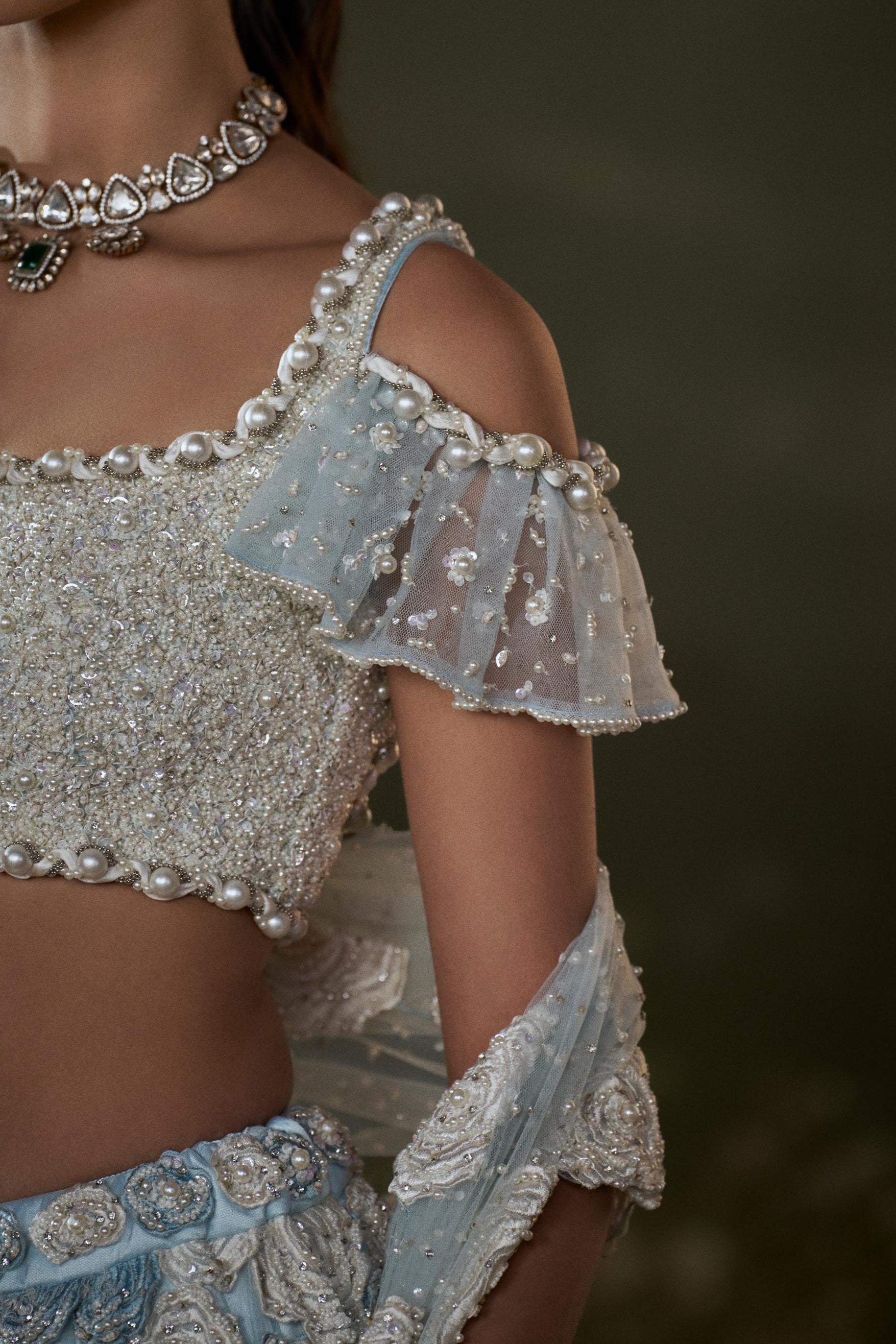 The Powder Blue Noor lehenga set is curated for serene daytime weddings and contemporary celebrations. The soft blue tone brings calm elegance, making it ideal for engagement ceremonies, daytime receptions, and destination weddings. Designed for graceful movement, this lehenga suits women who prefer subtle color palettes with refined styling.