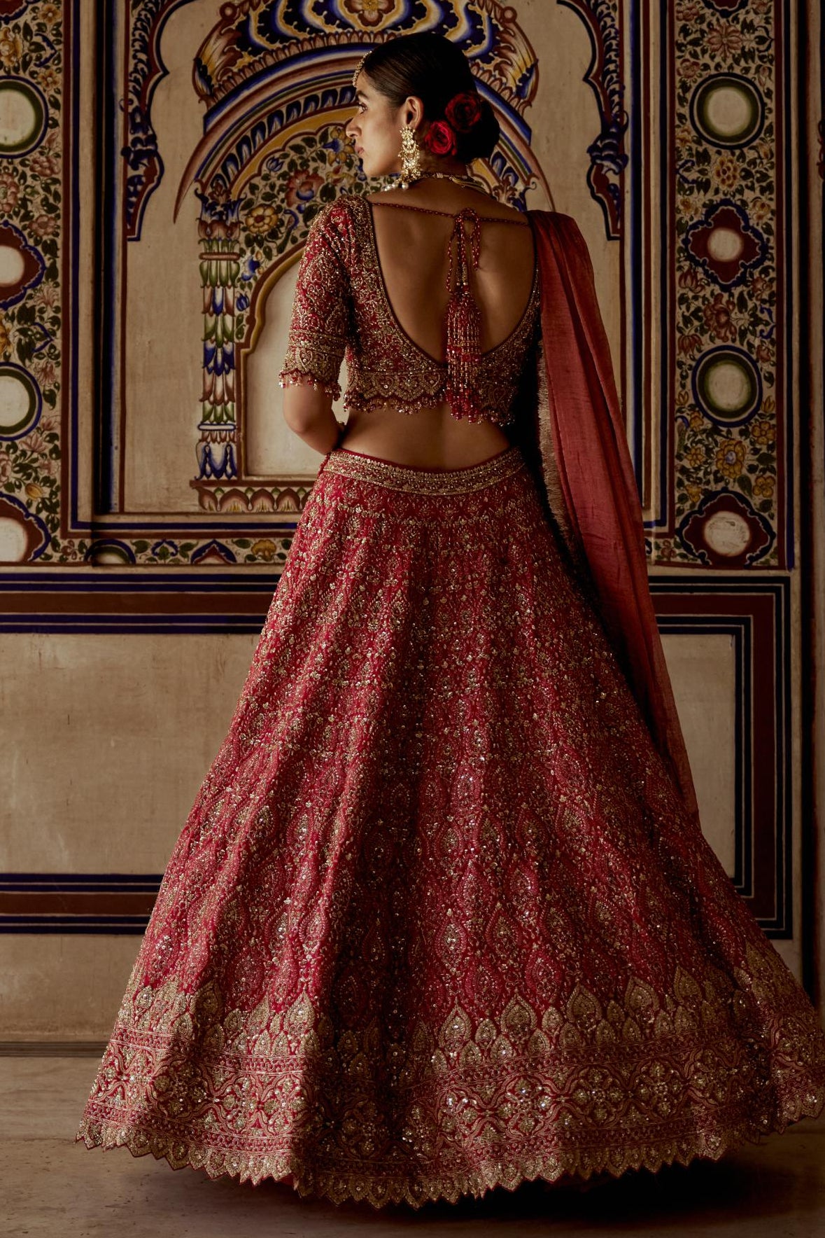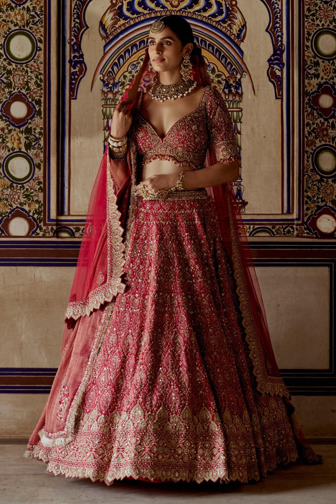 This red embroidered lehenga set symbolizes traditional richness, ideal for sangeets, weddings, and festive gatherings.