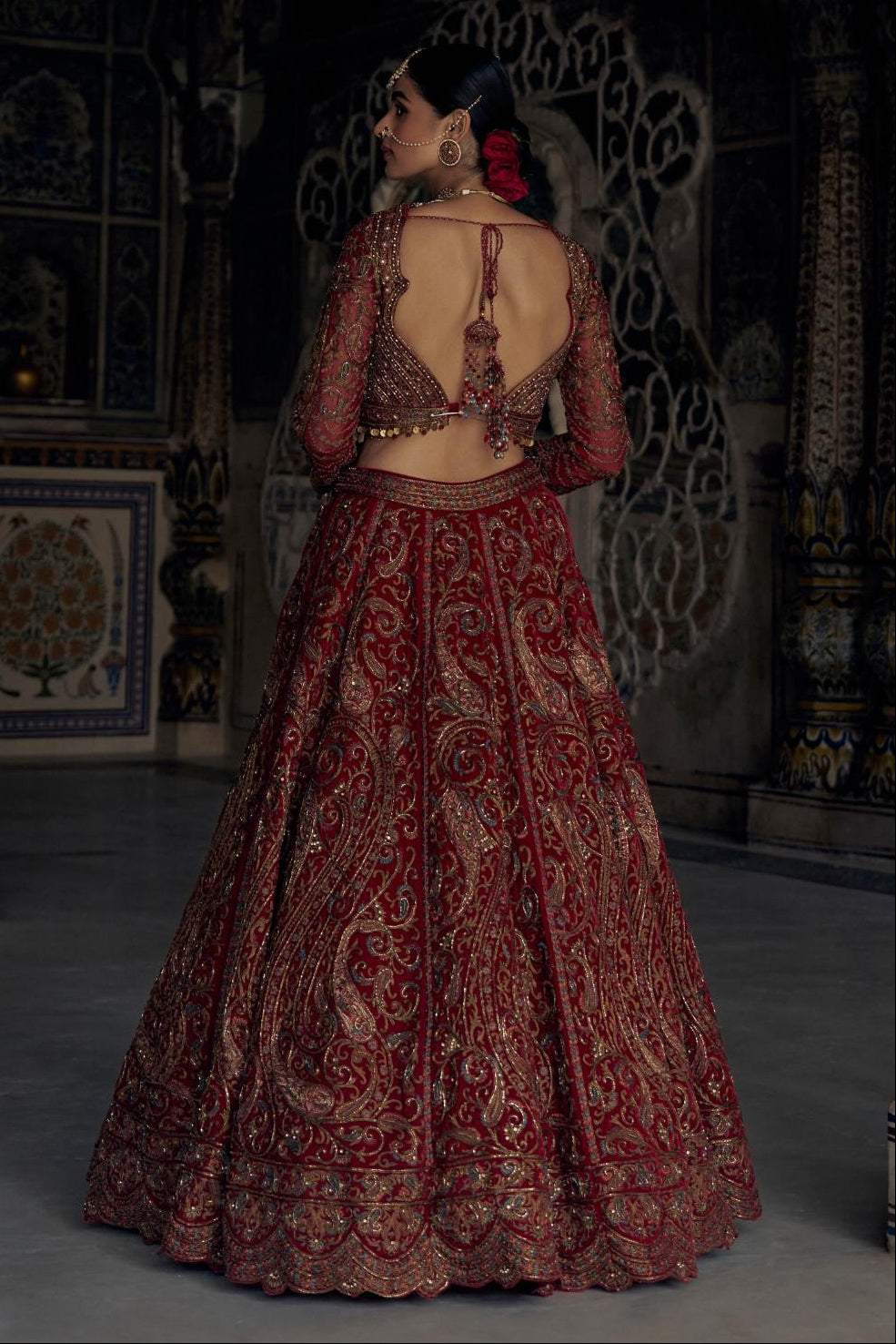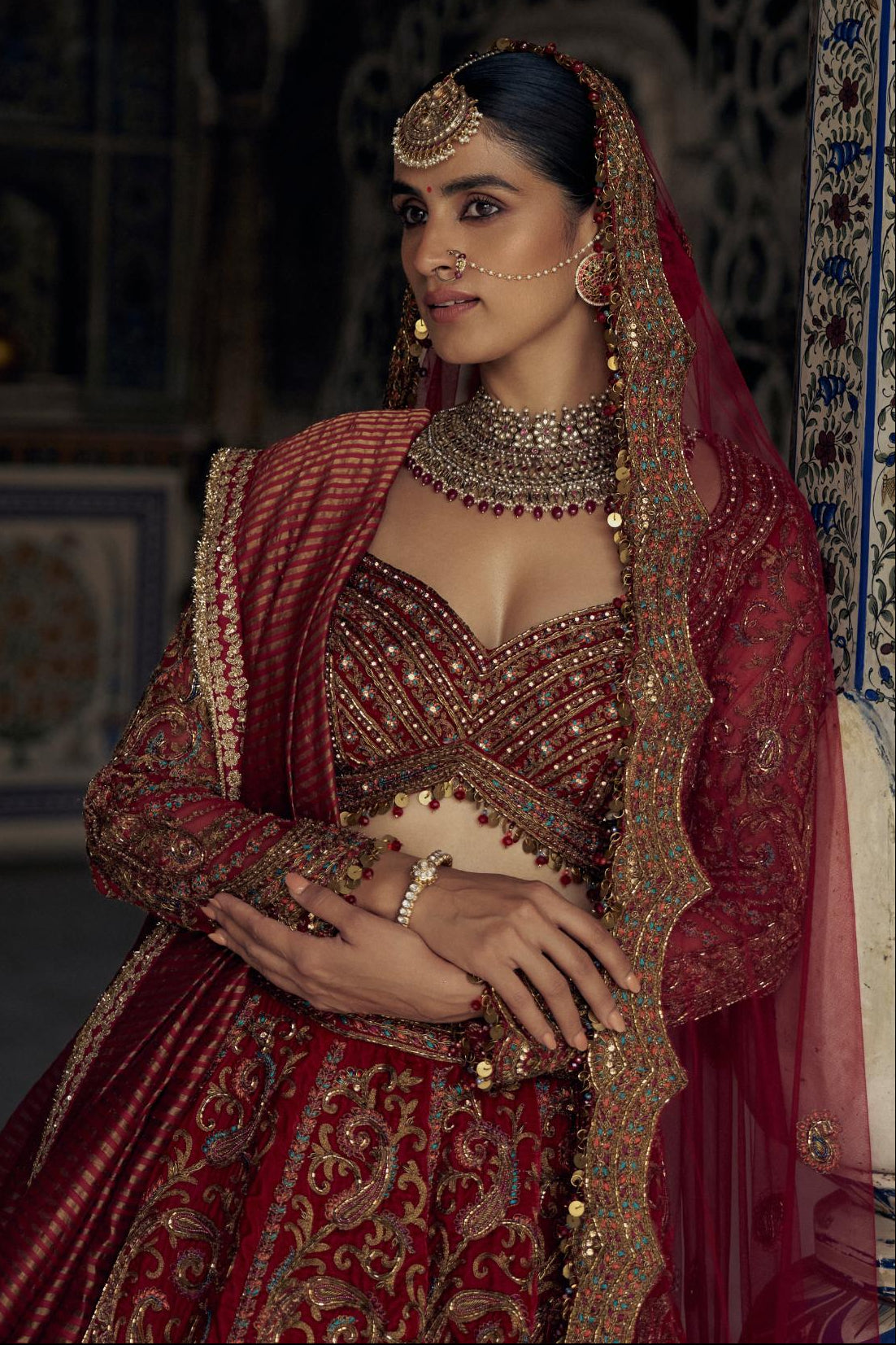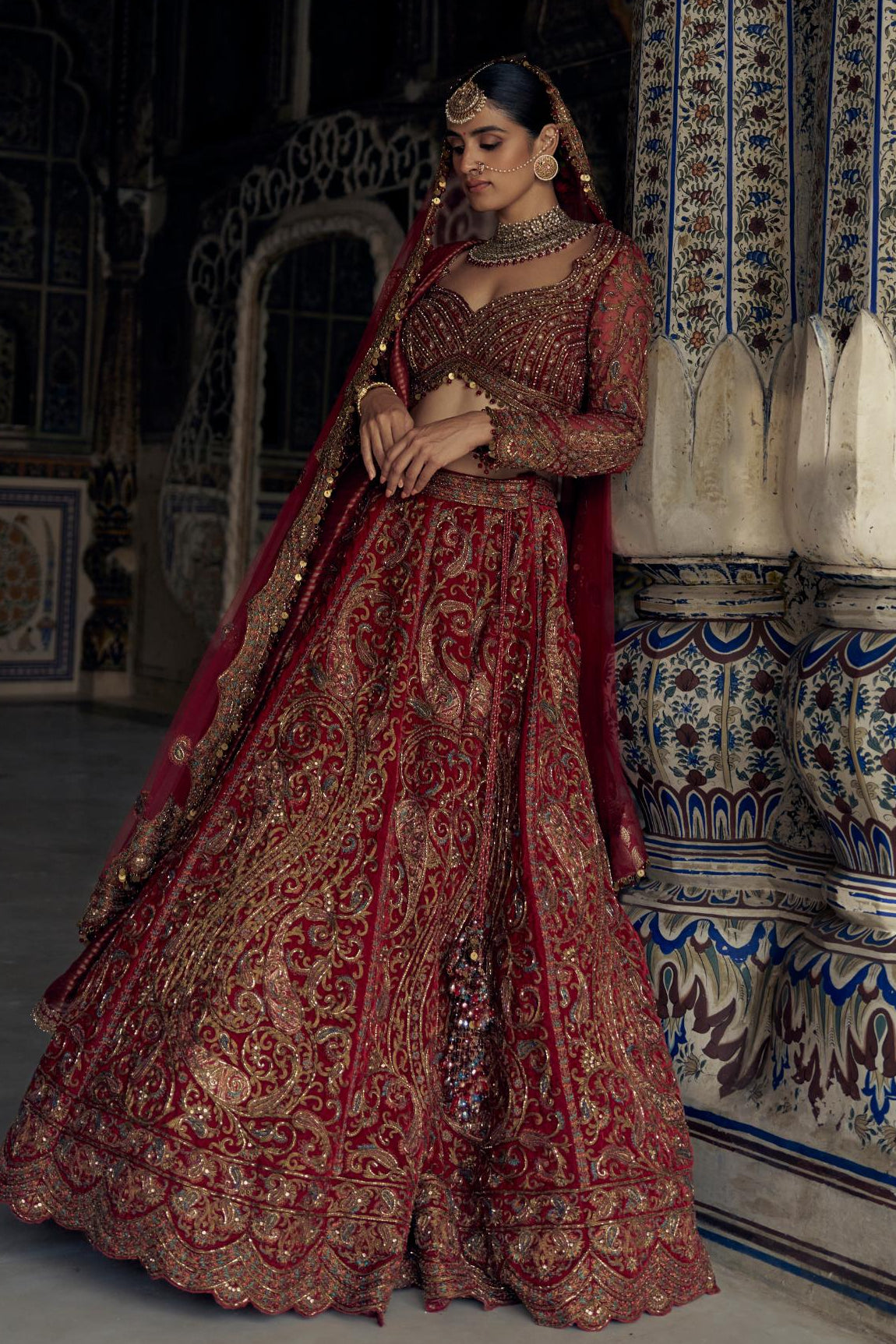 This antique-embroidered red lehenga set blends heritage craftsmanship with regal richness, making it ideal for sangeets, weddings, and festive nights.