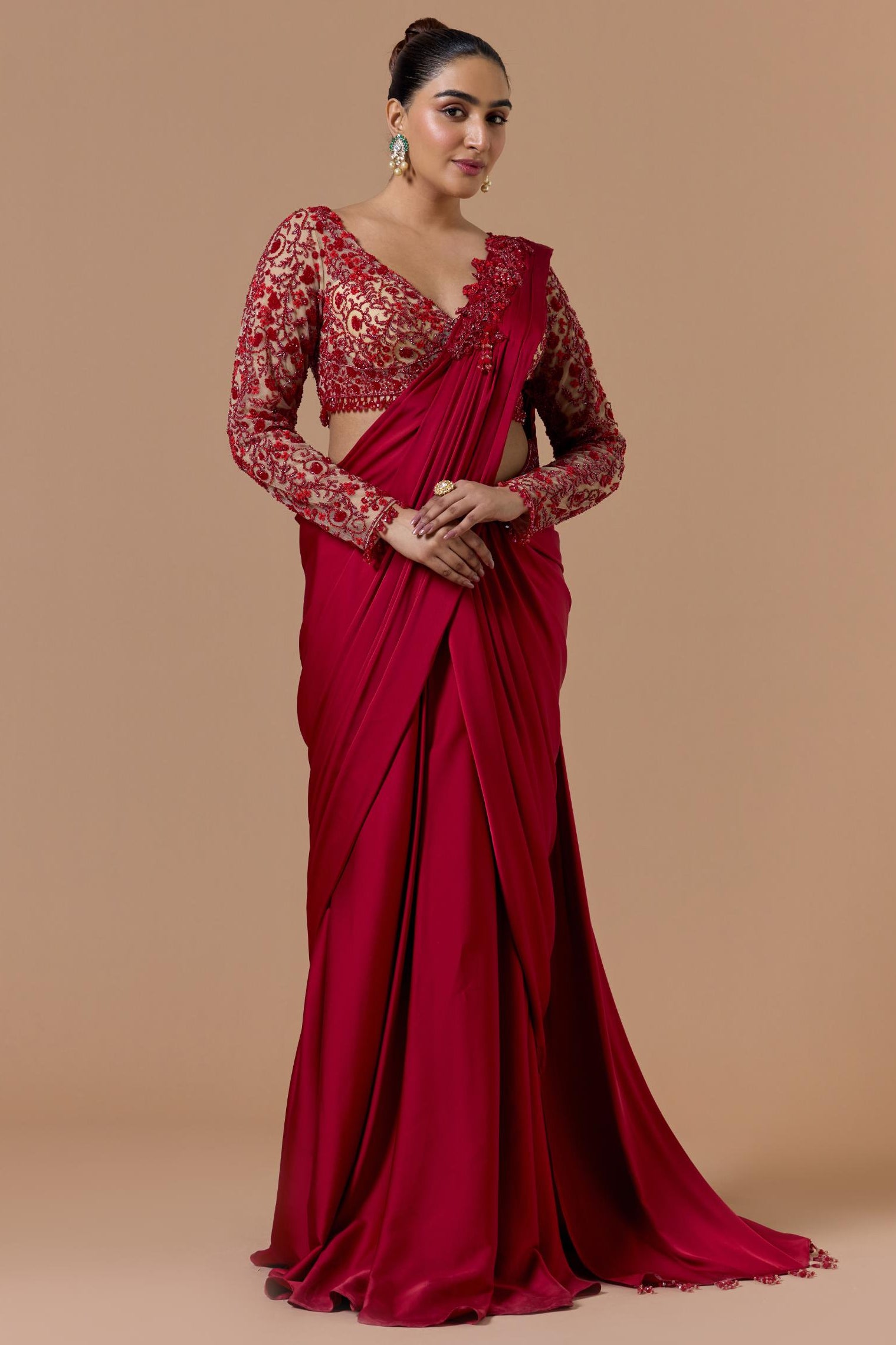 This red Navyaa draped saree paired with a nude blouse offers bold elegance—perfect for receptions, cocktail parties, or festive nights. The contrast adds a contemporary finish while preserving traditional charm.