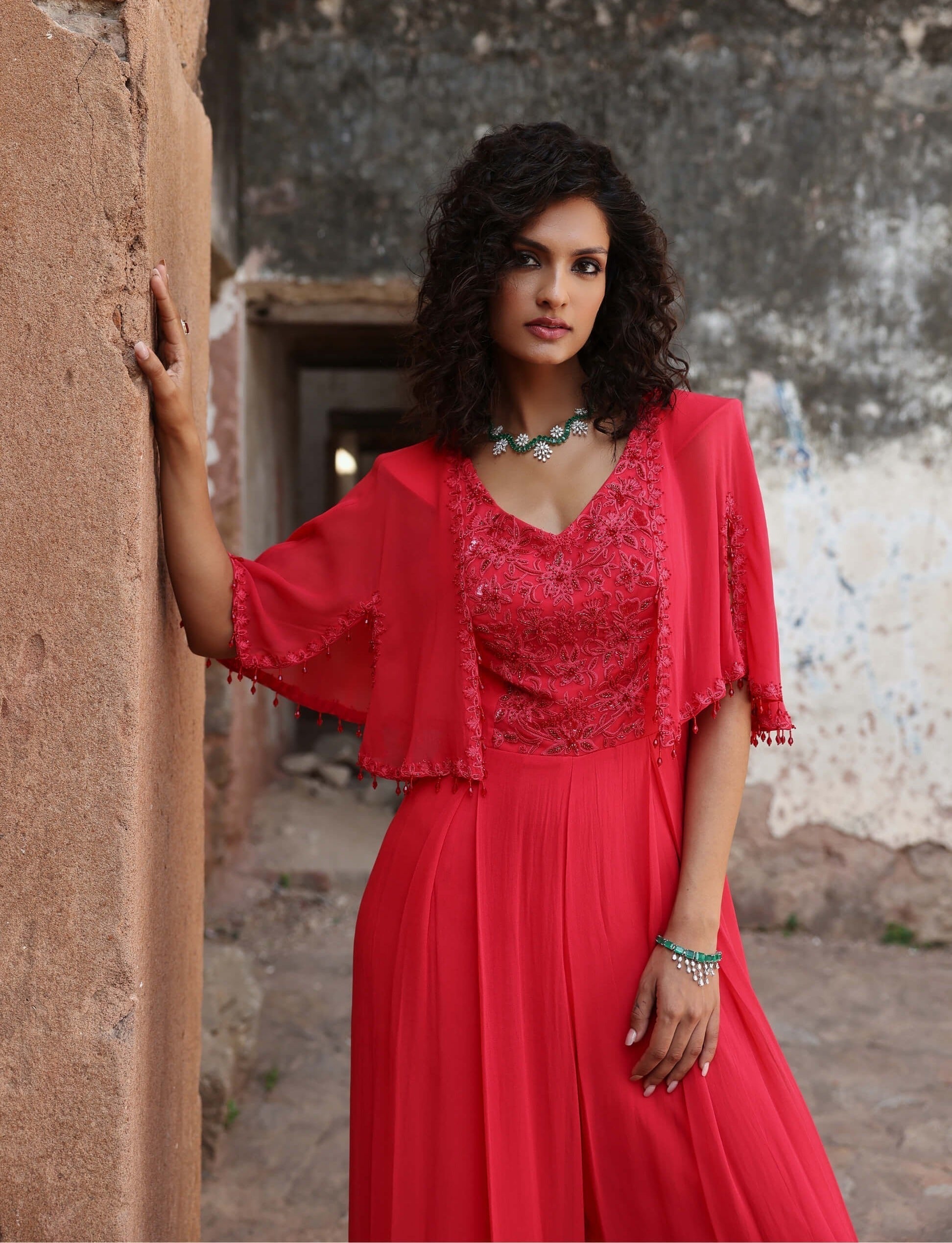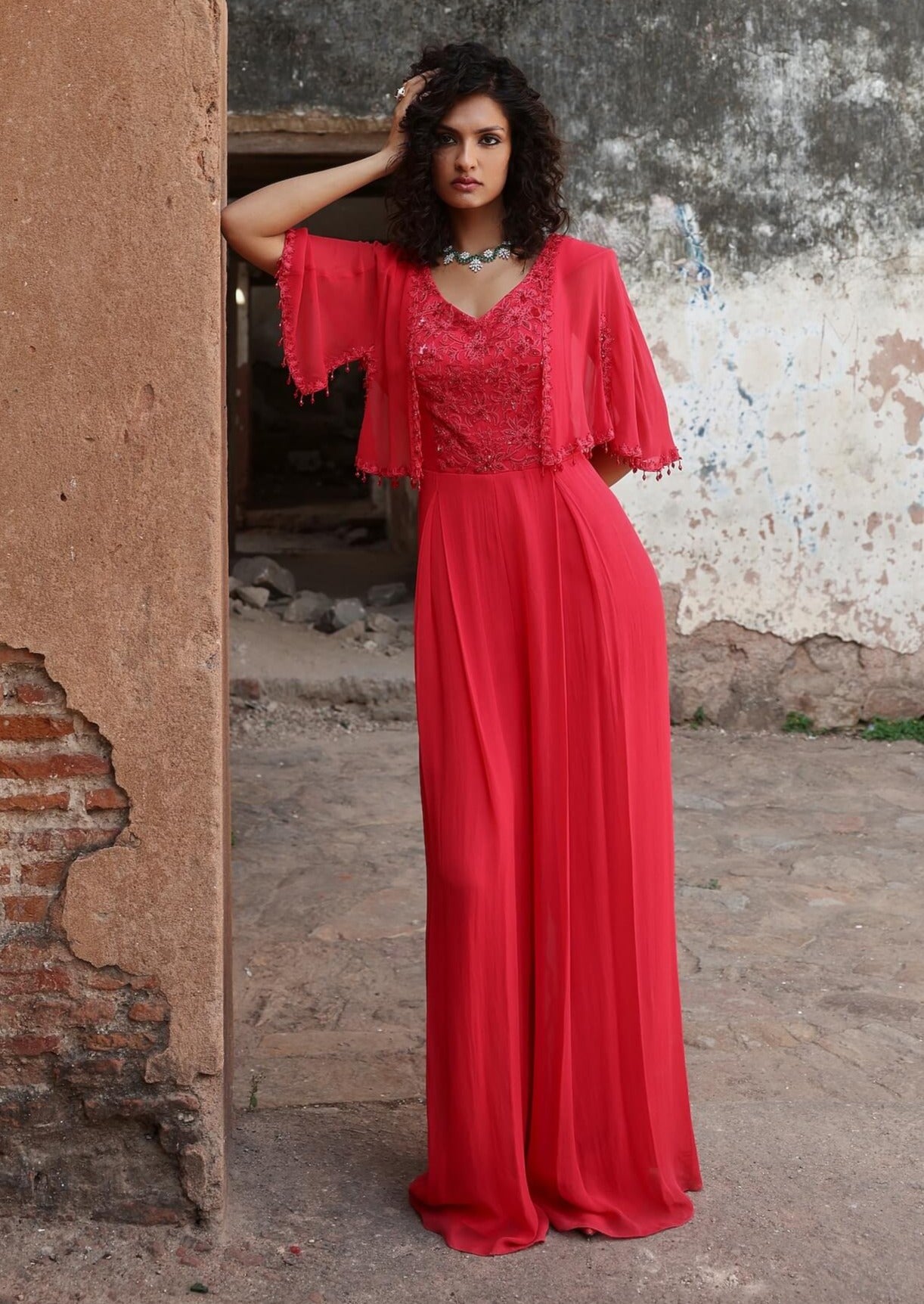 The niyati coral pink pleated jumpsuit features a stunning embellished bodice that adds a touch of glamour, complemented by chic shoulder pads for a structured silhouette. The soft coral pink hue enhances the overall elegance, making this jumpsuit perfect for both daytime events and evening occasions. Its modern design combines comfort with style, ensuring you make a memorable impression.