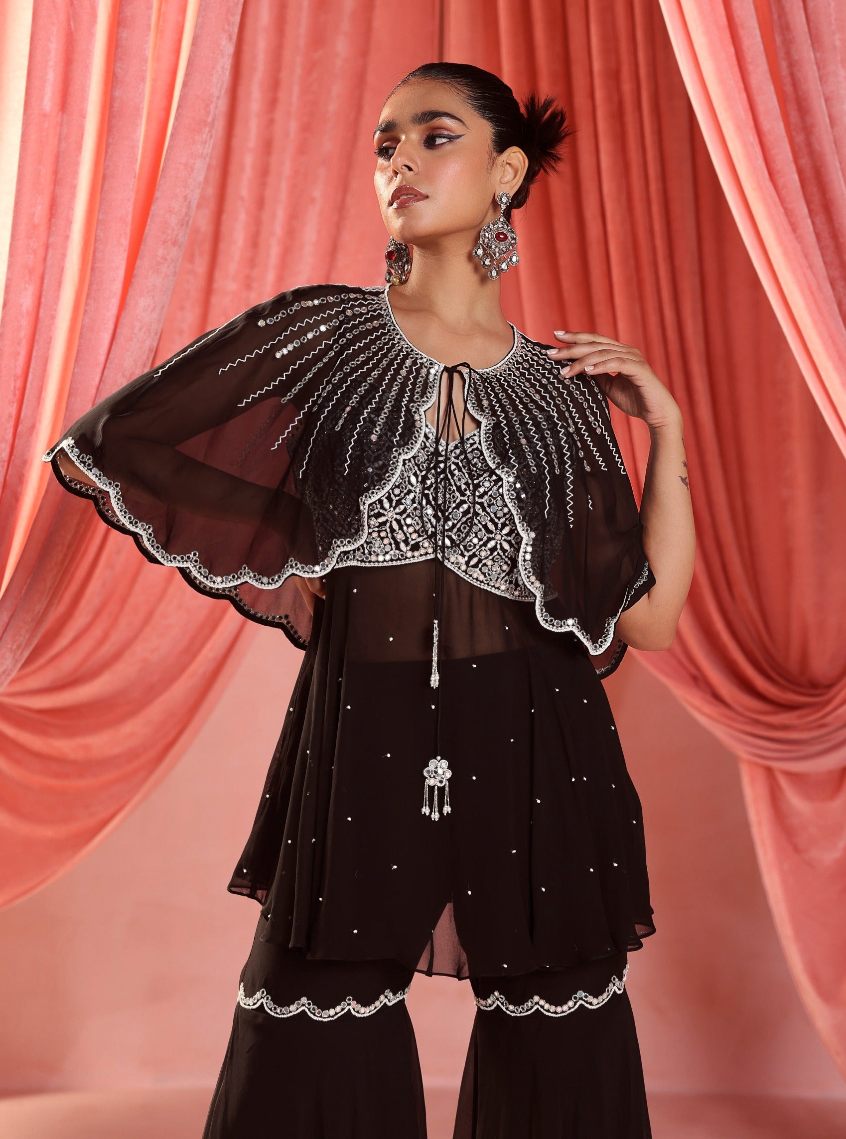 Discover unparalleled elegance with our stunning embellished cape, beautifully paired with a chic embellished peplum and gharara. This exquisite ensemble features a gracefully adorned cape that adds a touch of sophistication to any look. The peplum, also embellished with intricate detailing, enhances the outfit's allure, while the gharara completes the ensemble with its flowing, luxurious silhouette. Ideal for high-profile events and special occasions, this combination seamlessly blends traditional charm with contemporary style. Crafted from premium fabrics with meticulous attention to detail, this outfit promises both glamour and comfort. Elevate your wardrobe with this exceptional and versatile design, perfect for making a memorable impression.