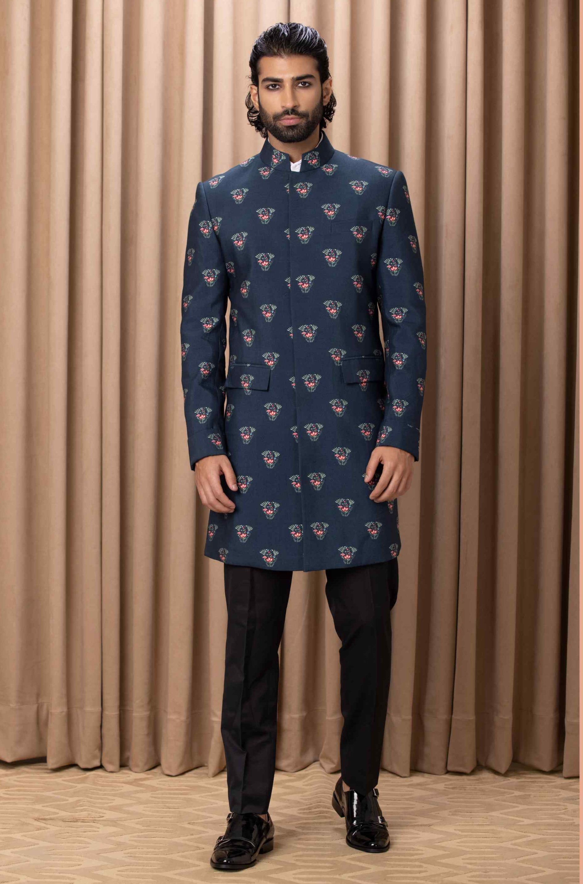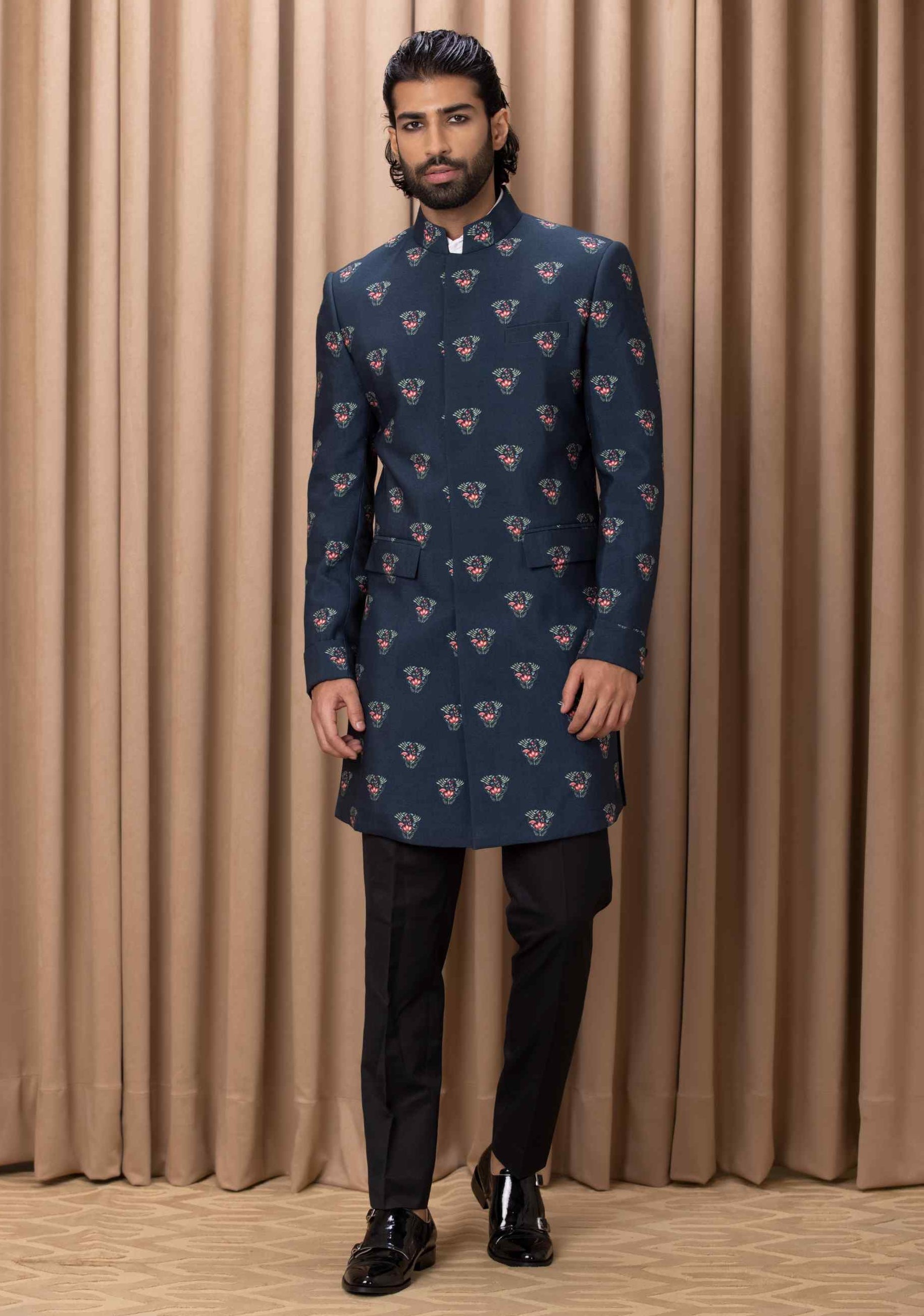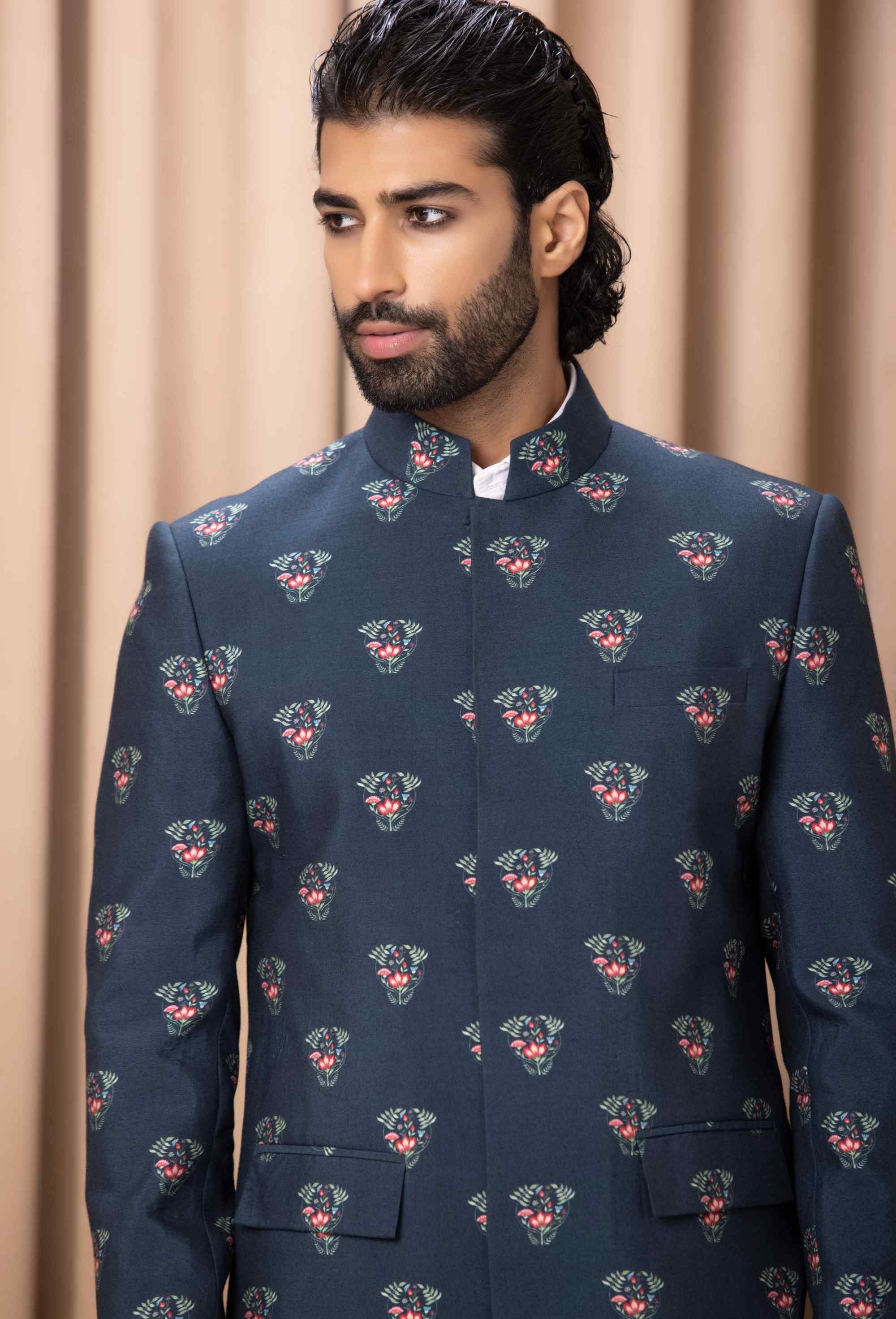Unveil a fresh take on elegance with our contemporary digital-printed hand-painted navy blue Indo-Western set. Perfect for a sagan or cocktail occasion, this ensemble features a strikingly printed jacket adorned with artistic hand-painted designs, paired seamlessly with a sleek black Chinese collar shirt and classic black suiting trousers. The set combines modern flair with traditional sophistication, ensuring you make a standout impression with refined style and creativity at your next event.