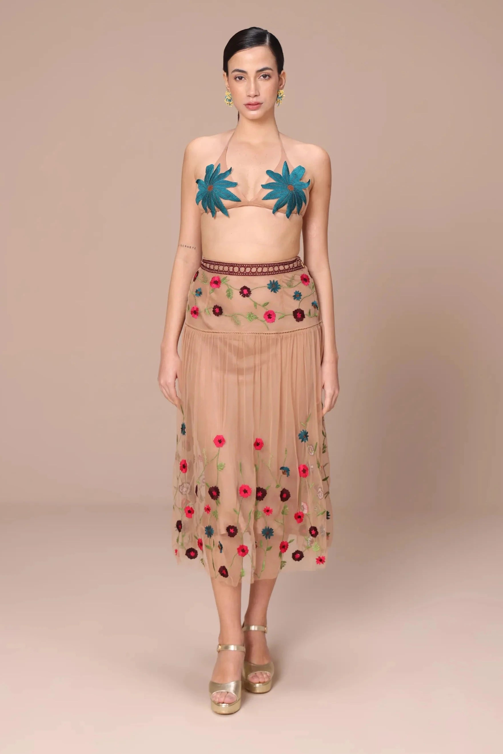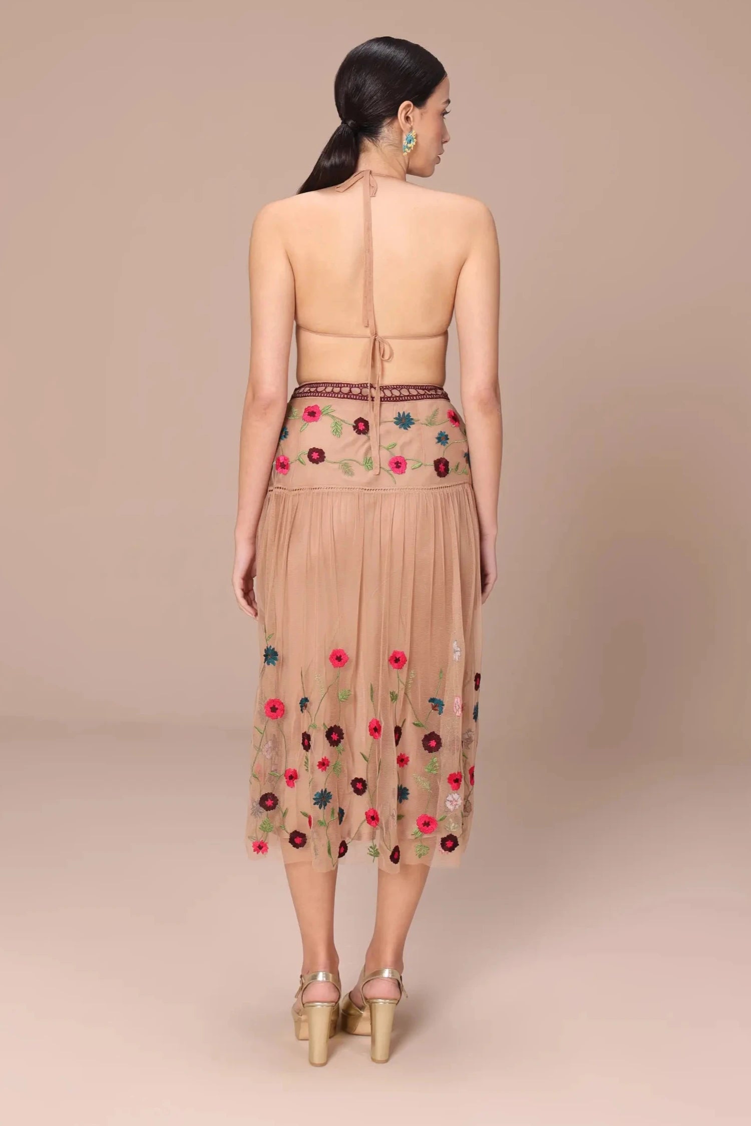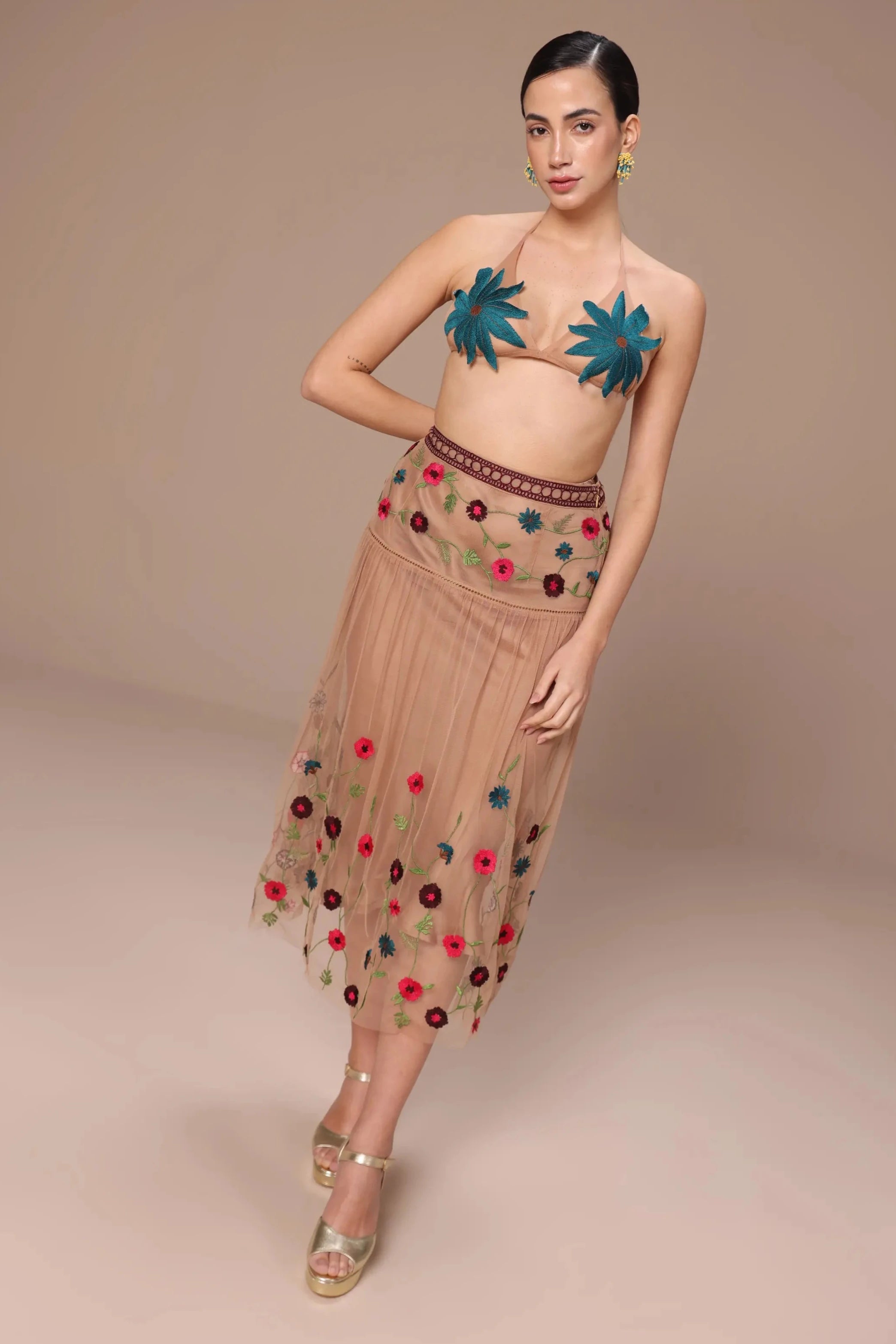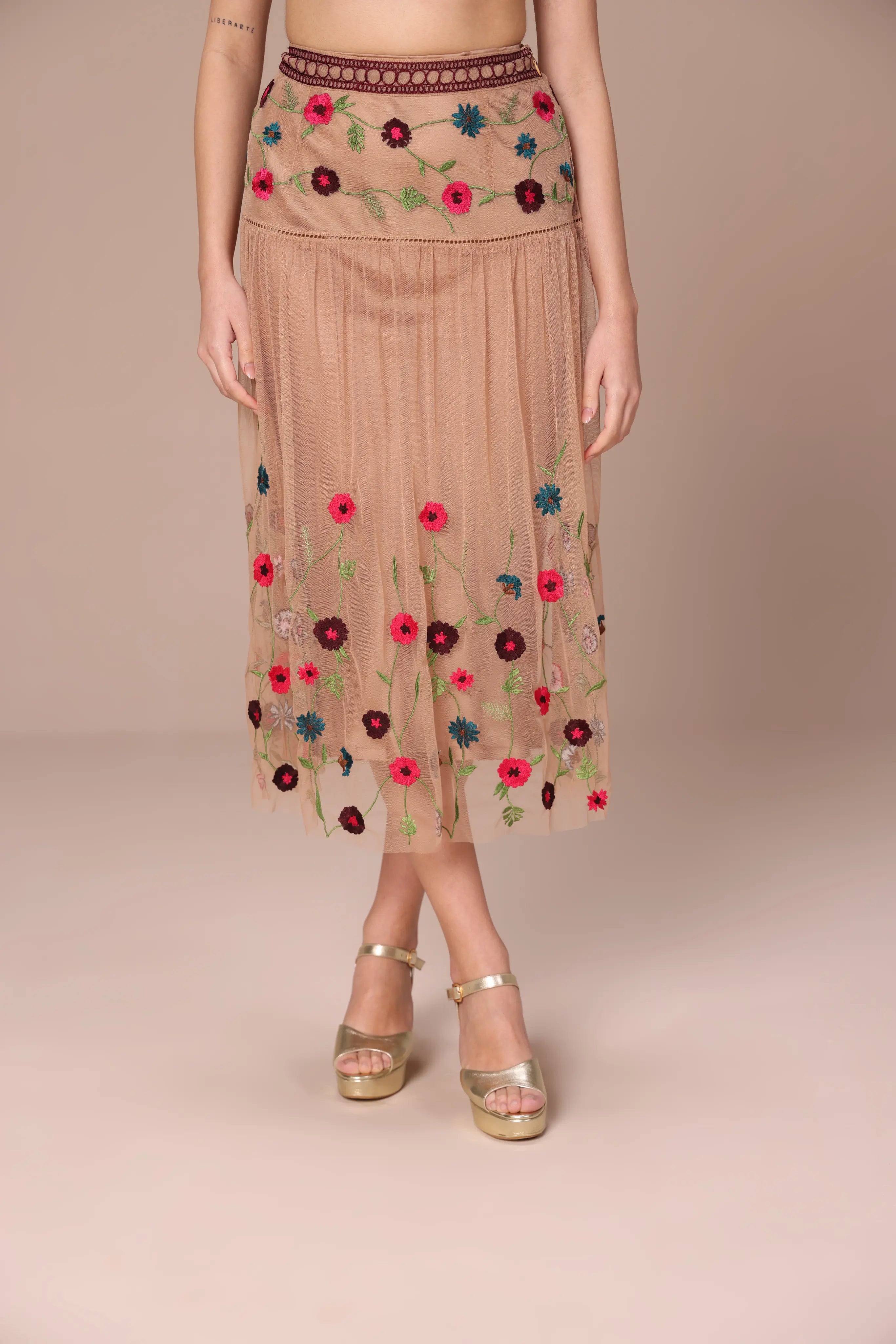 The Nude with Multicolor Embroidery Midi Skirt combines a soft nude base with stunning multicolor embroidery for a bold yet elegant look. Featuring intricate floral or geometric designs, this midi skirt offers a flattering silhouette thatÕs perfect for both casual and dressy occasions. Its versatile length and vibrant embroidery make it an eye-catching statement piece that pairs effortlessly with a simple top or blouse. Add a touch of color and texture to your wardrobe with this beautifully crafted skirt.
