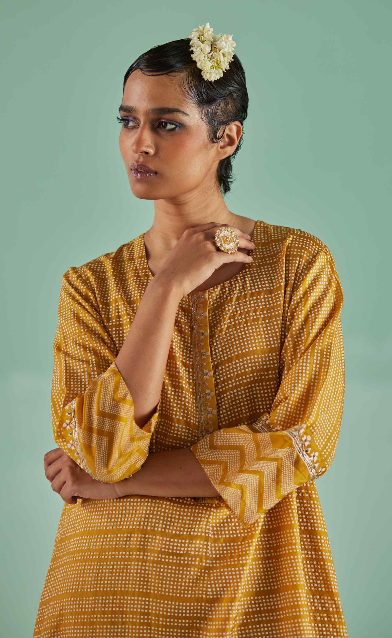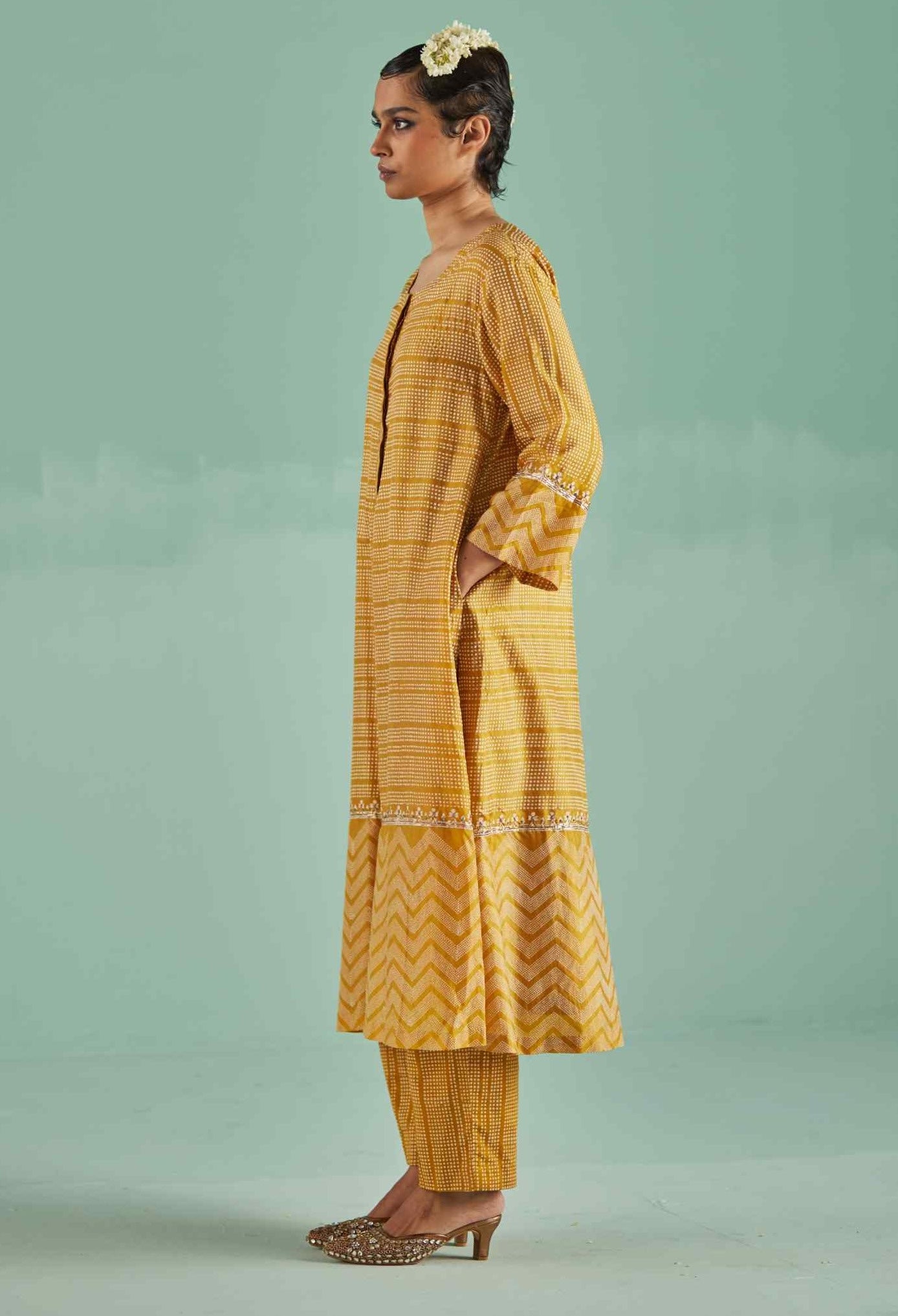 Introducing our ochre kurta, a refined piece that elegantly combines tradition with contemporary style. This stunning kurta features custom block printing in a subtle beige, which is further elevated by exquisite dabka and bead embroidery, adding a touch of sophistication and texture. Paired with a matching printed wide-hem trouser, this ensemble offers a seamless blend of classic charm and modern flair. Ideal for refined and stylish occasions, this outfit promises to make a lasting impression with its unique design and meticulous craftsmanship.