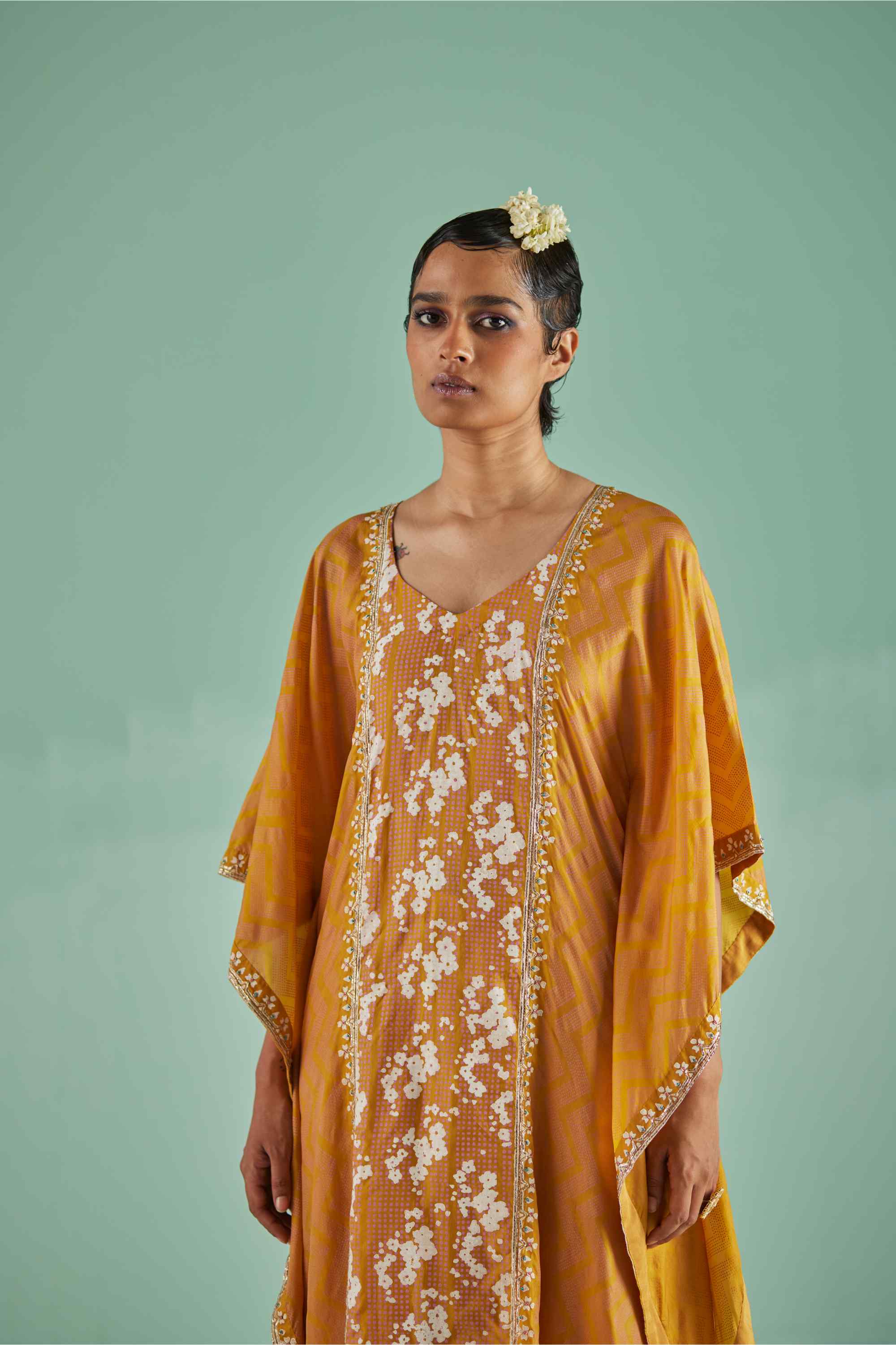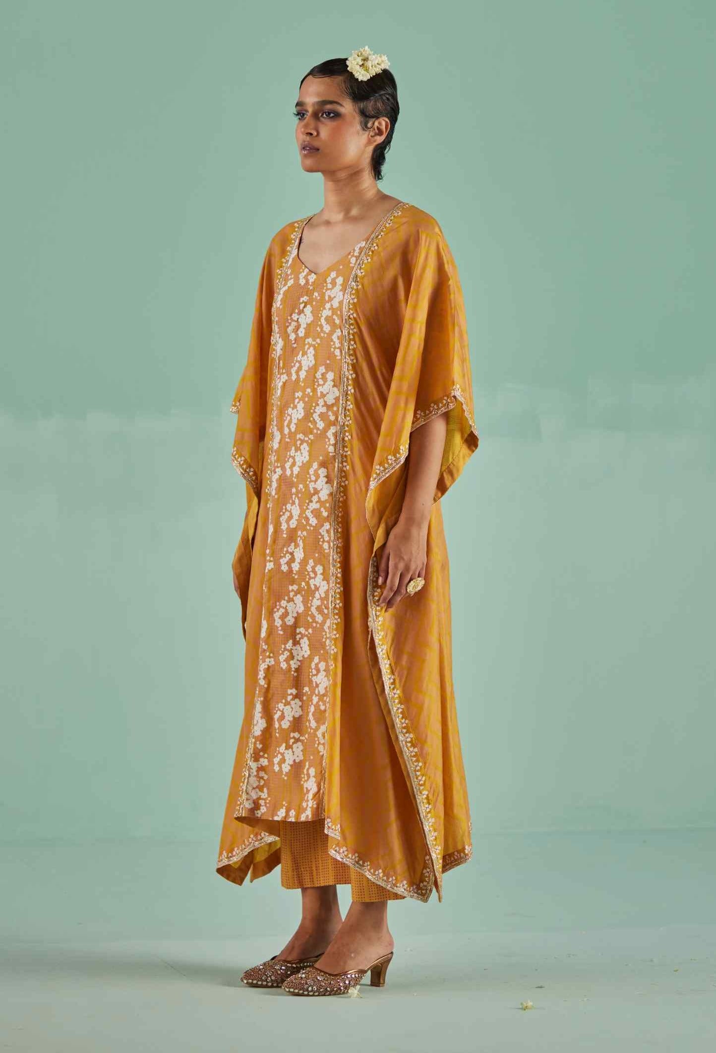 This ochre kaftan showcases exquisite custom block printing in a vibrant combination of pink and beige. Enhanced with intricate mirror, dabka, and bead embroidery, it adds a touch of sophistication. Paired with a matching printed blouse and trouser, this ensemble perfectly merges traditional charm with modern style, making it ideal for a standout look at any special event.