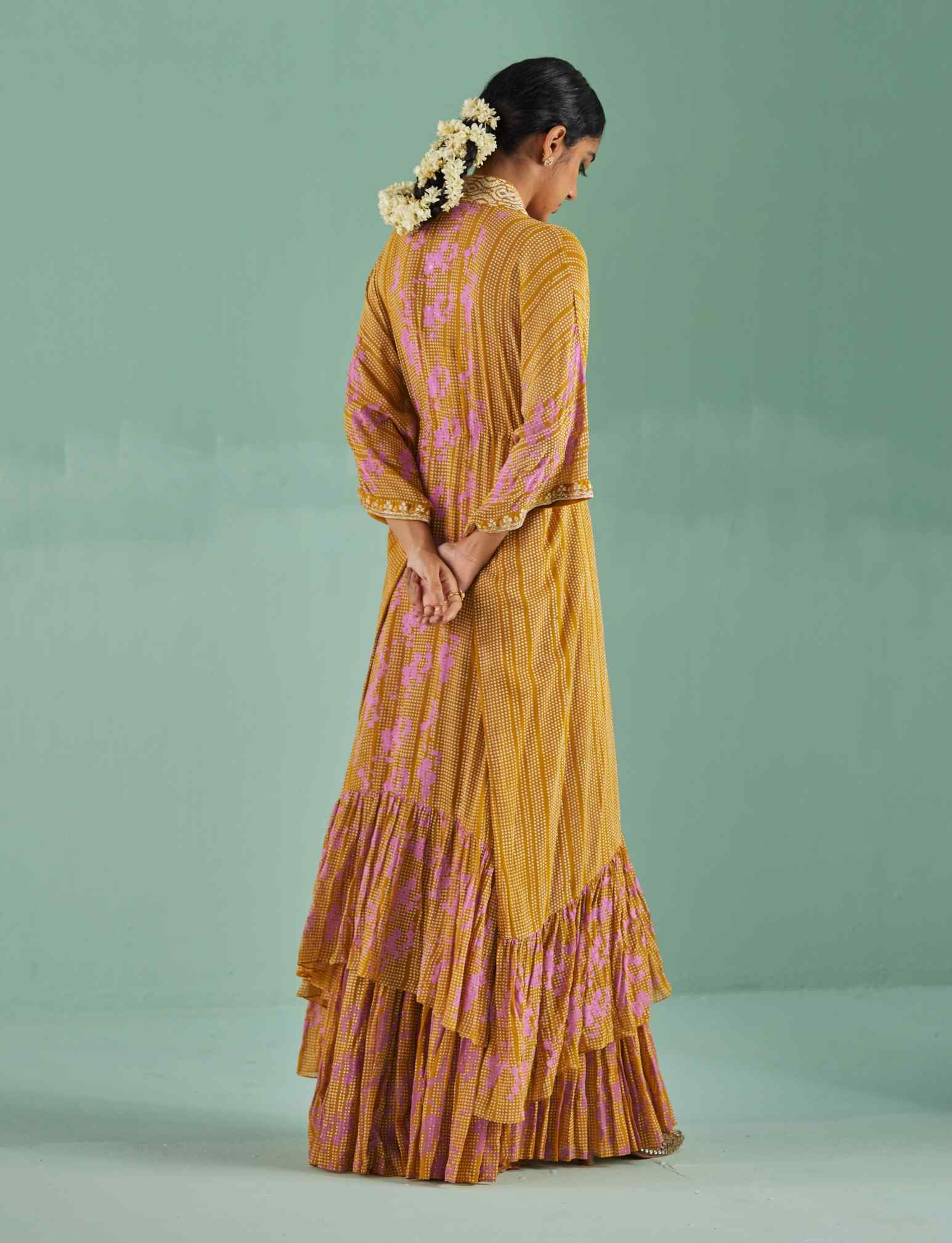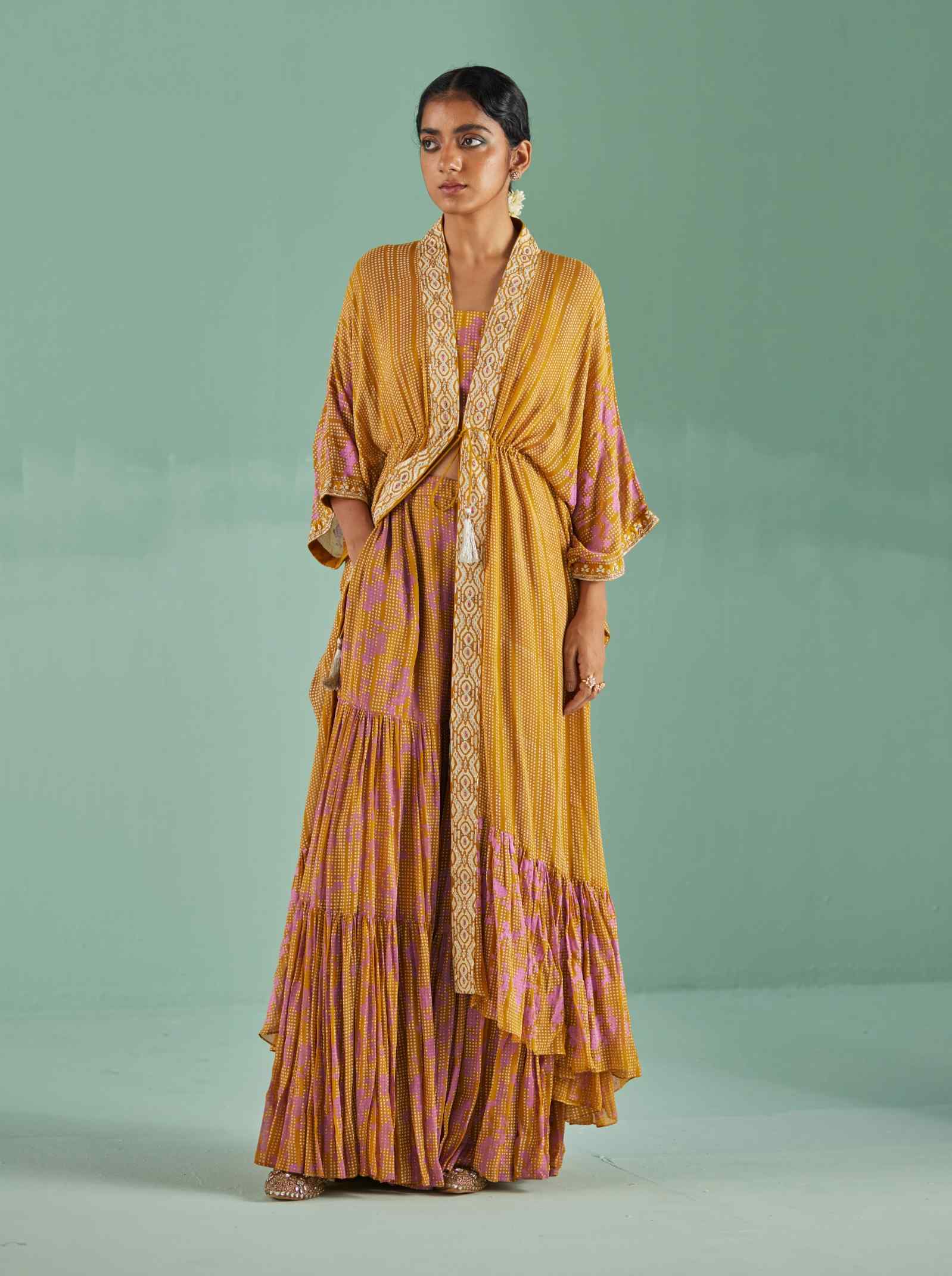 Immerse yourself in elegance with this striking ochre cape, adorned with custom block prints in a harmonious blend of pink and beige. The cape features intricate mirror, dabka, and bead embroidery, creating a rich tapestry of textures and sparkle. Paired with a coordinating printed blouse and a tiered sharara, this ensemble offers a perfect fusion of traditional craftsmanship and contemporary style, ideal for making a memorable impression at any special occasion.