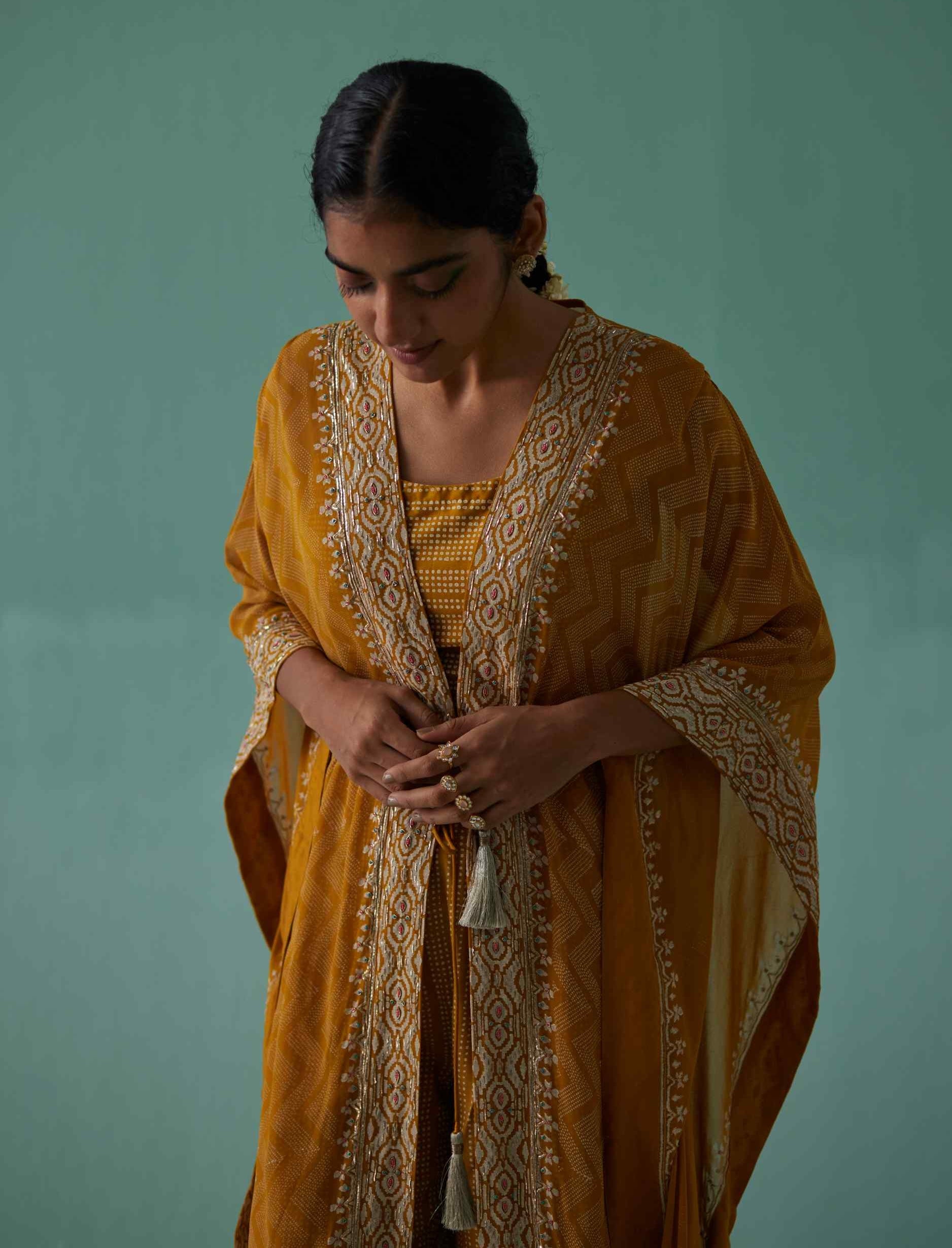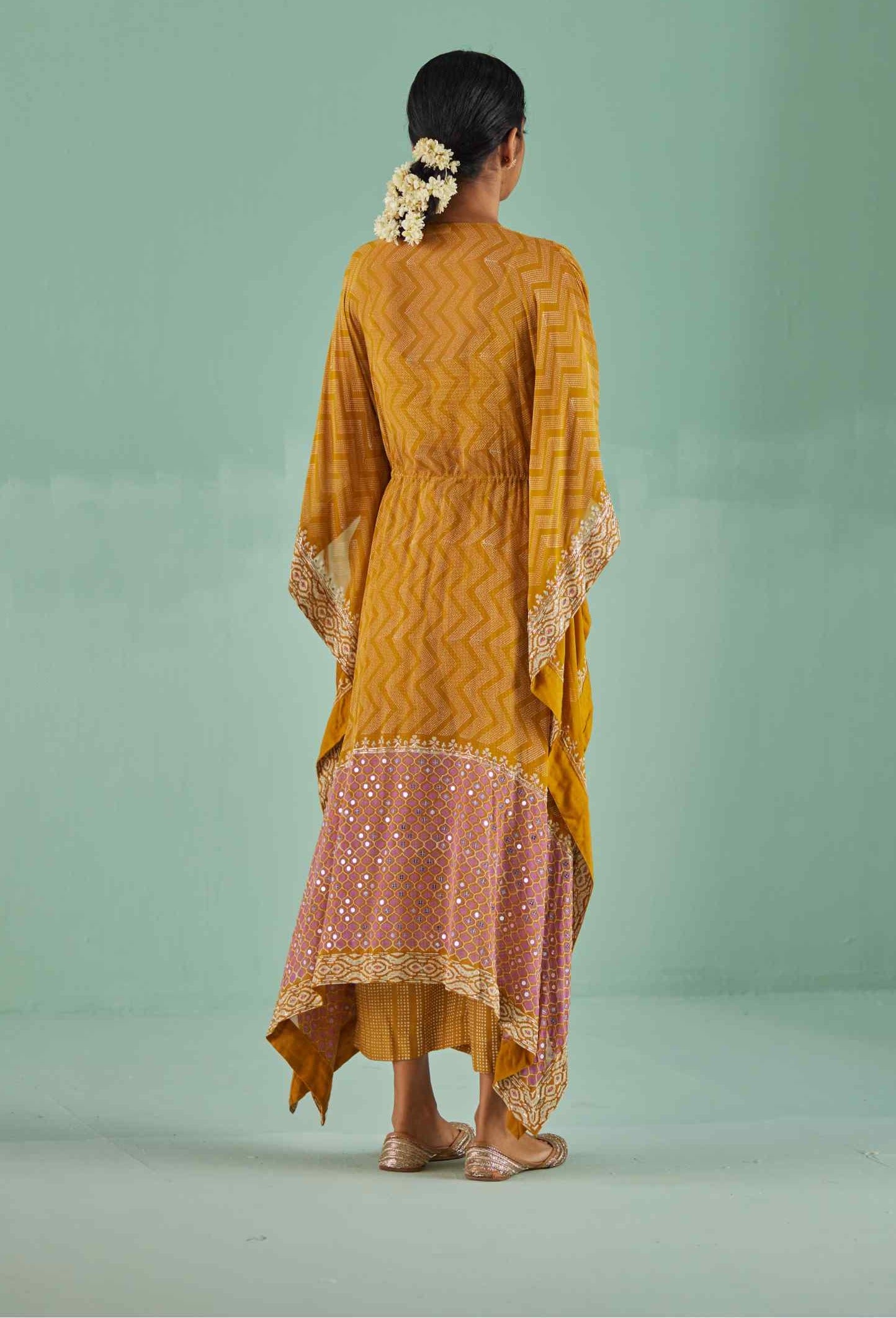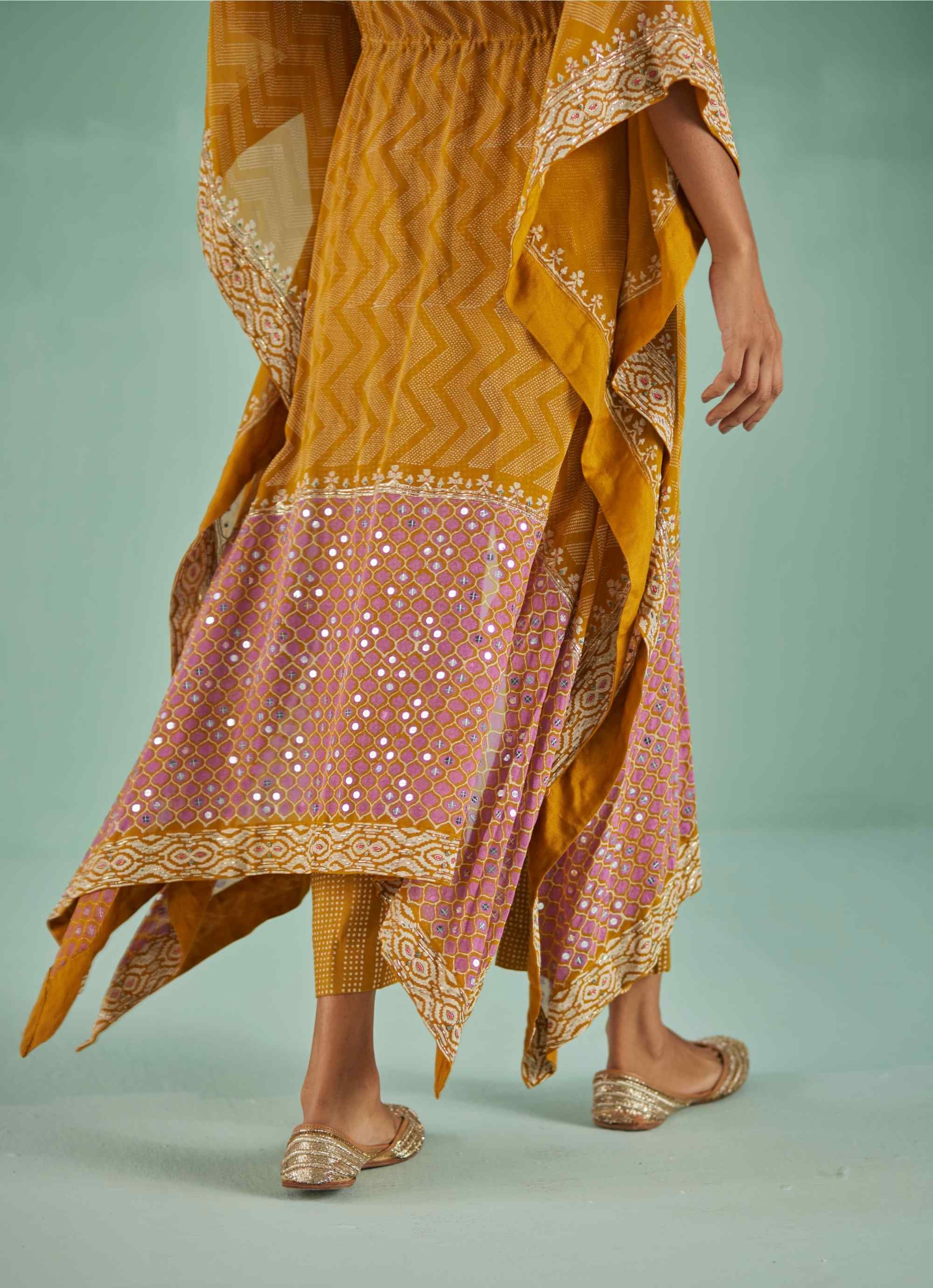 This ochre kaftan features custom block printing in a striking blend of pink and beige. Adorned with exquisite dabka, mirror, and bead embroidery, it offers a sophisticated and eye-catching design. Paired with a coordinating printed blouse and trouser, this ensemble effortlessly combines traditional elegance with contemporary style, perfect for making a memorable impression at any event.