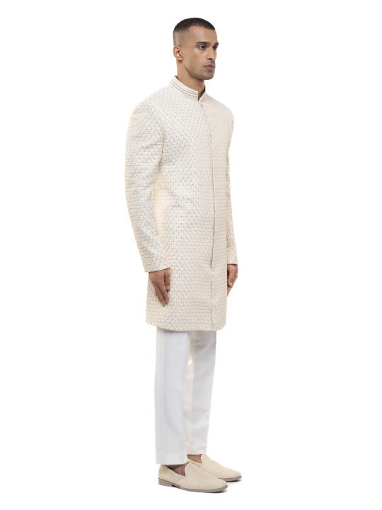 Exquisite and refined, this Off-White Silk Beaded Embroidery Sherwani Set is crafted from luxurious silk adorned with delicate beadwork that adds subtle sparkle and texture. Featuring a stand collar, concealed placket, and elegant Mother of Pearl buttons, it offers a regular fit and straight hem for a classic silhouette. Perfect for weddings, receptions, and special occasions where timeless sophistication is key.