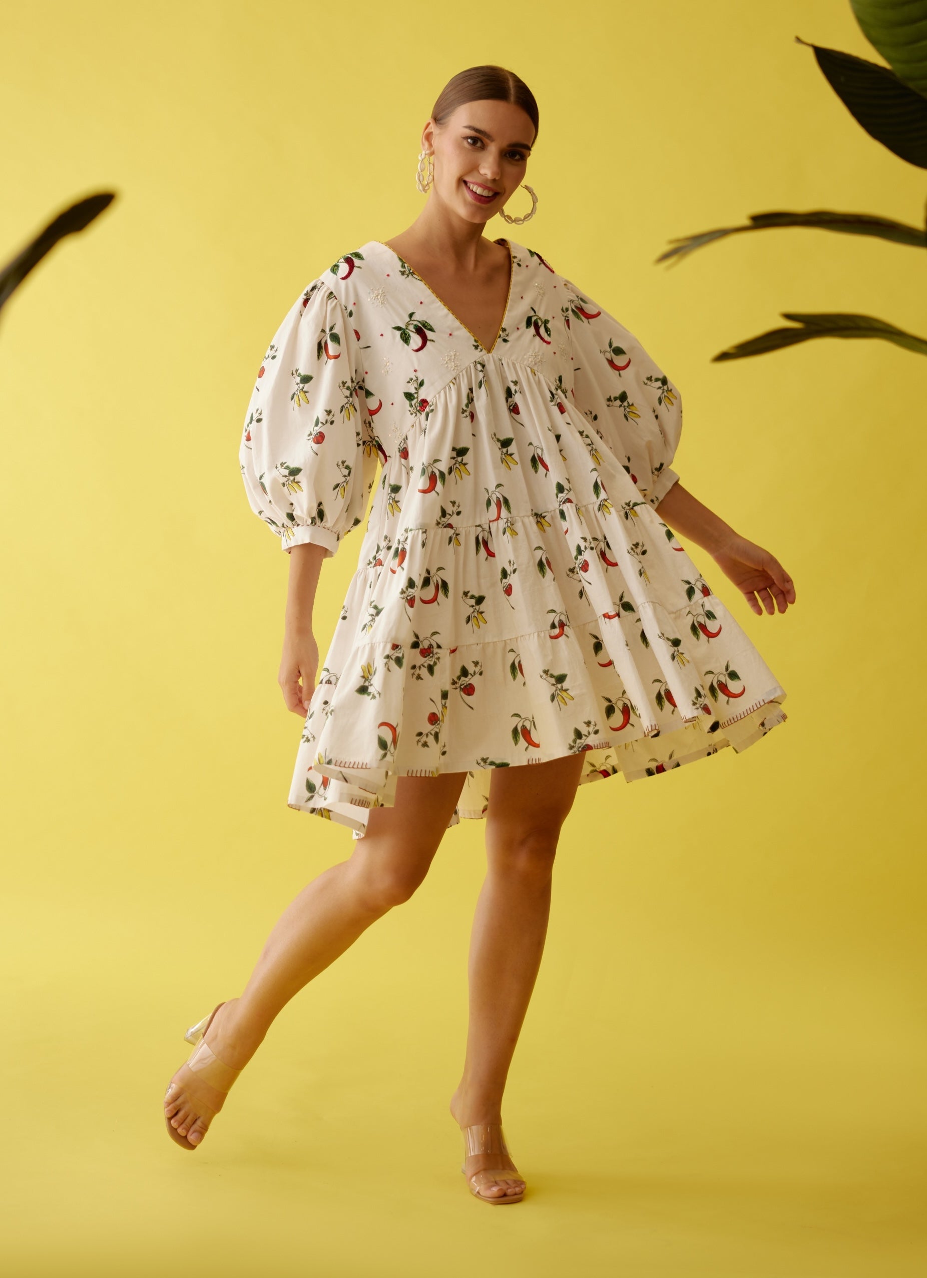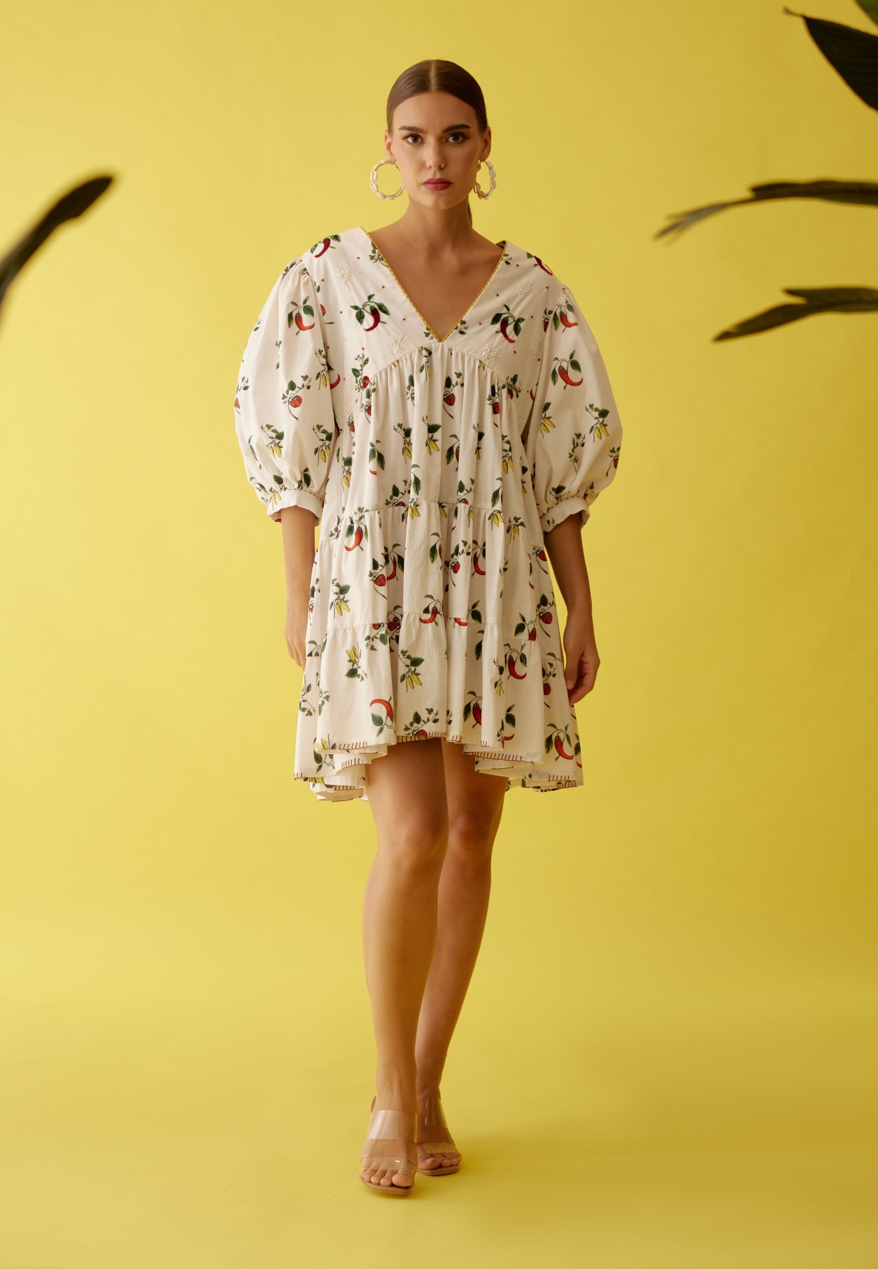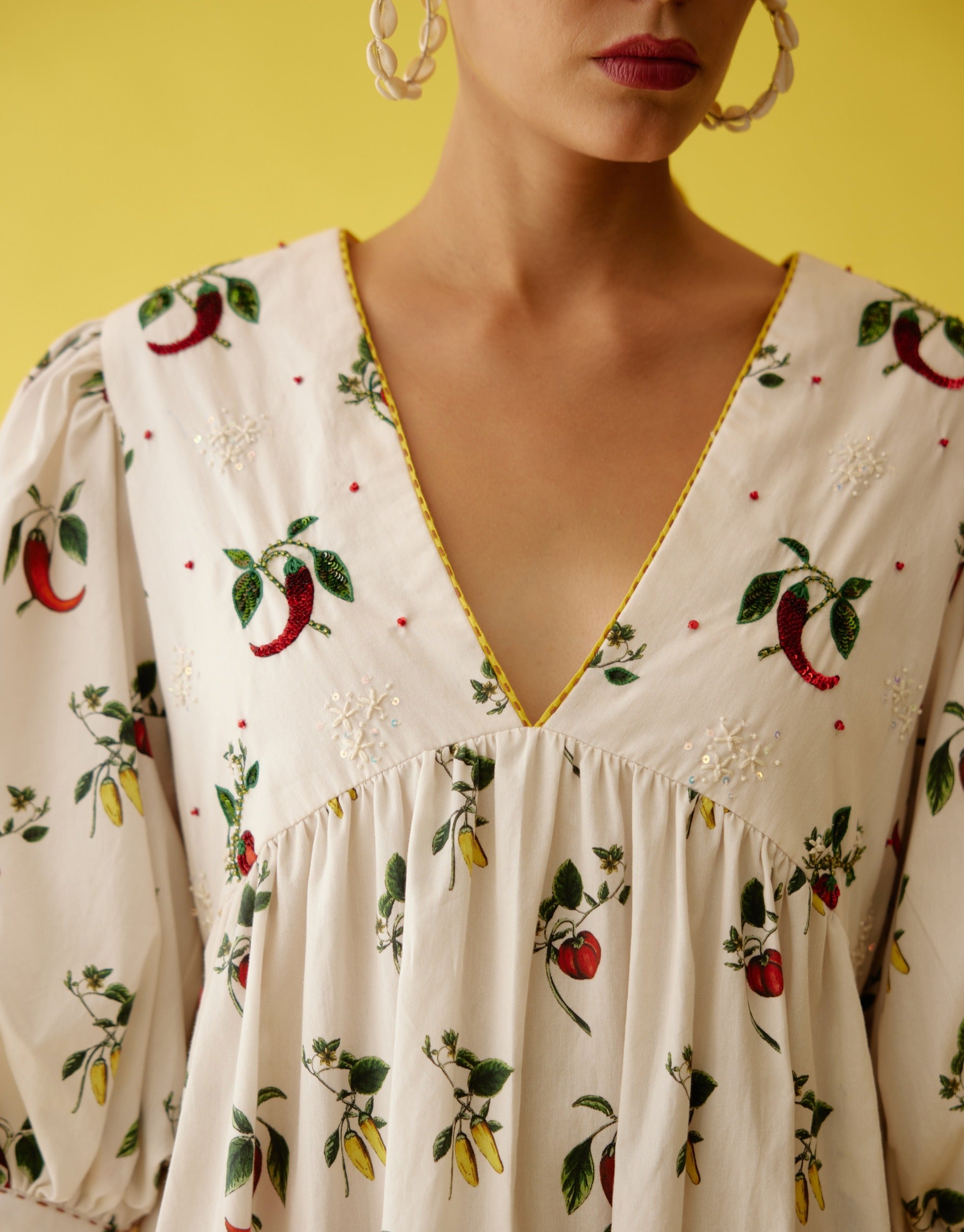 Unveil timeless elegance with our off-white tiered dress, featuring a vibrant hand-painted chili print and dramatic bubble sleeves. This stunning dress is adorned with hand-embroidered chillies highlighted with sequins and thread on the yoke, adding a touch of artisanal sophistication. Crafted from 100% cotton, it includes meticulously hand-stitched details at the bottom, ensuring both style and comfort. Perfect for making a statement at any occasion, this dress seamlessly blends unique artistic elements with classic design for a look that’s effortlessly chic.
