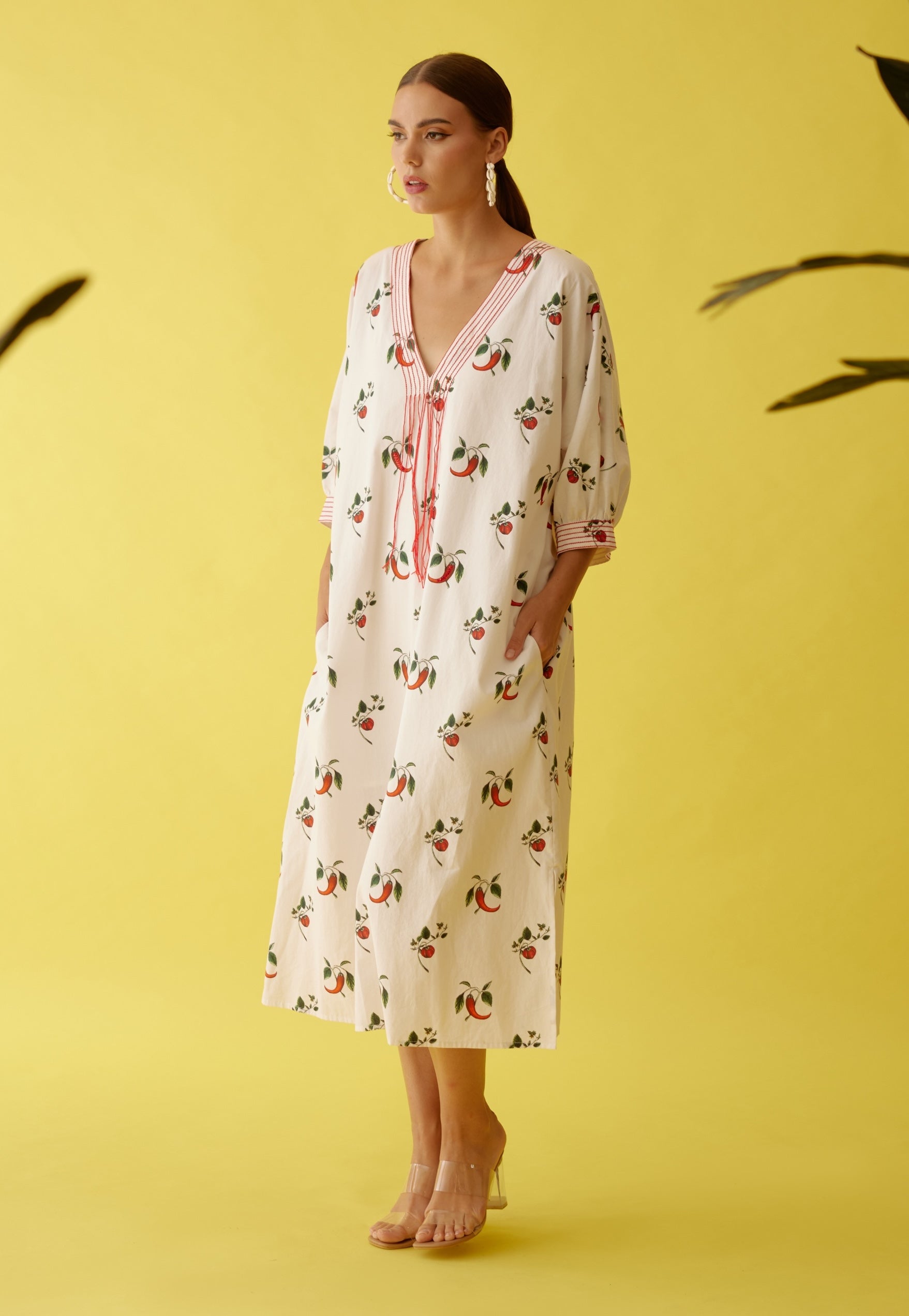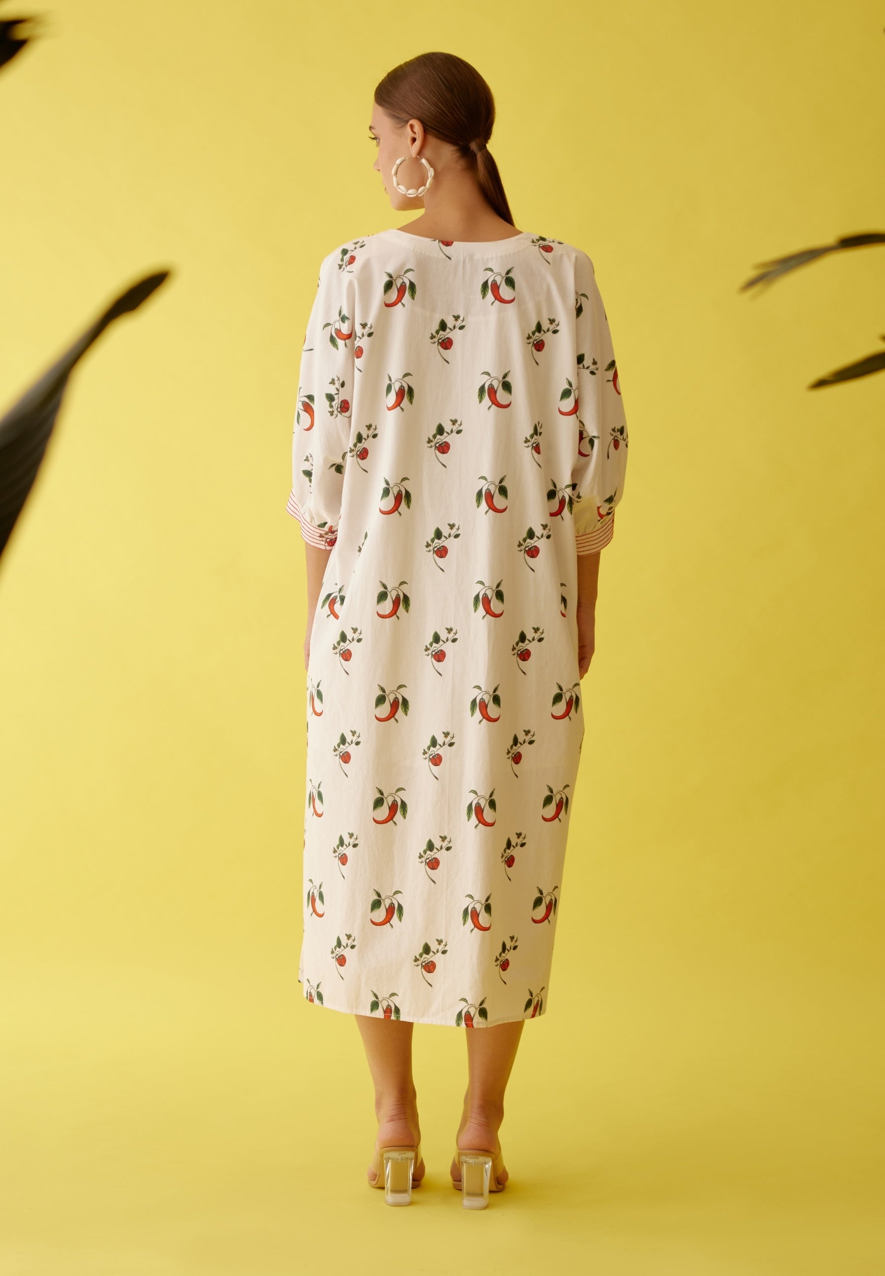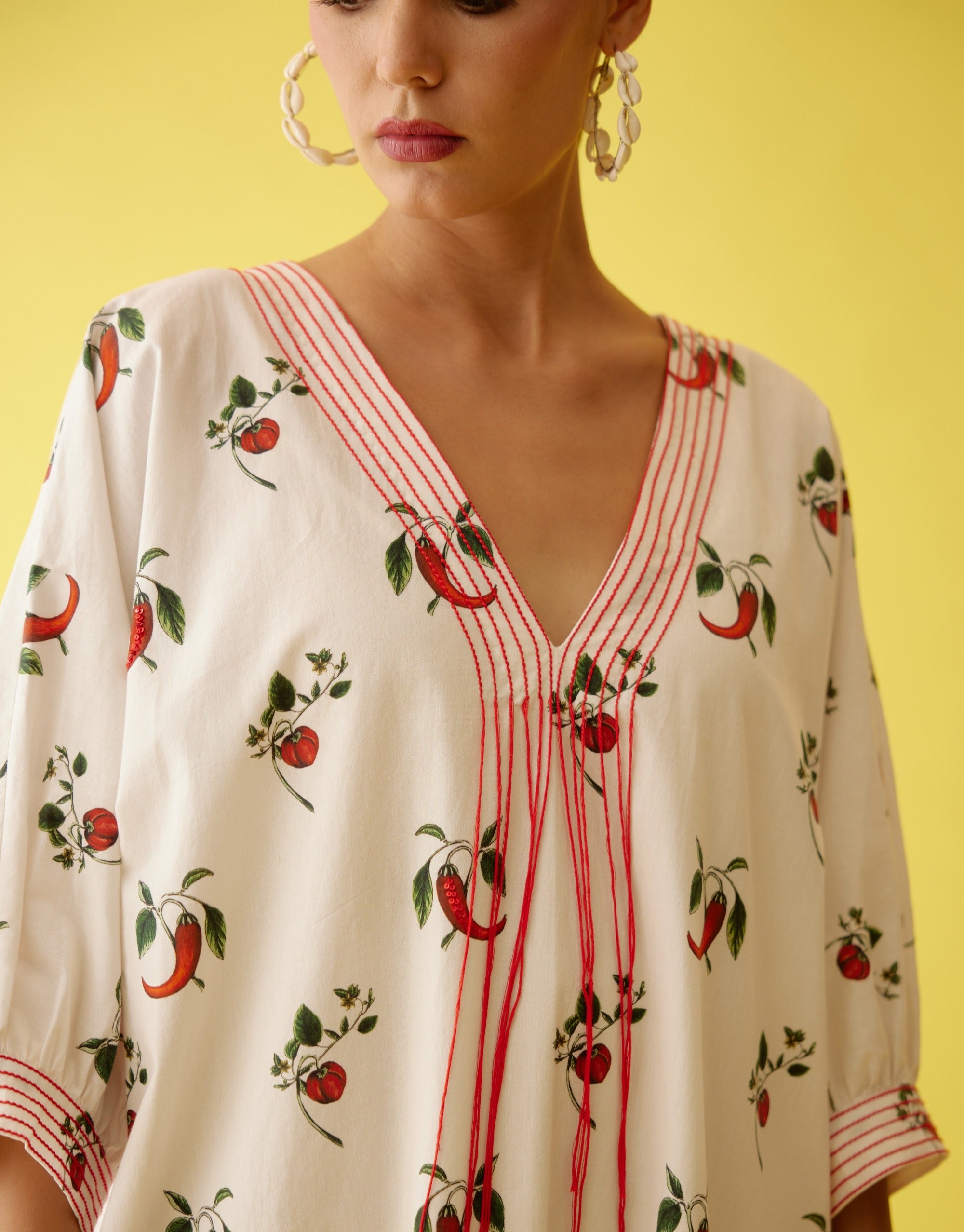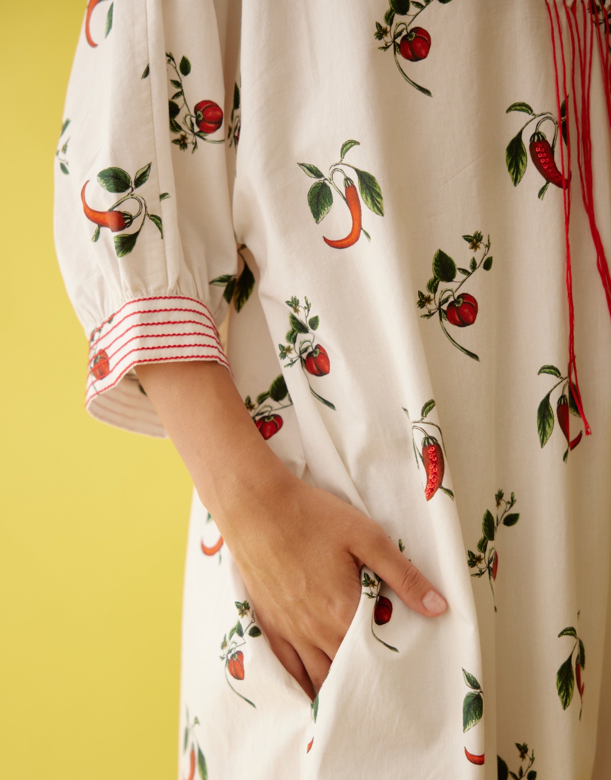 Elevate your style with our off-white midi dress, featuring a vibrant hand-painted chili print and intricate thread fringe detailing along the neckline. Made from high-quality cotton, this dress combines comfort with artistic flair, offering a unique and stylish look. The hand-painted chili print adds a playful touch, while the thread fringe detailing enhances its sophisticated charm. Perfect for a range of occasions, this midi dress effortlessly blends contemporary design with classic elegance, making it a standout piece in any wardrobe.