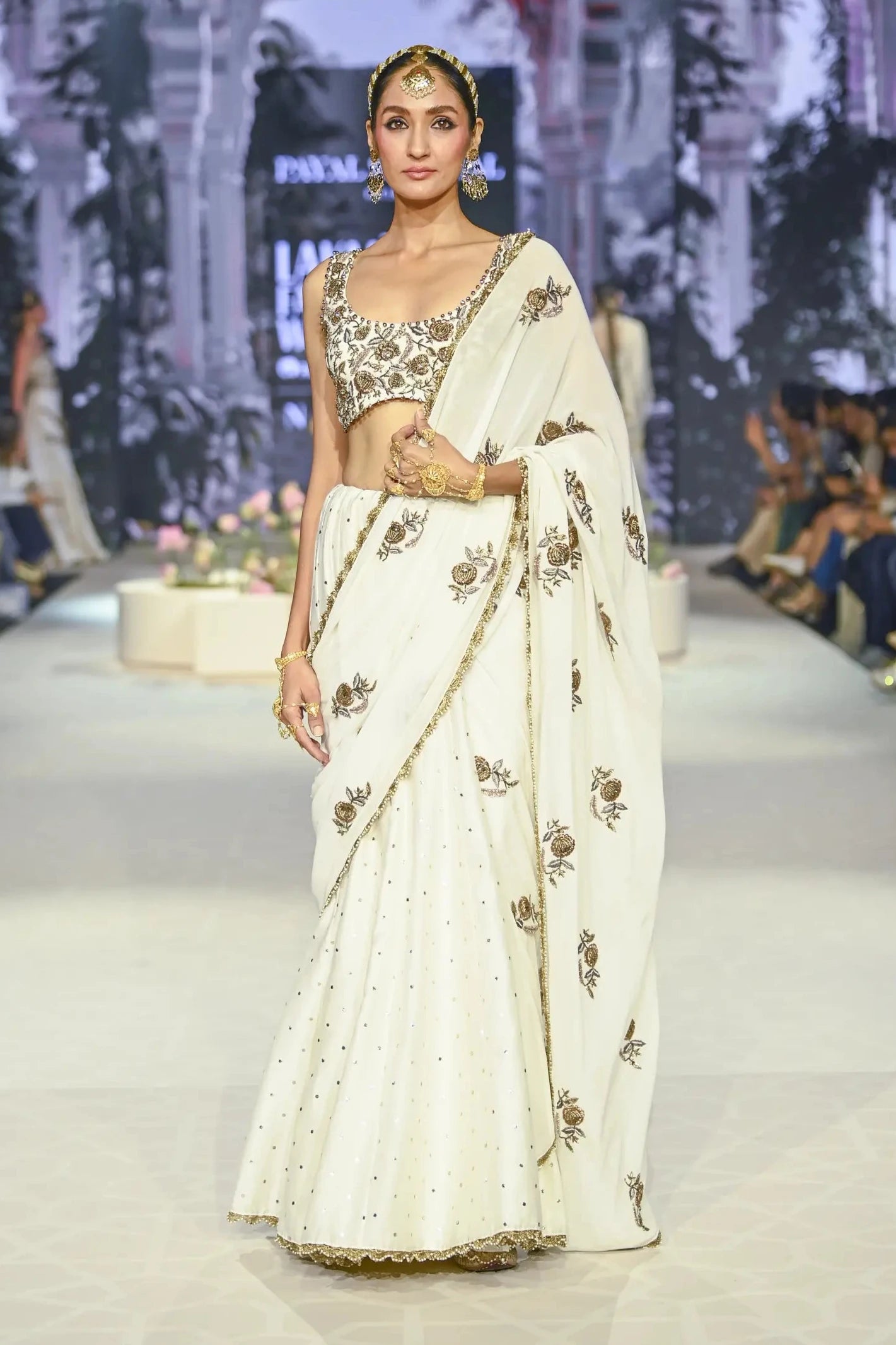 The Najia Off-White Choli paired with a beautifully embroidered saree offers a sophisticated and timeless look. The intricately embroidered choli complements the elegant saree, which drapes gracefully to create a flattering silhouette. Perfect for weddings, festivals, or any traditional celebration, this ensemble combines classic charm with intricate craftsmanship for a statement-making outfit.