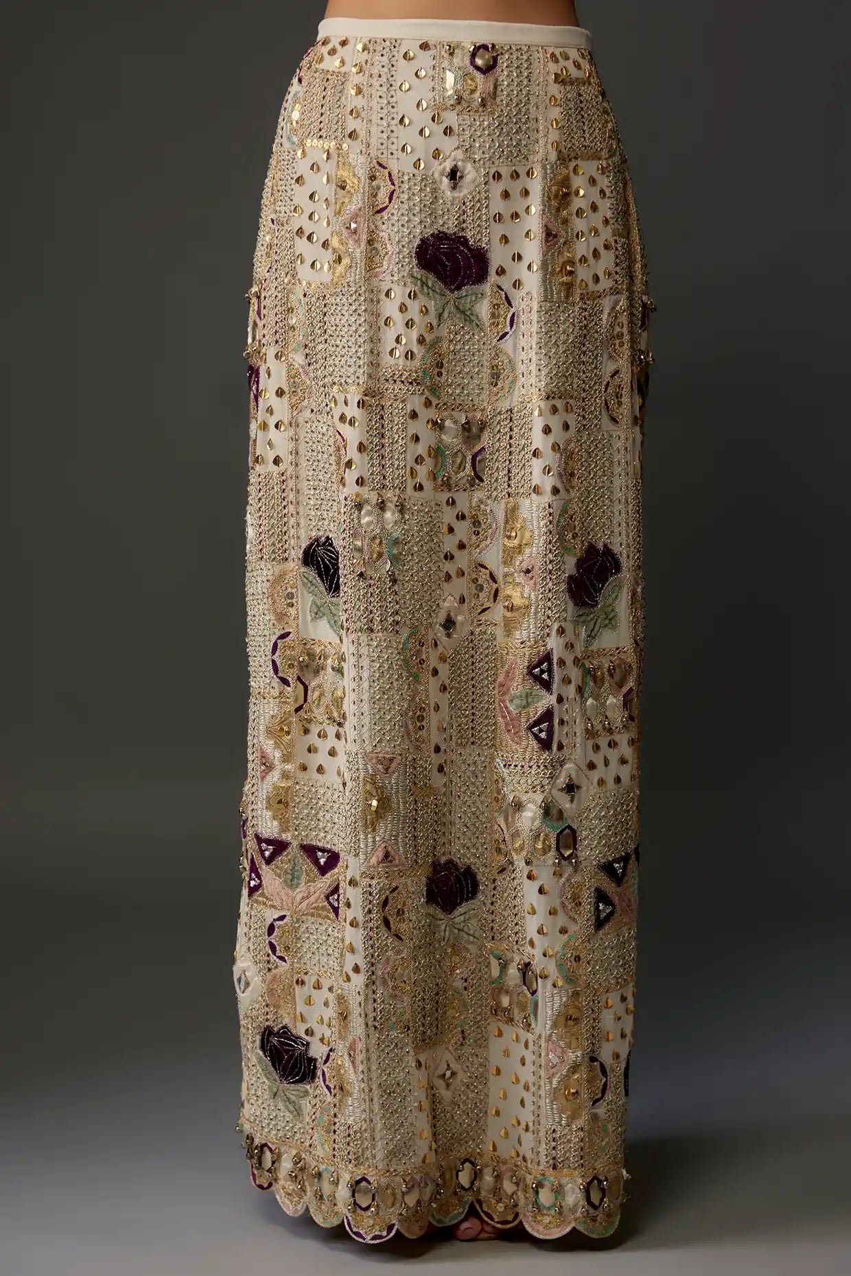 Embrace timeless elegance with this off-white georgette embroidered choli, beautifully complemented by an intricately embroidered skirt and a mukaish organza dupatta. The delicate embroidery on the choli and skirt adds a sophisticated touch, while the lightweight dupatta drapes gracefully, enhancing the overall look. Perfect for festive celebrations or special occasions, this ensemble effortlessly blends traditional charm with contemporary style, ensuring you shine with grace and poise.