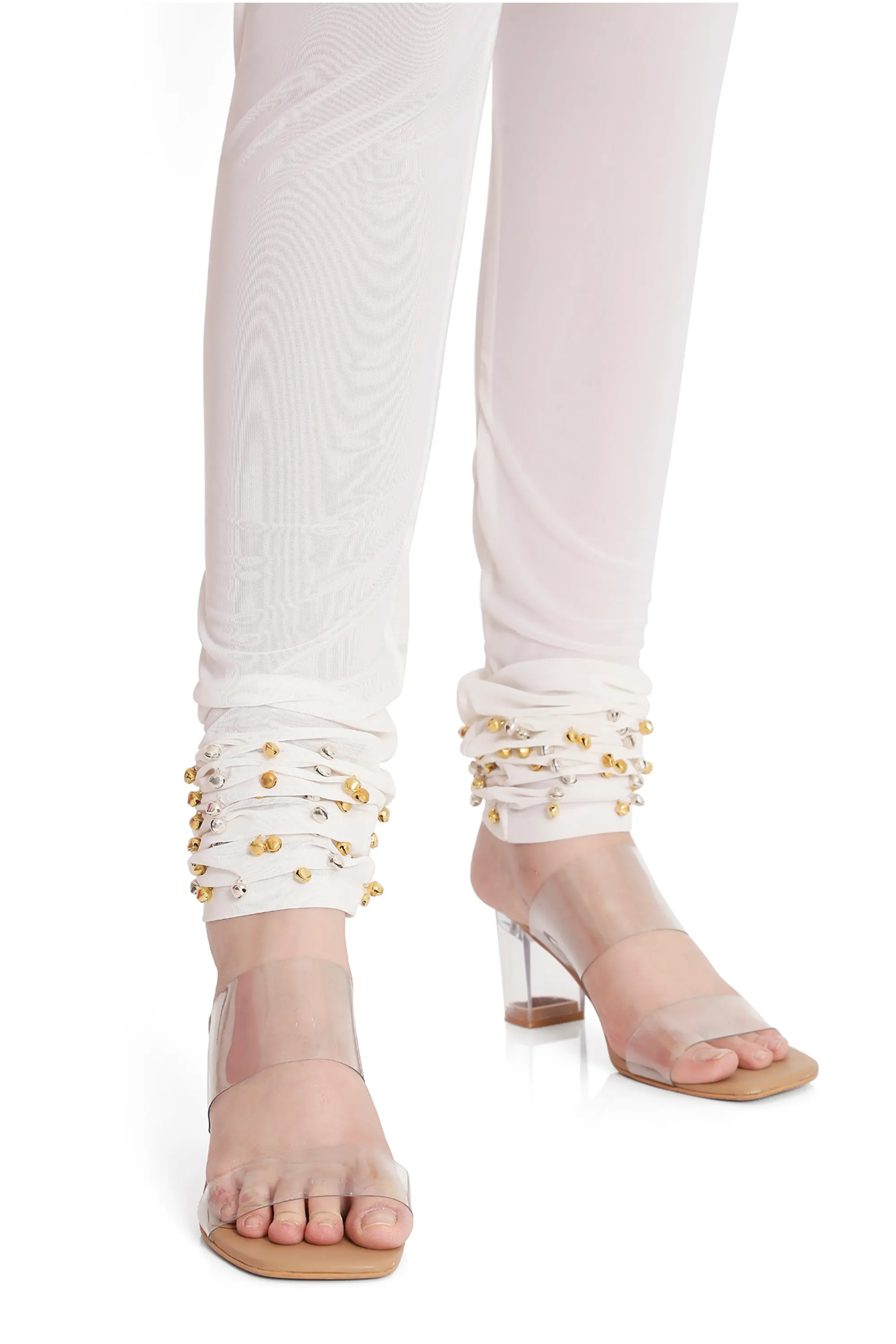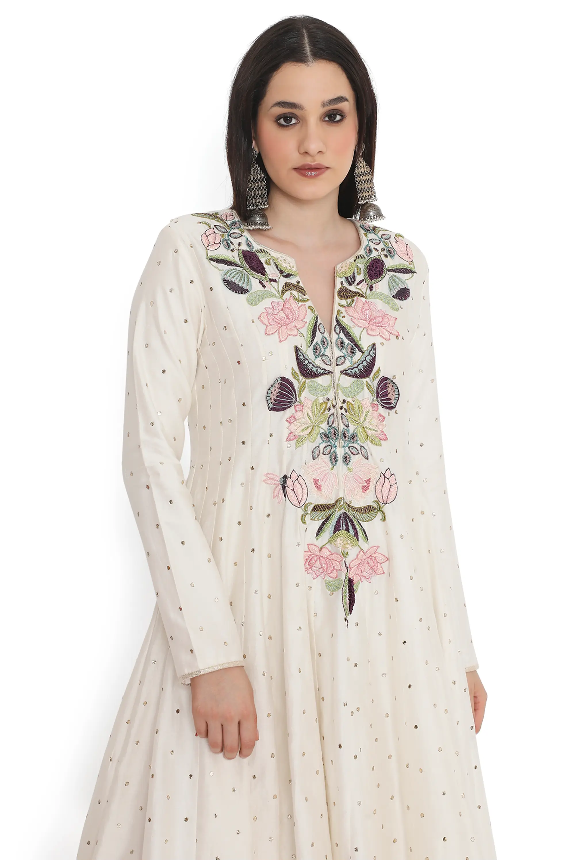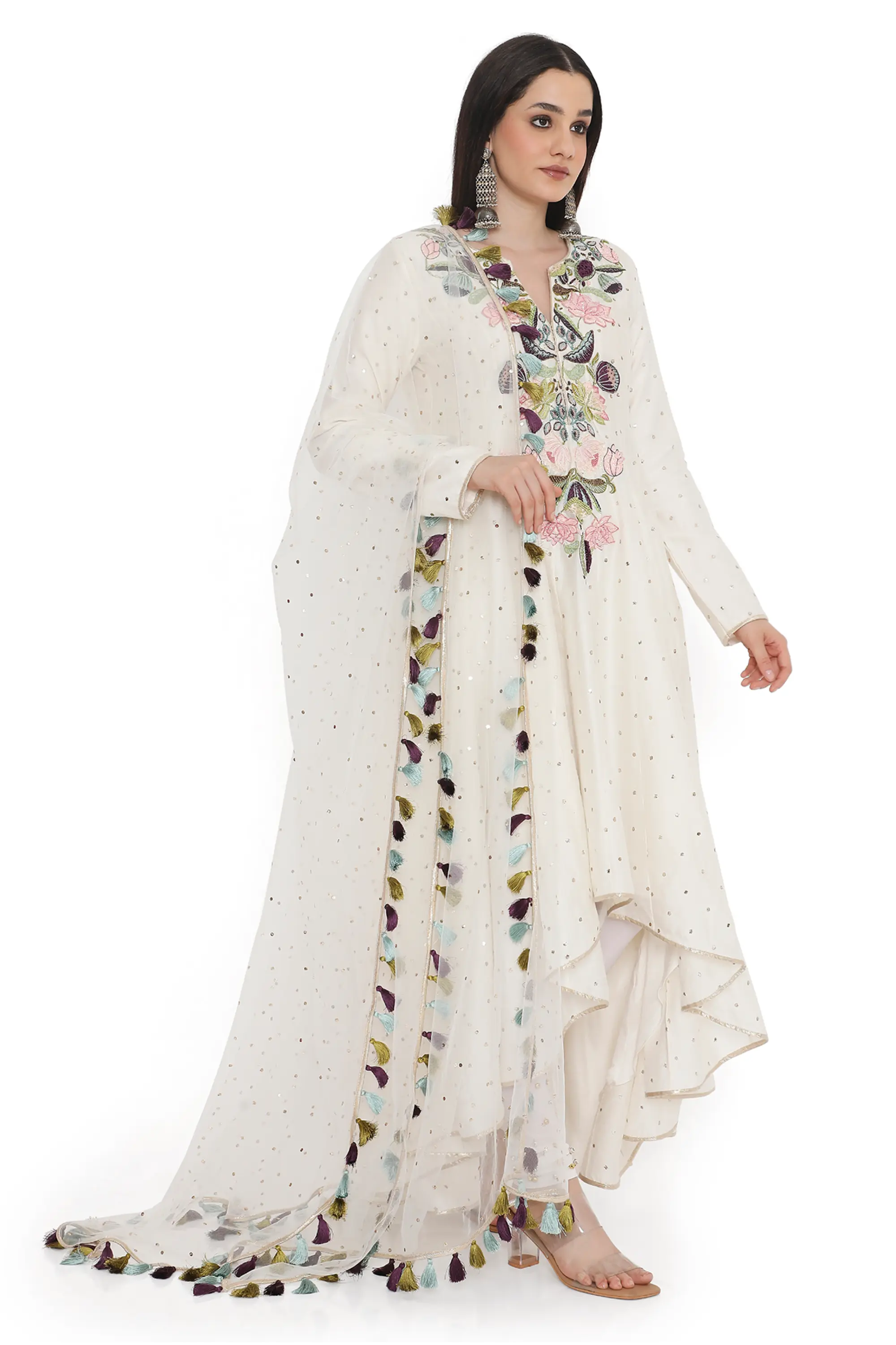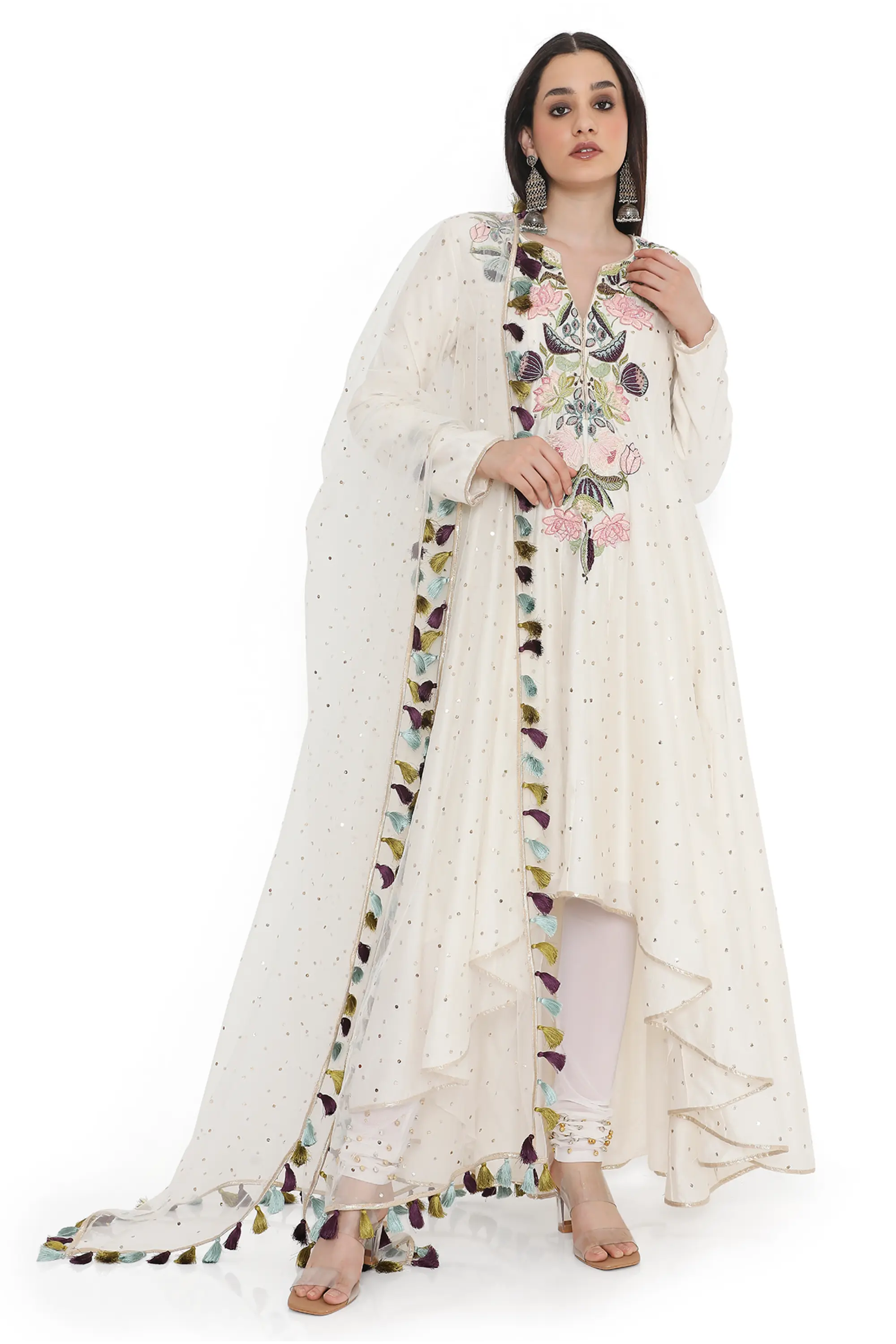 Off-white embroidered high-low anarkali with churidar and a dupatta
