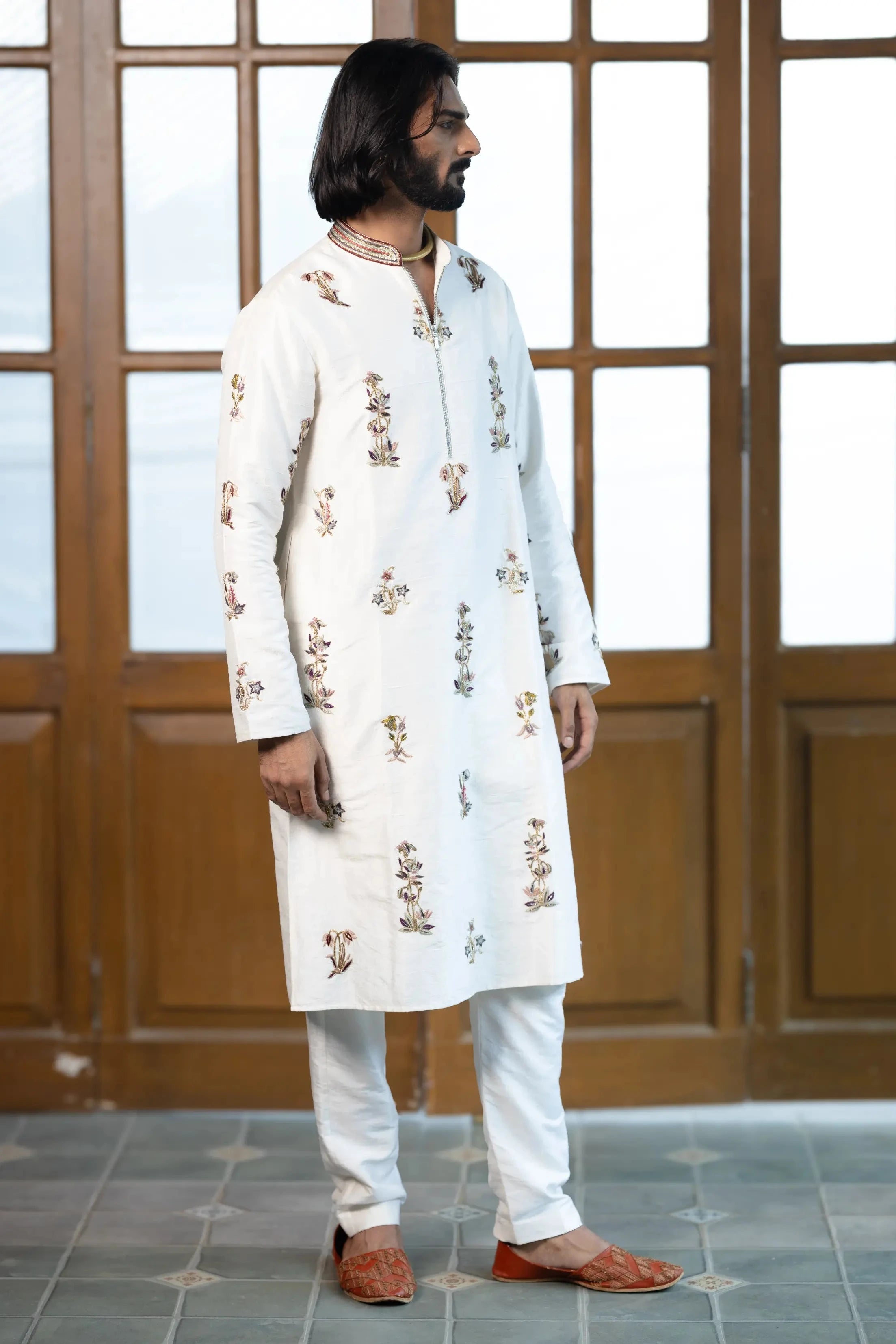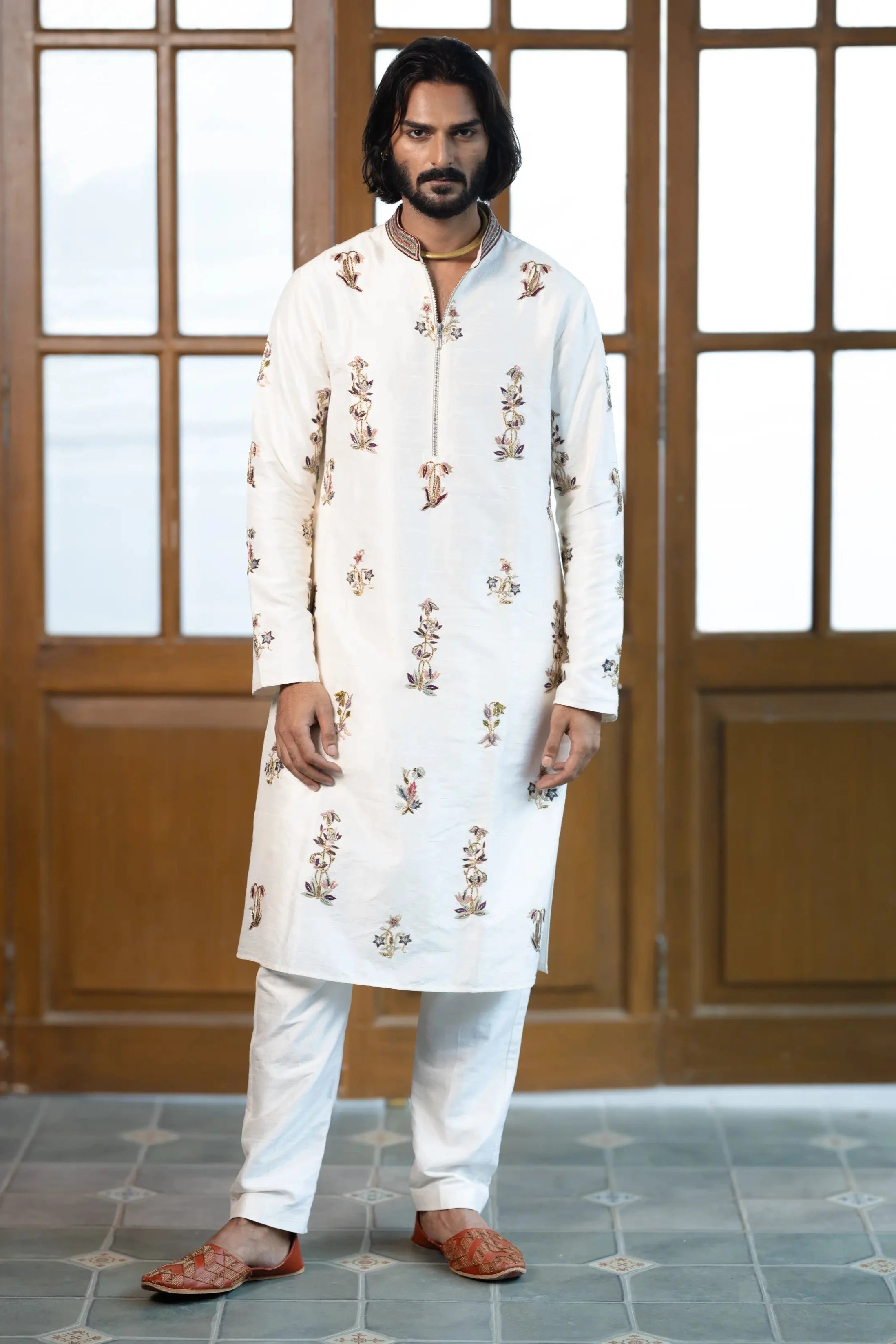 The Off White Embroidered Kurta paired with a sleek pant offers a refined and sophisticated look. The delicate embroidery on the kurta adds a touch of elegance, while the tailored pant provides a flattering, modern fit. This versatile set is perfect for weddings, festivals, or formal gatherings, combining traditional craftsmanship with contemporary style.