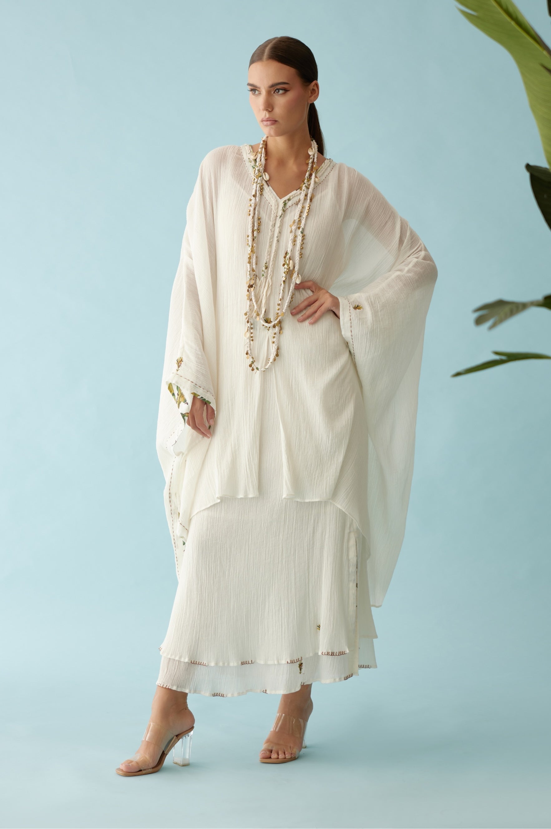 Elevate your style with our off-white kaftan, featuring hand-braided tassels around the neckline and a charming banana tree appliqué. Crafted from breathable crinkle cotton, this kaftan offers both comfort and elegance, perfect for a range of occasions. The matching straight skirt enhances the ensemble, creating a cohesive and sophisticated look. The kaftan’s unique design elements and artisanal details blend seamlessly with the relaxed silhouette, ensuring a stylish and refined appearance.