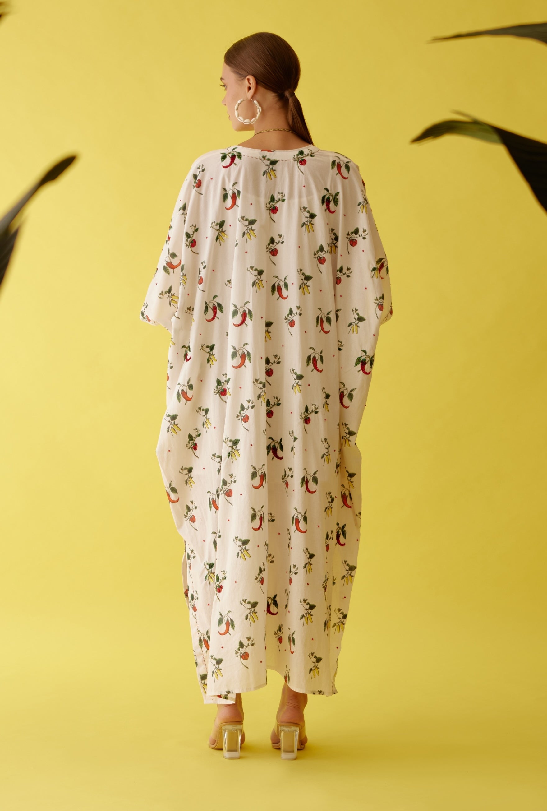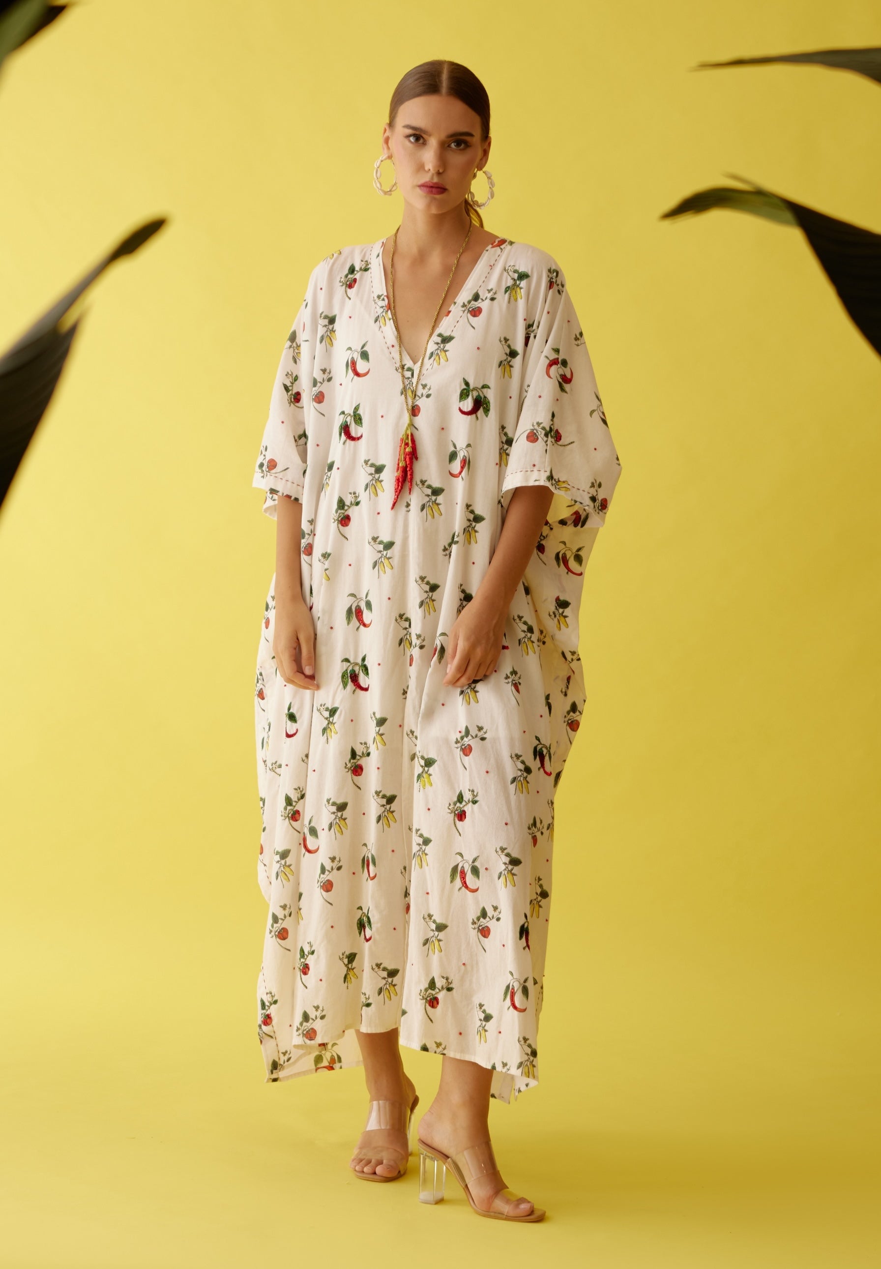 Elevate your wardrobe with our off-white kaftan, featuring a distinctive hand-painted chili print and exquisite hand embroidery. The chillies are beautifully highlighted with sequins and thread, adding a touch of artisanal sophistication. Made from premium cotton, this kaftan combines comfort with unique style, making it perfect for both casual outings and special occasions. Embrace effortless elegance and vibrant artistry with this beautifully crafted kaftan that seamlessly blends traditional craftsmanship with contemporary flair.