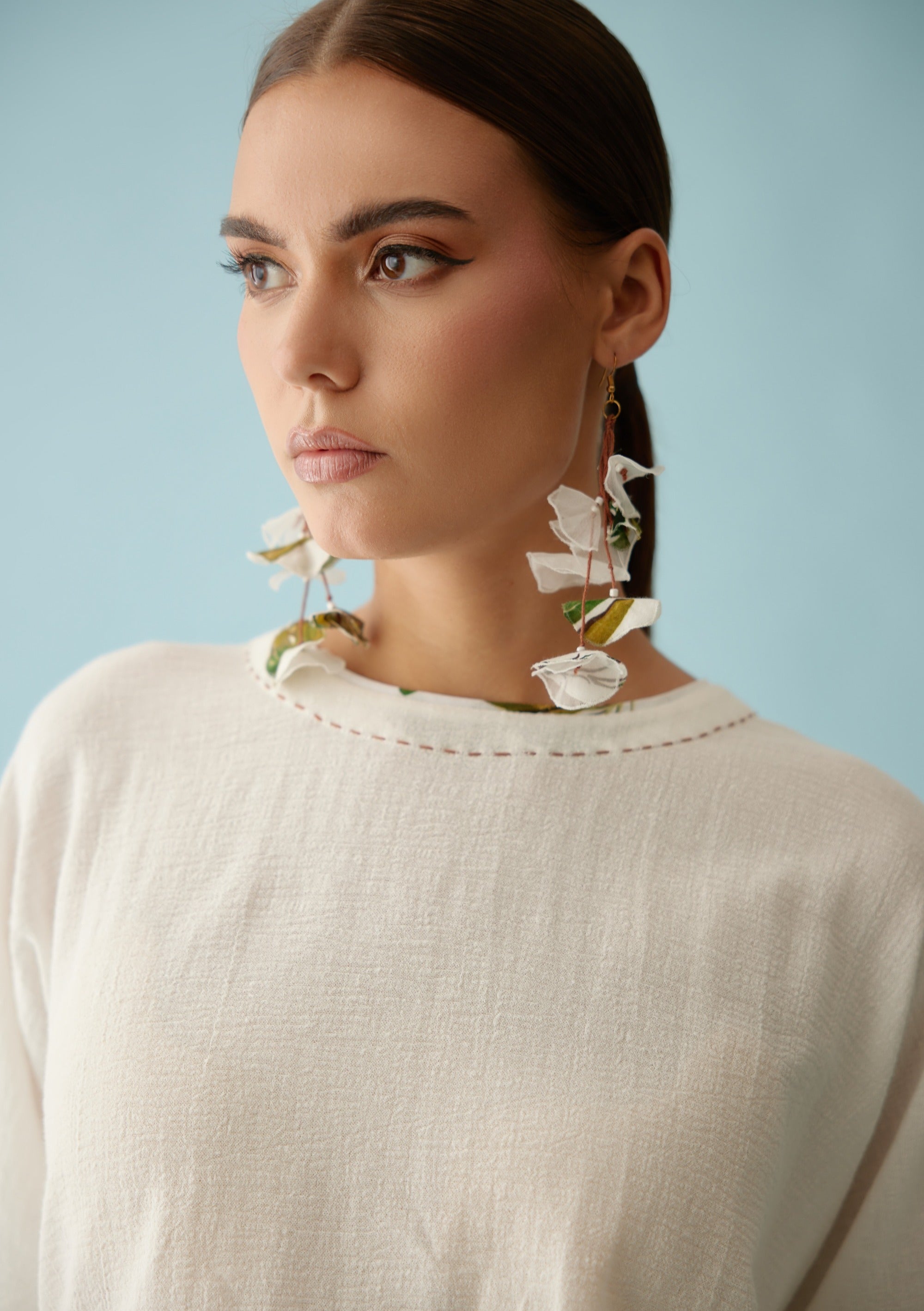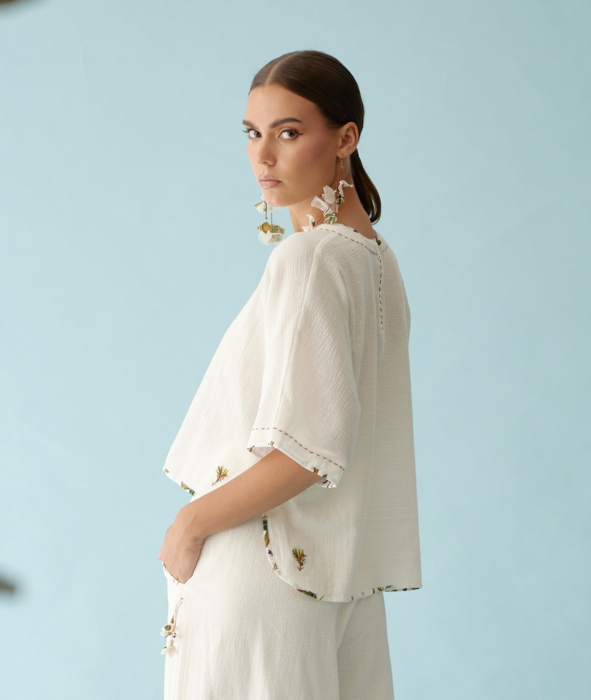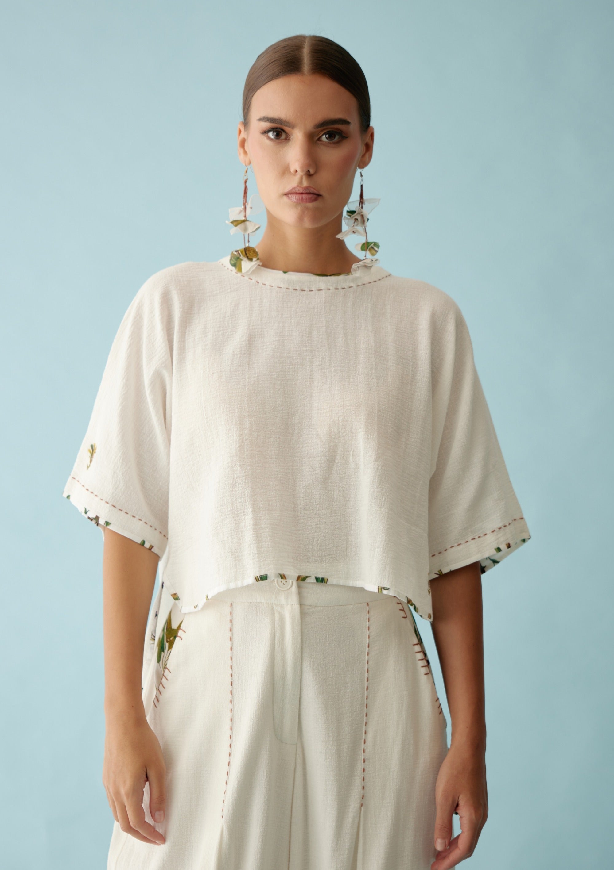 Refresh your wardrobe with our off-white hi-low crop top, featuring a vibrant banana tree appliqué and intricate hand-stitched details. Made from premium cotton, this top offers both comfort and a stylish silhouette. The hi-low hemline adds a modern twist, while the playful banana tree appliqué and artisanal hand-stitching bring a unique touch to your outfit. Perfect for adding a chic, casual element to your look, this crop top seamlessly blends contemporary design with elegant craftsmanship.