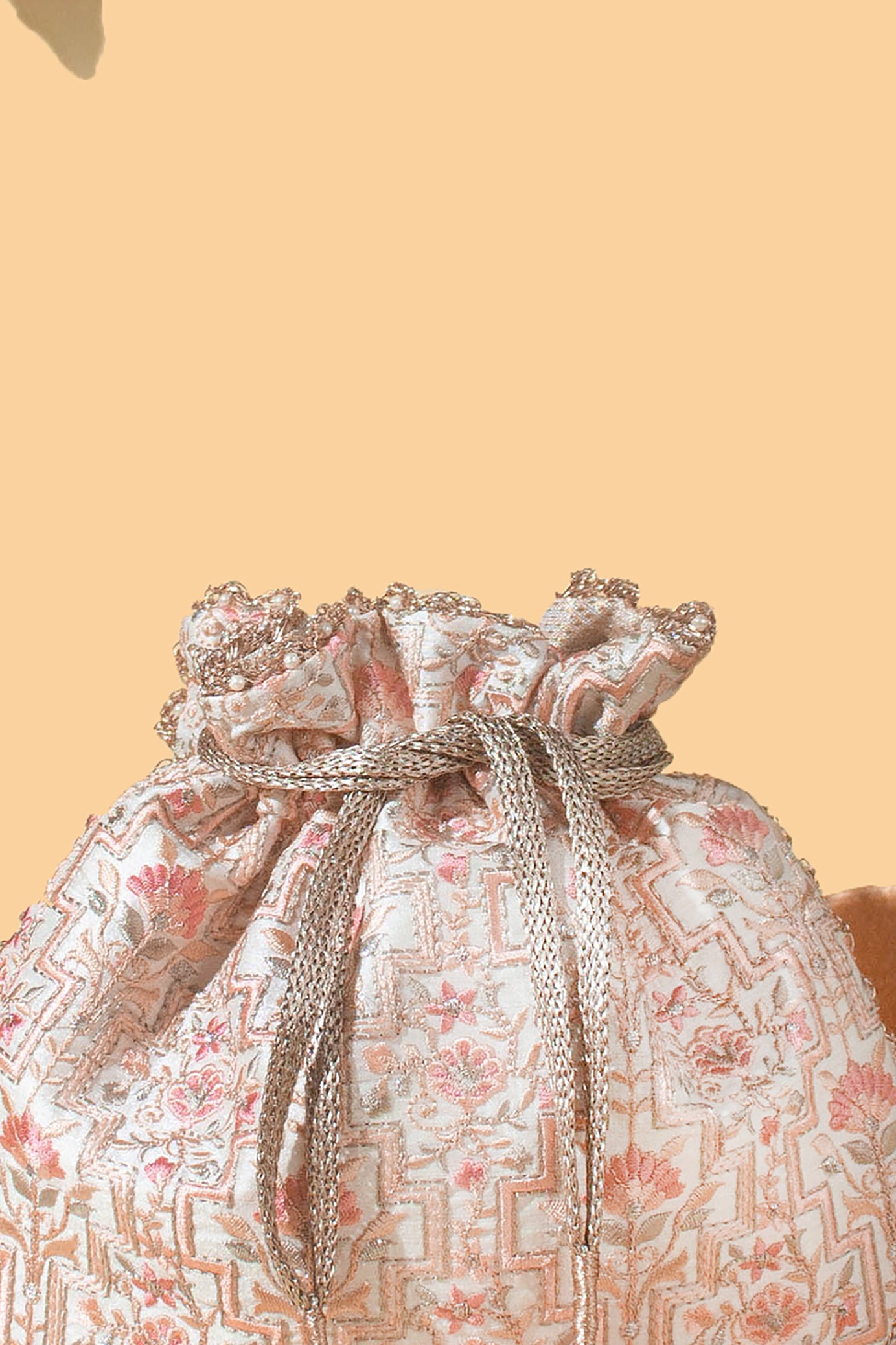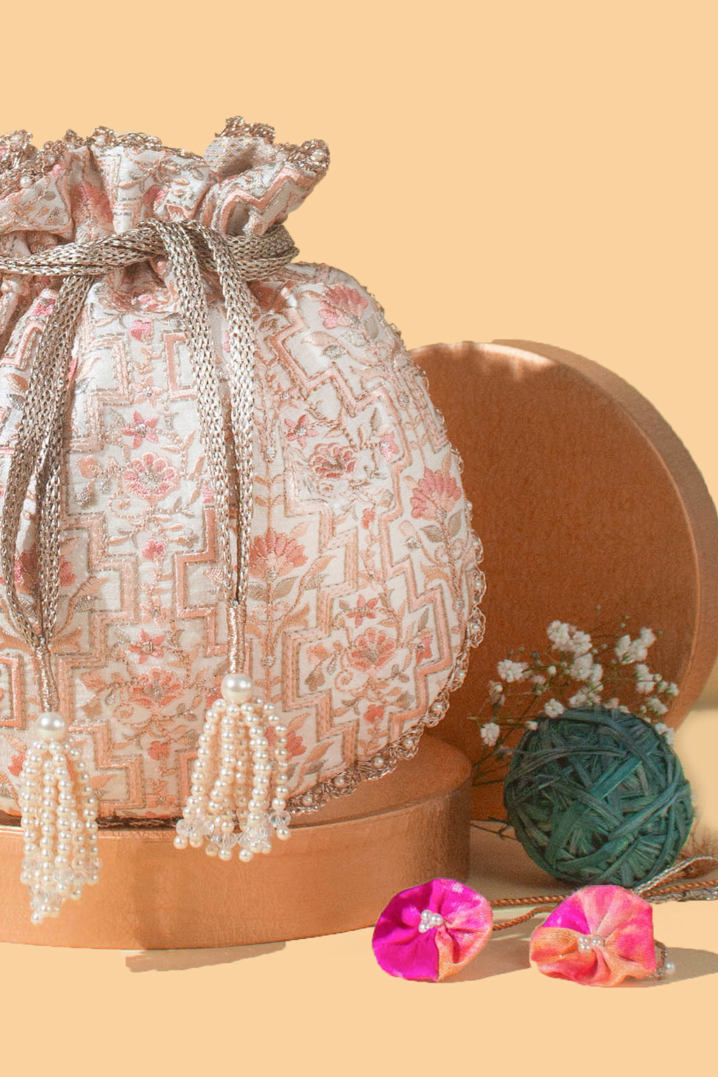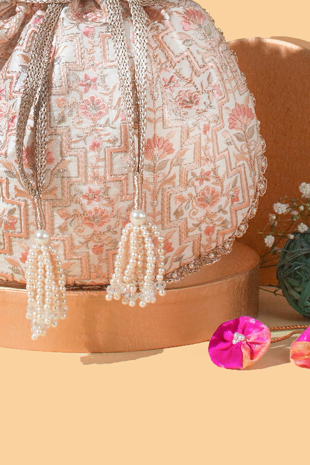 Crafted with meticulous attention to detail, our Mogra Potli showcases exquisite embroidery in enchanting hues of pink and off-white. A true testament to artisanal craftsmanship, every stitch is delicately woven into intricate patterns that exude opulence. Finished with playful white beaded tassels, this elegant potli adds a graceful charm to any traditional or Indo-Western ensemble.